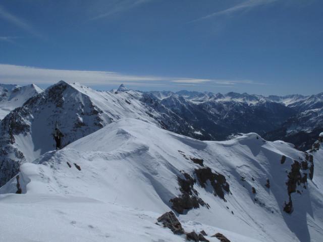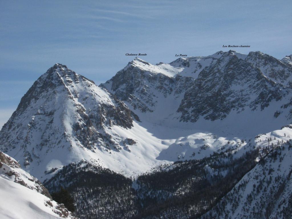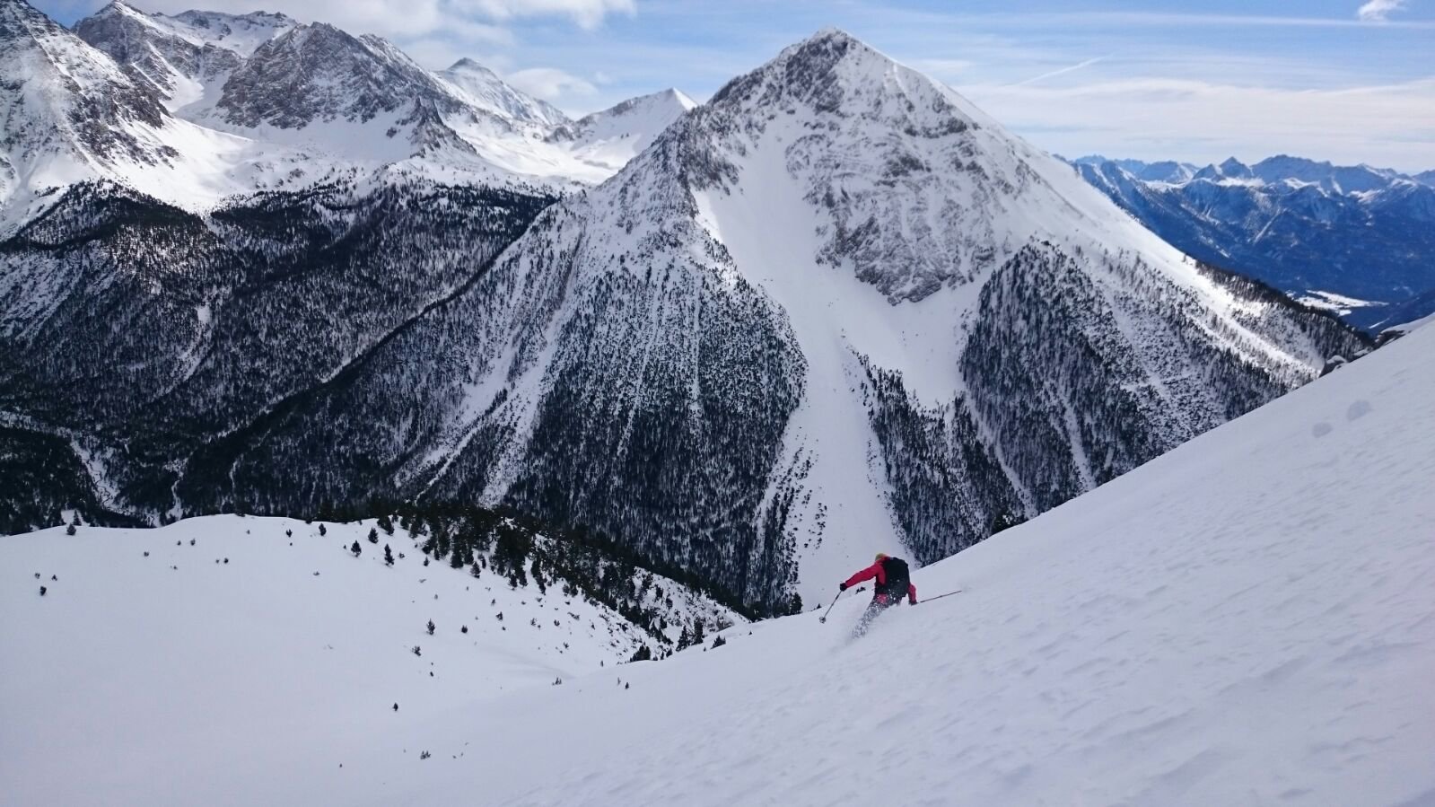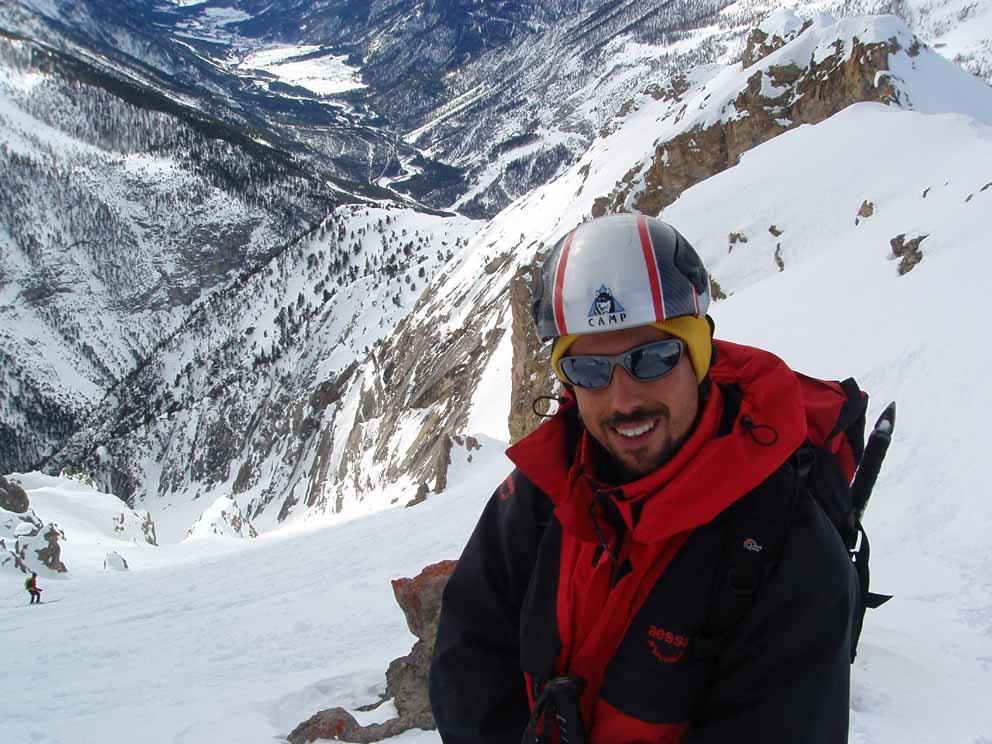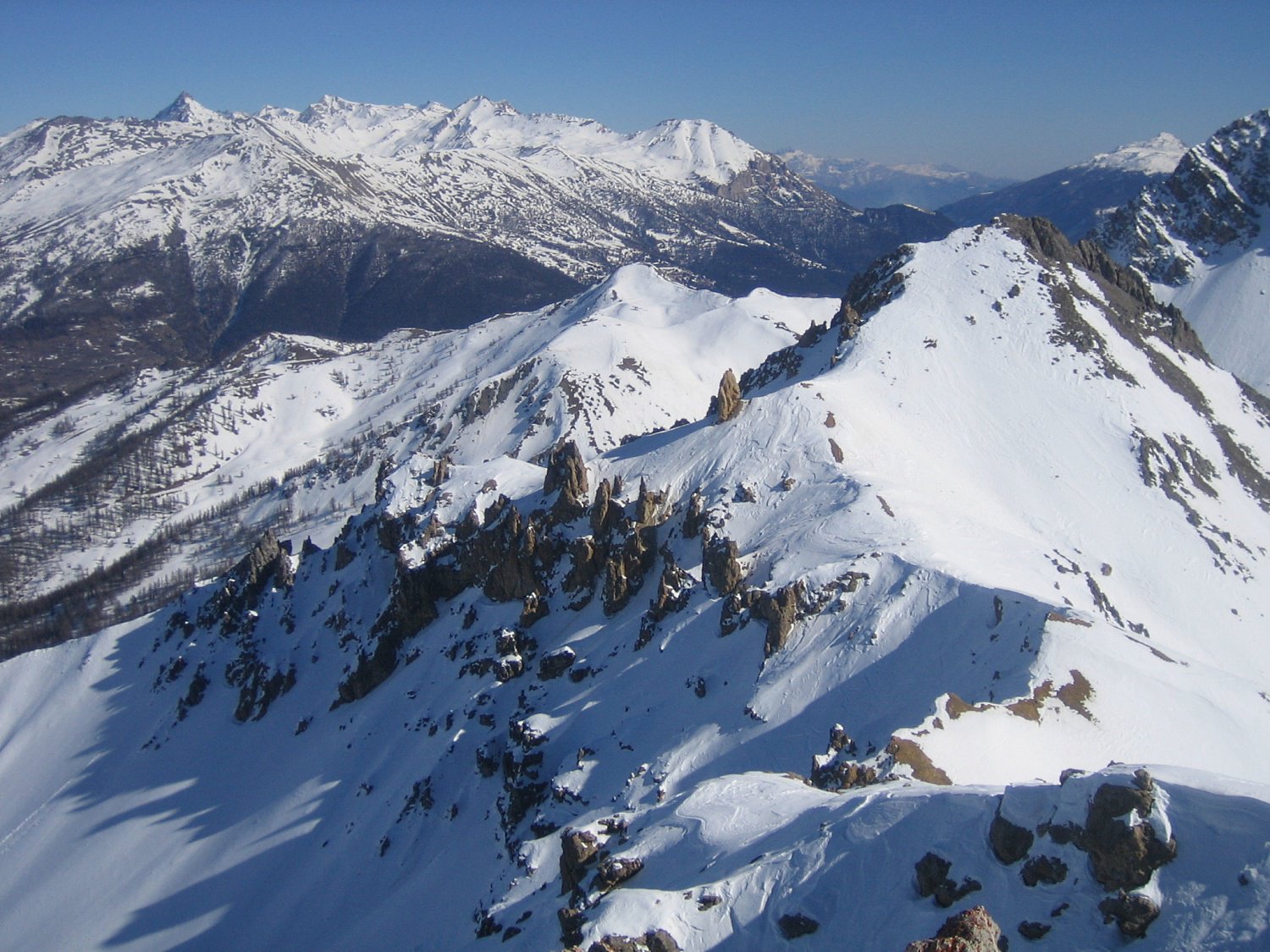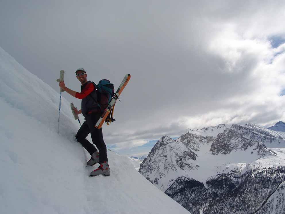 Proseguire per l’ultimo ampio pendio a 35° fino all’uscita del canale, sulla cresta a breve distanza dalla vetta.