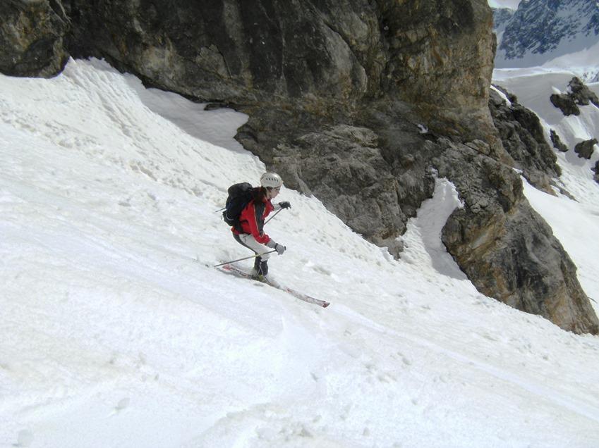Ravin di lusso. Sci dall’auto su stradina sempre innevata, risalita faticosa per mancanza traccia e caldo… come sempre nel Ravin. La neve è ancora abbondante, ma le pietre iniziano ad affiorare. I passaggi precedenti hanno lisciato una linea su neve vecchia che ormai non si molla più del giusto, permettendo anche la sciata non proprio mattiniera, anzi meglio tardare un po. Risultato moquette da cima a fondo senza neanche le gobbe dei passaggi precedenti, pietre evidenti da evitare e gran sciata sul velluto.Fuori dalla “pista” neve un po pesante e fonda, ma sempre sciabile . Oggi poca gente, tre francesi in tutto. Molti invece nelle gite del vallone, ottimamente innevato, allego foto della Pecè, che però mi dicevano in neve dura nel basso.Oggi altra iniziazione al ripido.