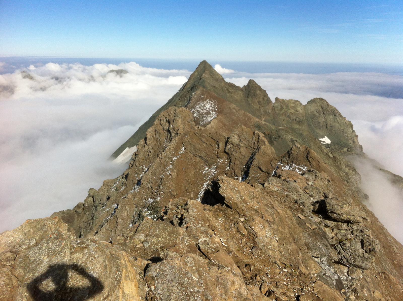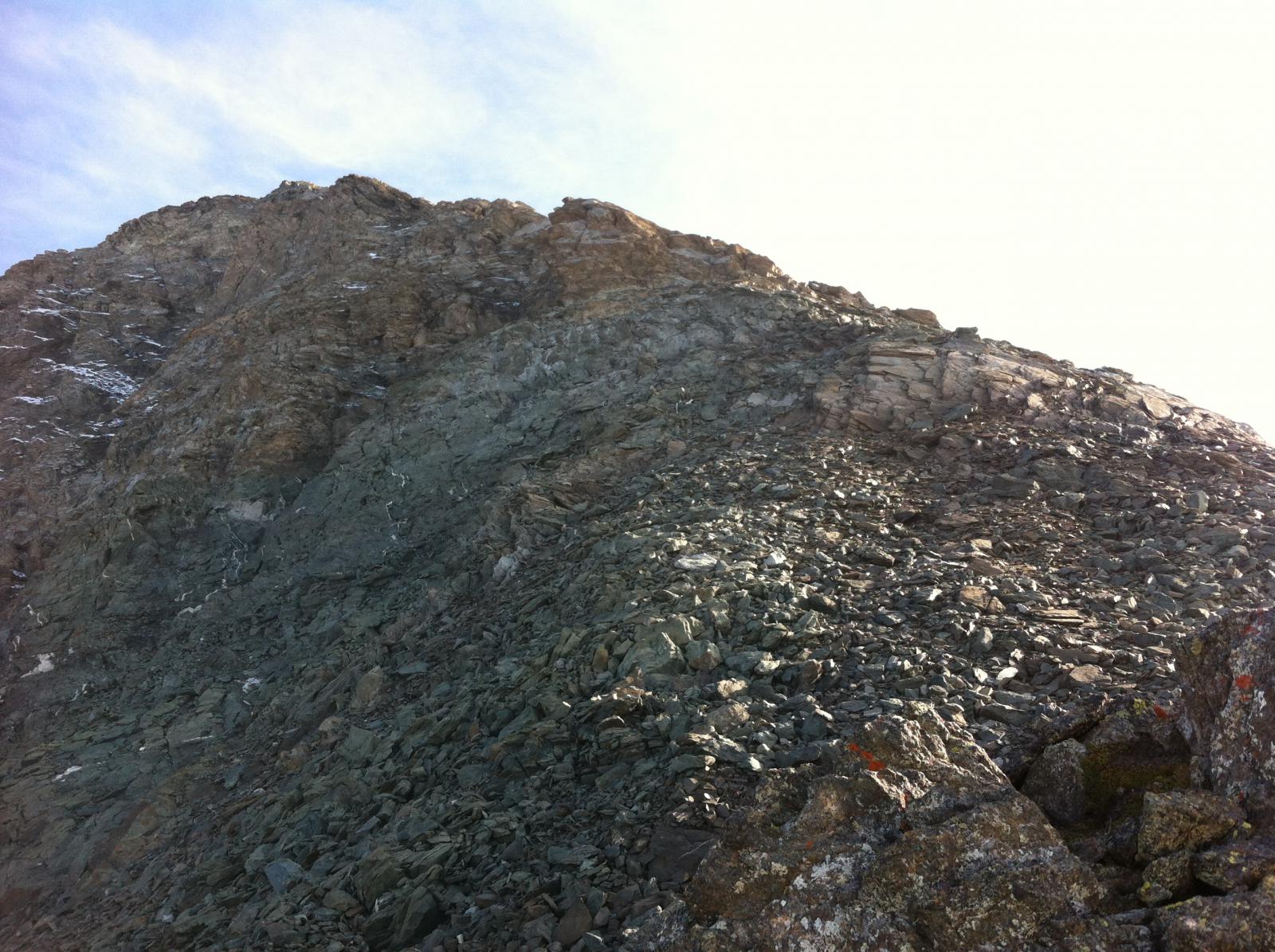 Il primo salto, subito sopra il colle, se superato direttamente, obbliga a qualche passaggio di arrampicata un po’ più impegnativo,ma lo si può superare senza problemi per sfaciumi sul versante Cibrario. Di qui basta seguire la cresta tenendosi il più possibile vicini al filo