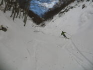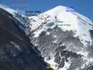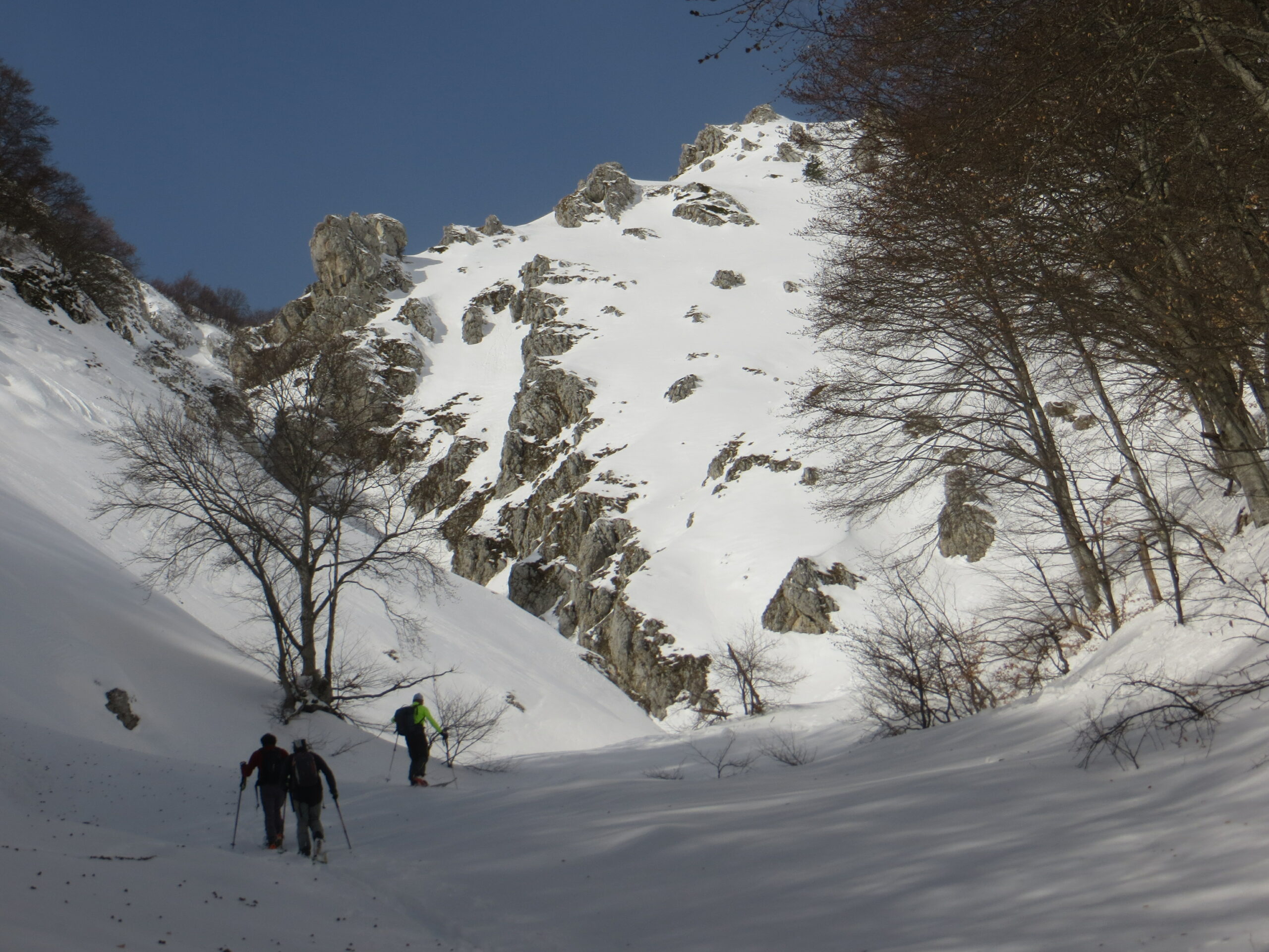 - Variante ancora più impegnativa (per cui è necessaria neve molto abbondante): dalla piana a quota 1421 si continua dritti un pò verso sx nel letto principale della forra. Si raggiunge un salto molto marcato (insuperabile in estate). Se ripieno di neve (appunto con innevamento molto abbondante) si supera con ramponi ai piedi e si continua a seguire il Vallone ora molto più ampio, ma sempre ripido , fino al Guado della Forchetta (1776m), sotto le pendici del M. Le Mucchia. . Si continua nella parte alta come da relazione.