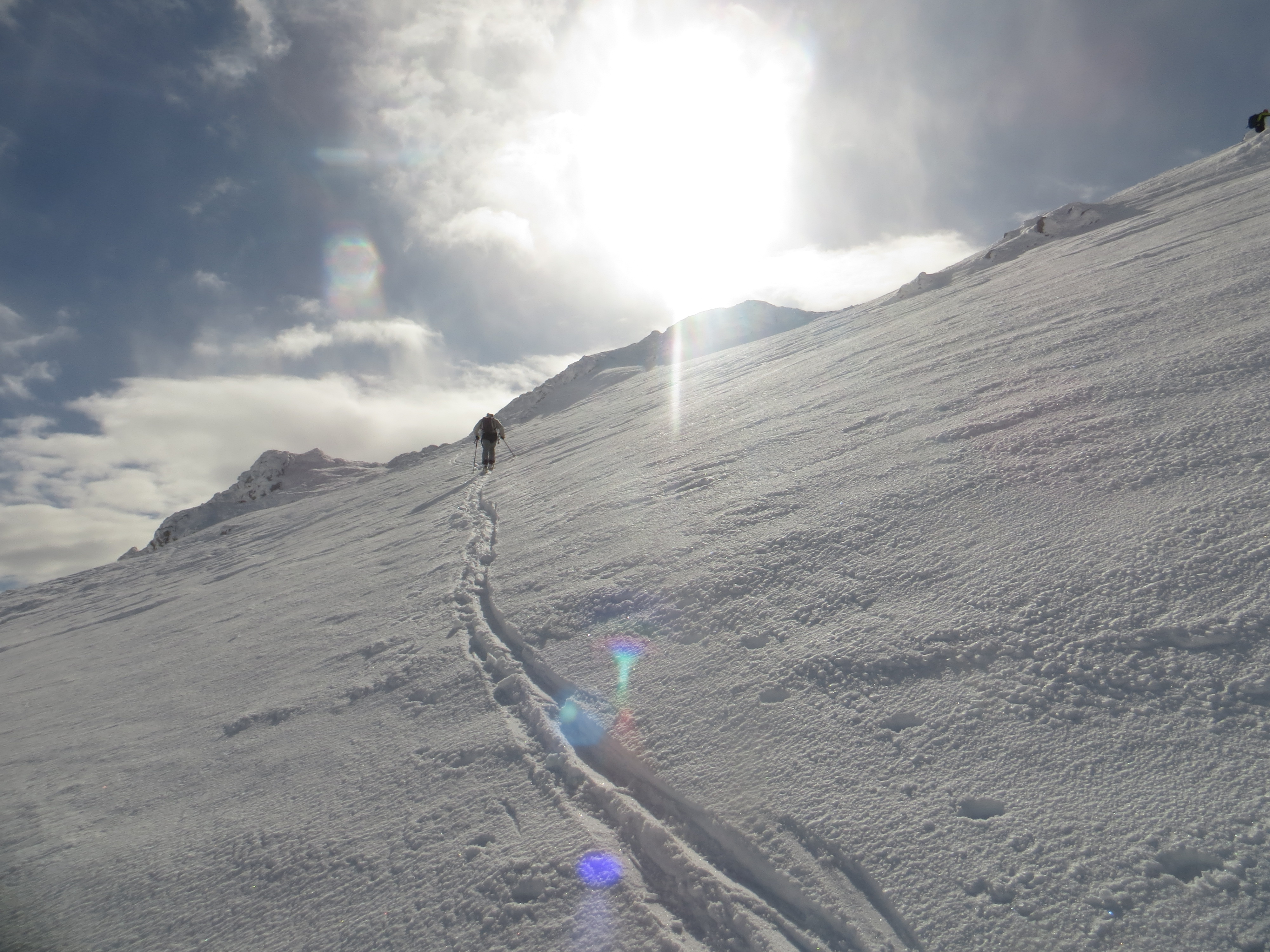 La parte alta dopo il Guado della Forchetta (1776m) è a moderata pendenza. Volendo rendere l'escursione ancora più appetibile sul piano sciistico, conviene salire a dx in direzione Nord al Monte Le Mucchia (1986m).