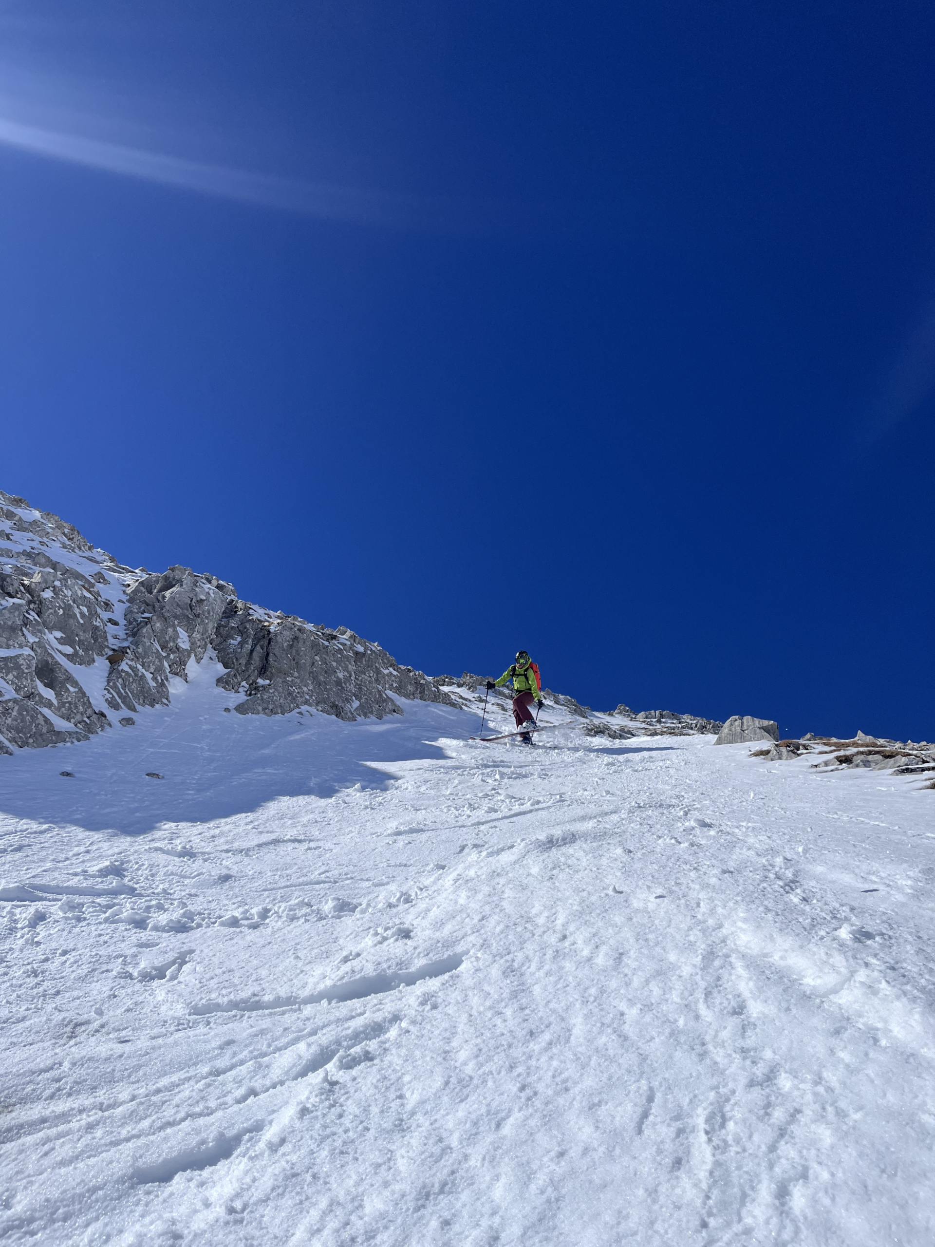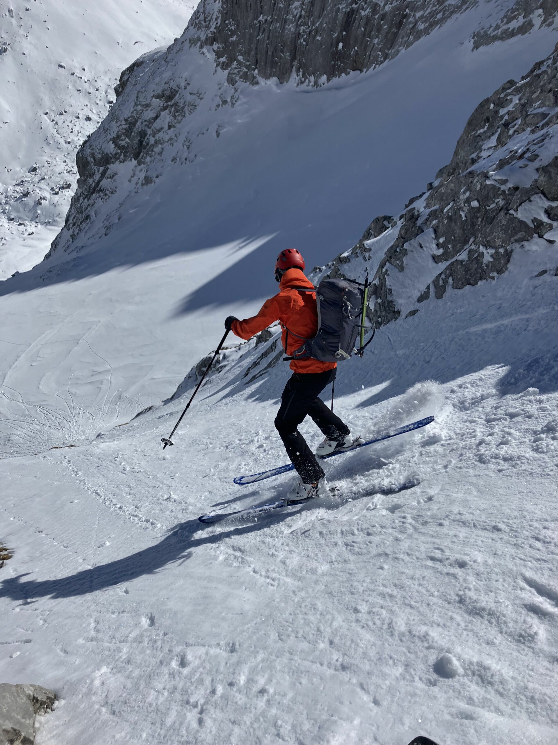 Al momento il canale di accesso ai valloni superiori non è in condizioni per essere sciato, ma c’è abbastanza neve per essere salito con gli sci sullo zaino. Utili i ramponi soprattutto se ci si arriva la mattina abbastanza presto quando, come oggi, la neve era ancora un po’ dura. Itinerario classico della zona e abbastanza frequentato, con noi oggi almeno un’altra decina di persone. Tuttavia, per qualche strana ragione, tutte le tracce di discesa si snodavano attorno alla traccia di salita, e tanti pendii ai lati erano ancora tutti da sciare. Uno molto bello lo si prende scendendo con un traverso a destra a quota 2700. Non una singola traccia!! Un altro lo si vede invece, salendo, una volta usciti dal canalino di accesso, guardando sulla sinistra. Anche qui non una singola traccia.. discesa su ottimo firn, conclusa con birra Calanda alla berghaus Alpenrosli.
