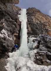 Come per “I Droc”. Si supera il free-standing e la successiva facile seconda lunghezza. Dalla sosta 2 a chiodi, si va a destra, scalando uno strapiombino di roccia cattiva e il successivo risalto di ghiaccio, seguito da ripido pendio di roccia e neve.