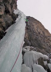 Ci si trova ora ai piedi di un corto sigaro, attualmente scollato e pericoloso (L1 25m). Dalla sosta su ghiaccio parte la seconda difficile lunghezza , free-standing di 25 metri su ghiaccio complesso e fragile e poi altri 25 di muro verticale.