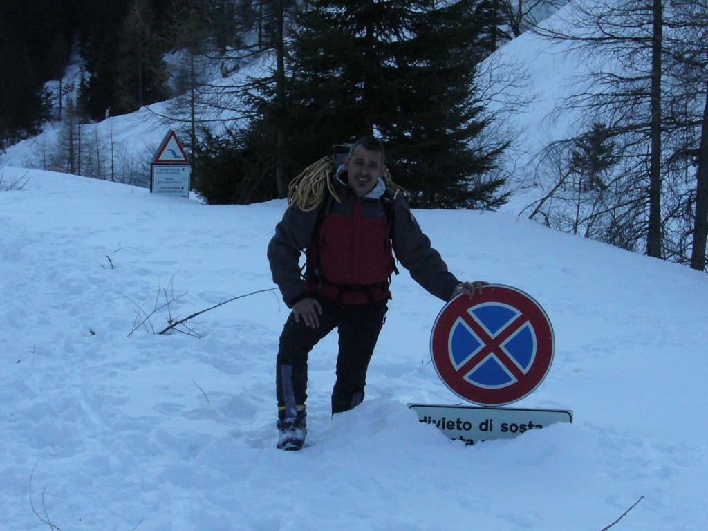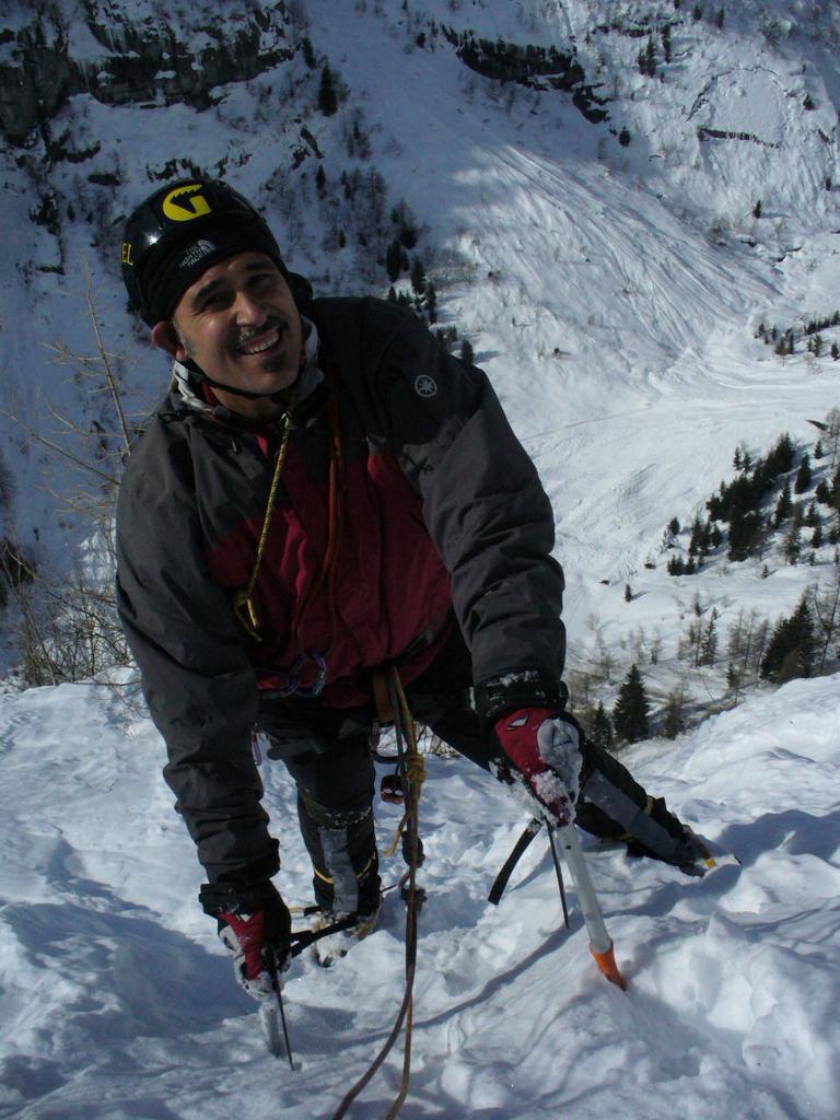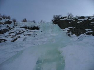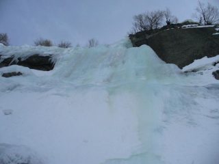 Una quantità enorme di neve sui pendii sommitali, bagnata e pesante ma per fortuna già ben assestata. All’attacco temperatura di poco inferiore allo zero. La cascata è un’unica crosta da rigelo, la molta neve presente ha completamente fatto marcire il ghiaccio sottostante che si presenta come una granita non molto consistente. Le pendenze sono modeste ma la scarsa affidabilità delle viti e la fragilità delle croste su cui si scala rendono la progressione un poco delicata. Il ghiaccio era ben asciutto ma produceva molte lenti alla battuta. Solo sull’ultimo muretto finale il ghiaccio era veramente ottimo e ben chiodabile…per fortuna 🙂 Diciamo che nel complesso è stata una bella avventura più alpinistica che non sportiva. Ultima cosa, l’attacco si può fare molto basso, aggiungendo così due bei tiri da 60 m alla cascata che diventa in totale di ben quasi 300 metri…