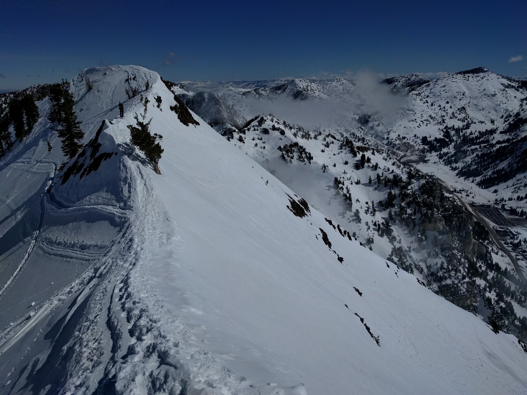 Seguire la cresta Ovest che con alcuni sali e scendi e un paio di passaggi esposti sui ripidi pendii che sovrastano Snowbird. L’ultimo centinaio di metri la cresta si impenna e si continua con gli sci a spalle.