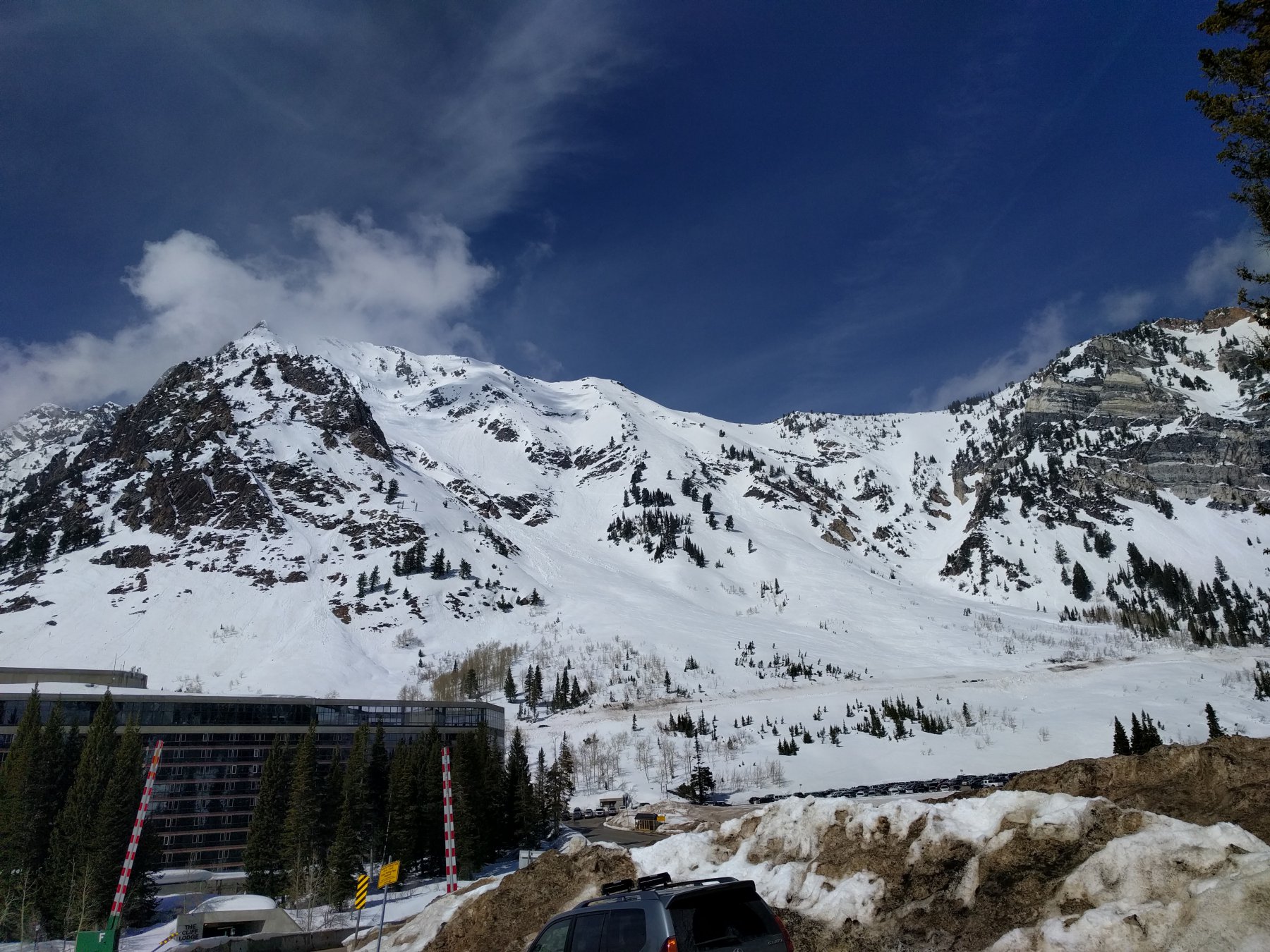 Scendere il ripido pendio sottostante in direzione del grosso Albergo di Snowbird tenendosi in direzione di una zona più alberata per evitare i colatoi che scaricano di più e che presentano qualche salto fino a raggiungere la strada