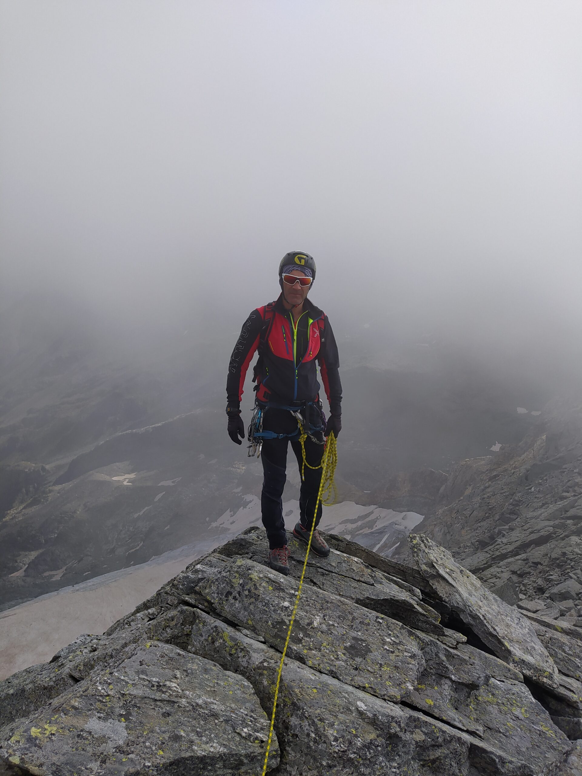 Saliti lungo la cresta di rocce rotte che dalla Adami porta a rocca rossa e nera ed infine in vetta . Alcuni tratti esposti e roccia marcia richiedono passo sicuro . Un tratto di 20mt circa richiede attenzione per l expo e la corda torna utile. Rientro sulla via normale ottimamente bollata di rosso ma esposta a scariche poi su neve si rientra senza troppe difficoltà.