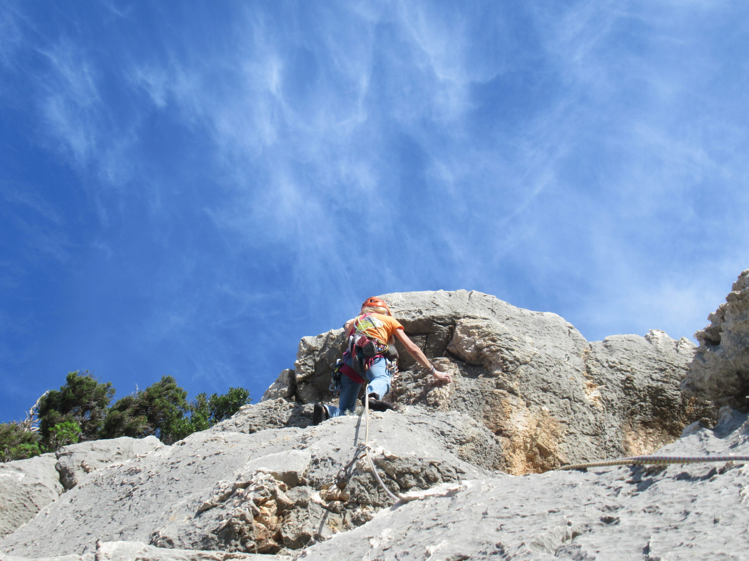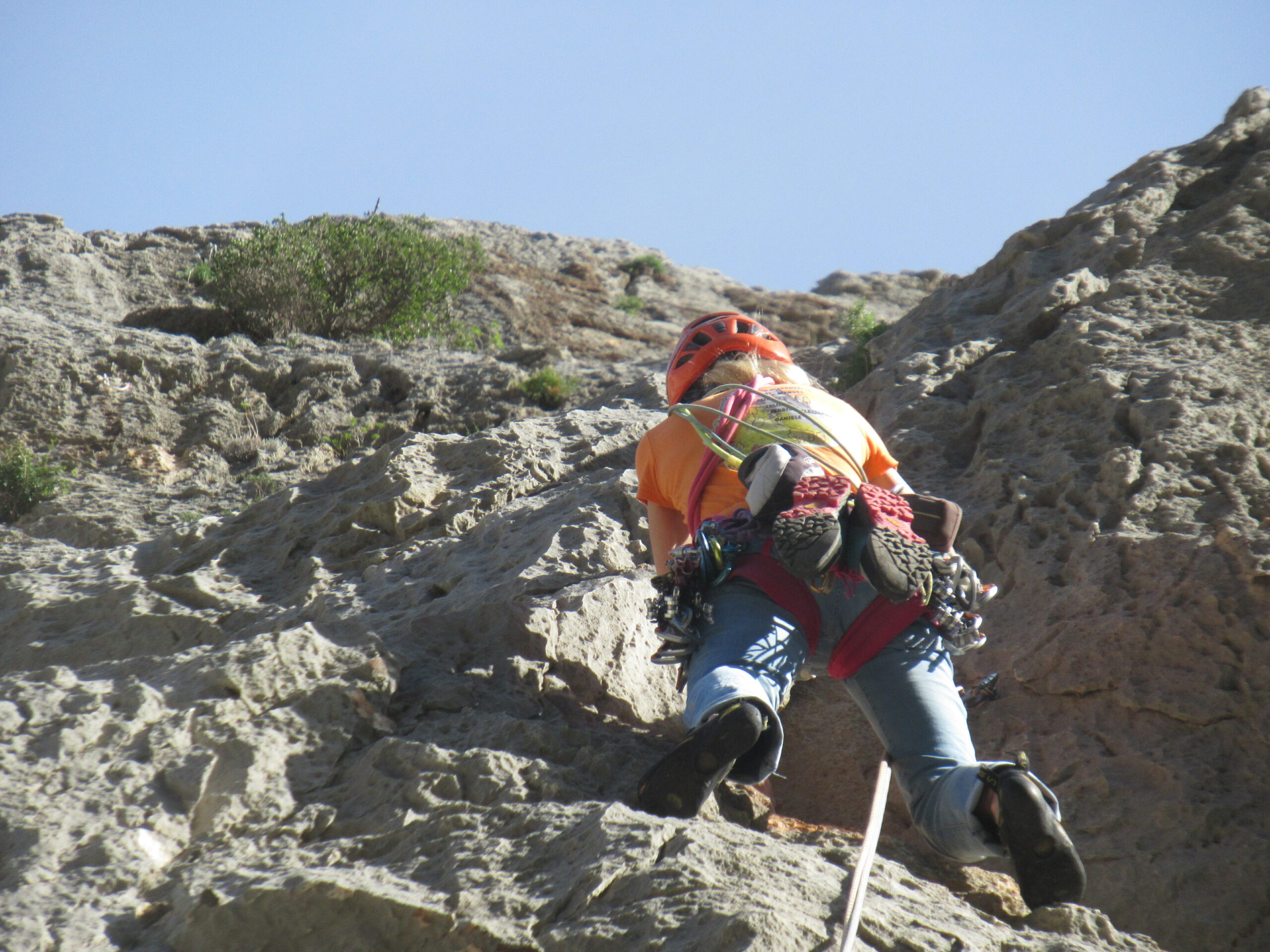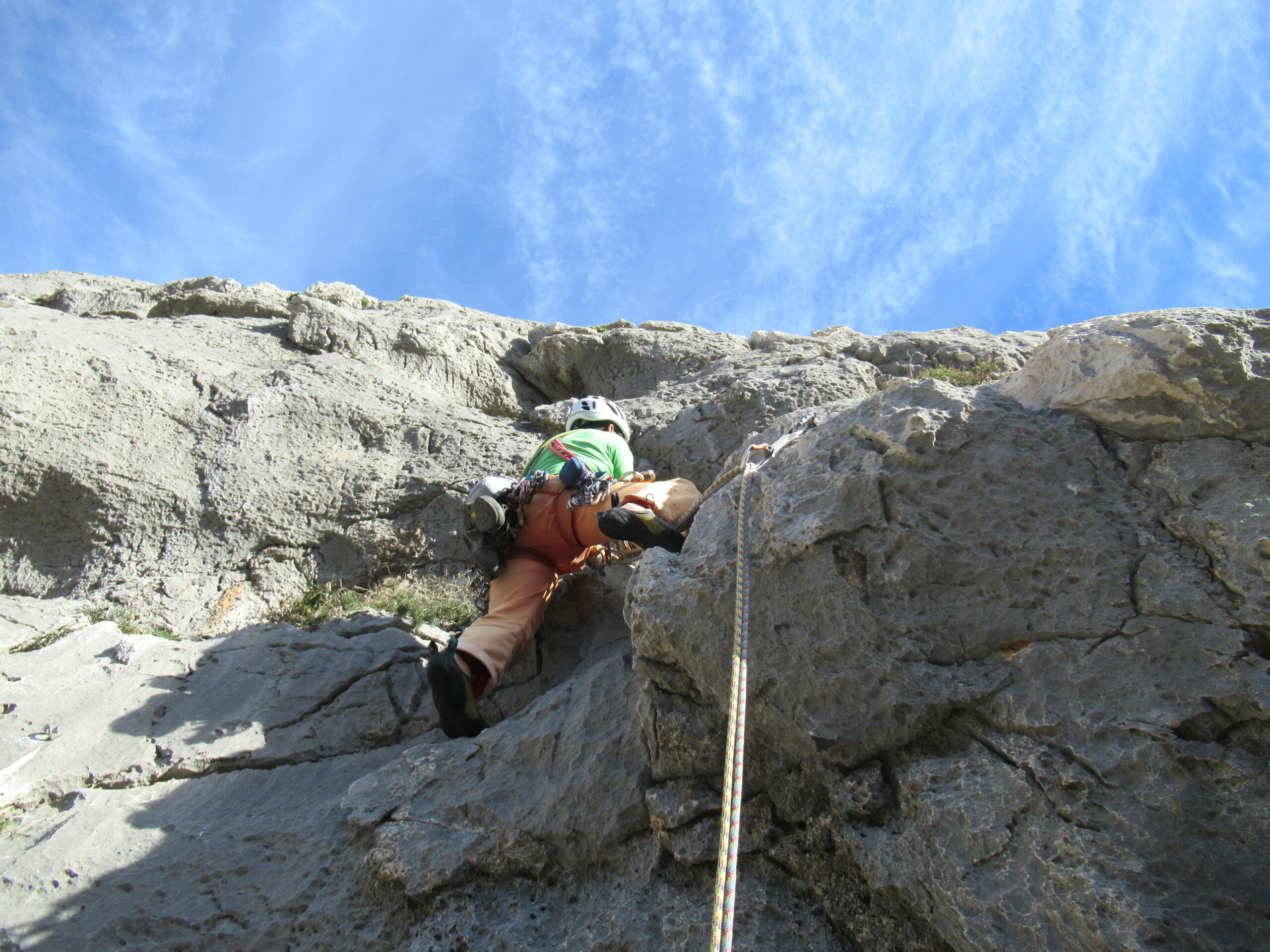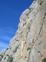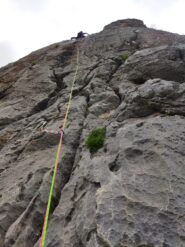 - L4: risalire verticalmente lo strapiombino e seguire i più facili risalti successivi (NB a due tasselli manca la placchetta, utilizzare un friend piccolo per proteggersi) fino ad un’altra nicchia (5c, 5a, 20 m)