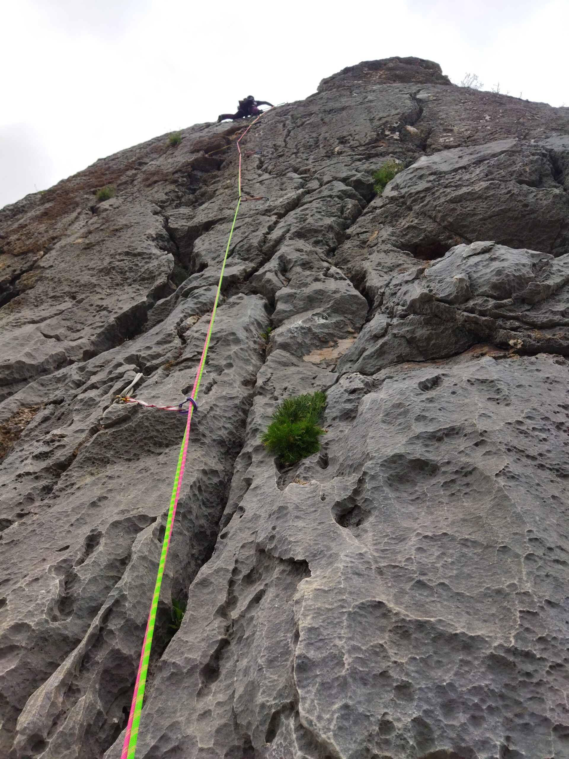 - L1: muro lavorato, diedro con strapiombino verso dx e placca in uscita (35 m, 5c+)