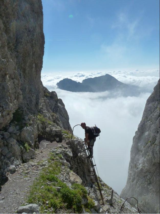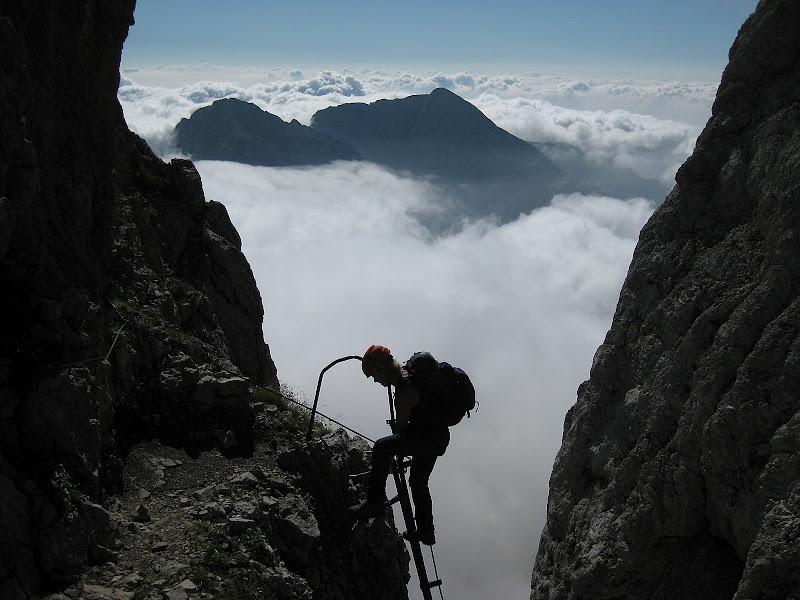 Una prima breve scaletta consente di montare su una cengetta, da dove parte una prima lunga e verticale scala. Dal minuscolo pianerottolo superiore inizia una seconda scala, espostissima e che butta un po’ all’infuori, che permette di raggiungere una cengia orizzontale. Aggirato uno speroncino, si riprende la sequenza di scalette, che fanno guadagnare un’altra cengia orizzontale: grazie anche ad un ponticello di legno, si supera un’interruzione della cengia, per poi riprendere la serie di scale. Si esce in alto in una specie di opprimente canale , che si risale sulla destra fino a che non è sbarrato da una fascia strapiombante. Sulla destra un’altra scaletta (con i primi metri un po’ strapiombanti) supera un primo salto, poi altre due scalette, sempre più appoggiate, conducono all’ultima cengia orizzontale che, seguita verso sinistra, porta allo strettissimo intaglio della Bocchetta dei Due Denti (2859 m, h 1,30).