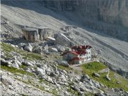 Da qui una traccia scende sul fianco destro del circo detritico: nell’attraversamento di alcuni nevai, specie ad inizio stagione, può rendersi utile la piccozza. Per bancate ghiaiose e scarse roccette la traccia conduce sul fondo dell’ampia conca poi, passati sul versante sinistro, alla base della Cima dei XII Apostoli, si tagliano alcune placconate e si raggiunge il dosso dove sorge il Rifugio “Carlo e Giuseppe Garbari” ai XII Apostoli (2489 m, h 0,45 dalla Bocchetta dei Due Denti).