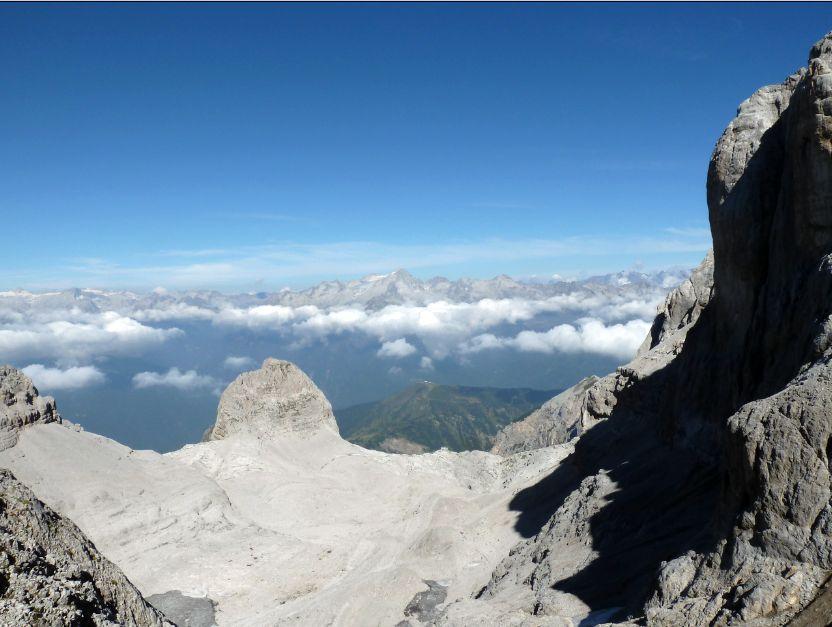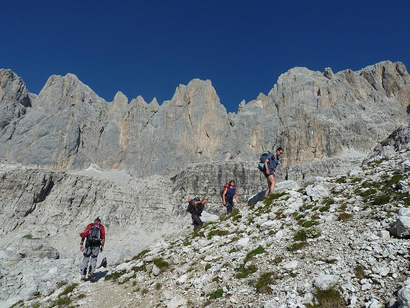 Appare, sull’altro versante, il grande circo detritico dei XII Apostoli, con il Rifugio Garbari sull’orlo delle lastronate.
