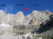 L'interessante cima Susat risulta di aspetto piuttosto insignificante vista dal versante Ovest, mentre si presenta slanciata e verticale vista da Est dove forma una gialla parete verticale, incisa da due lunghe e caratteristiche fessure a "X".