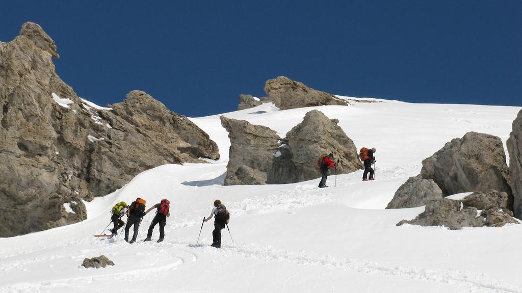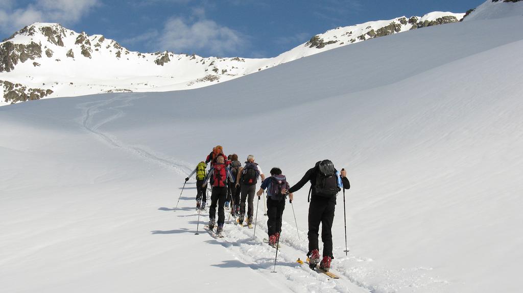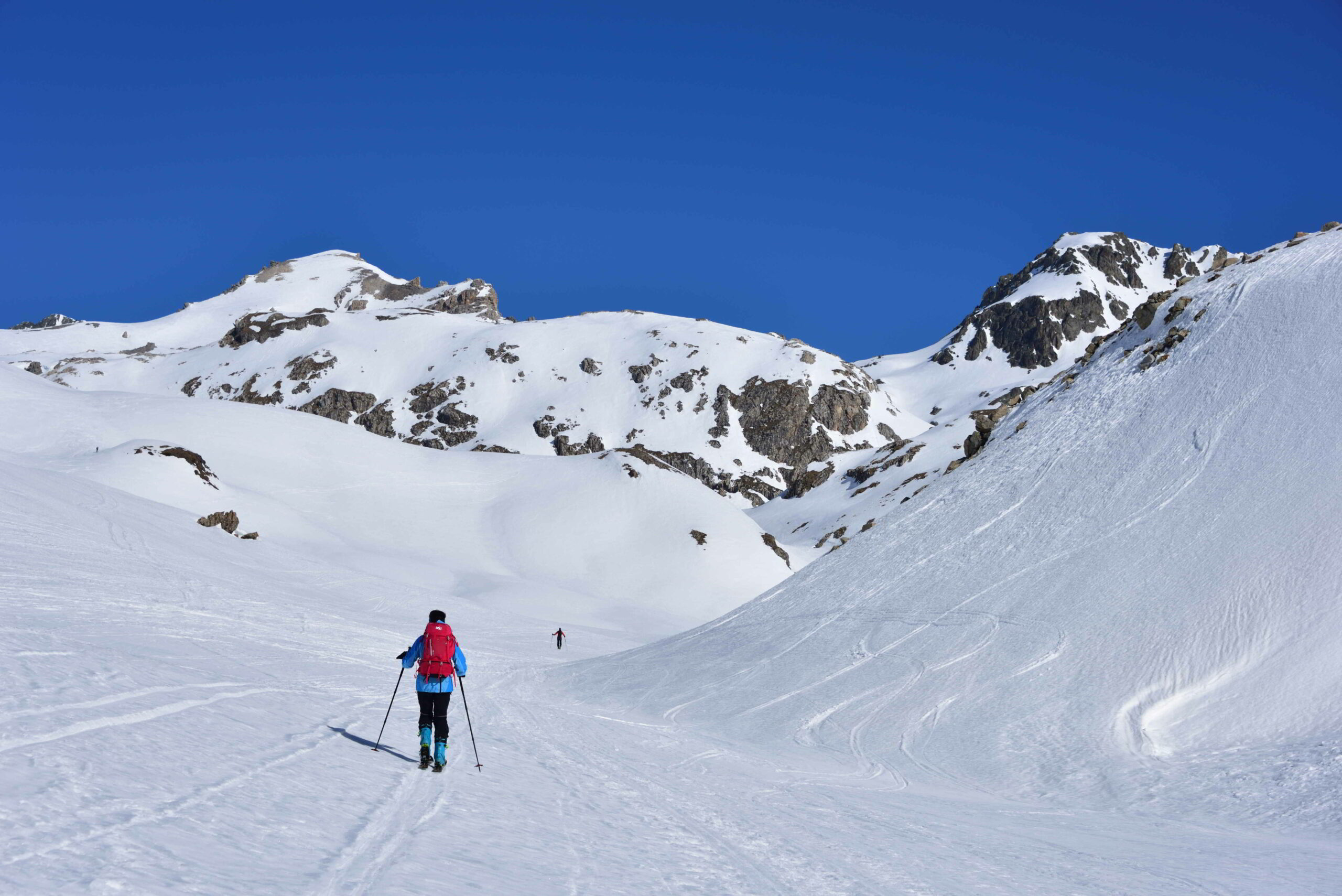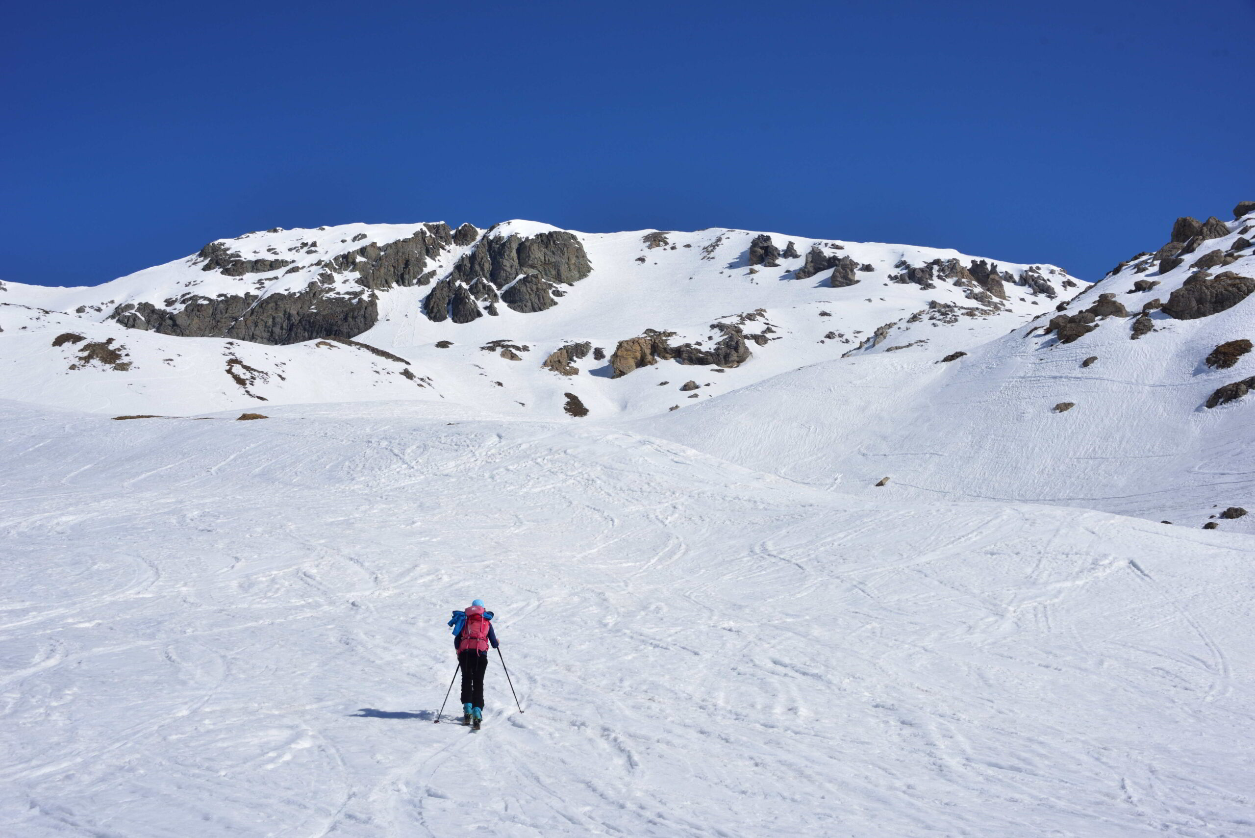 Attraversare la strada e risalire l’evidente val Guglia in direzione nord, all’inizio tenendosi presso il ruscello. Risalire i pendii non troppo ripidi sulla sx orografica, tra grandi massi, poi con un breve traverso raggiungere il vasto pianoro sovrastante. E’ anche possibile risalire i pendii sulla dx orografica ma questi sono più a rischio di valanghe dalle ripide balze sovrastanti esposte a Est.