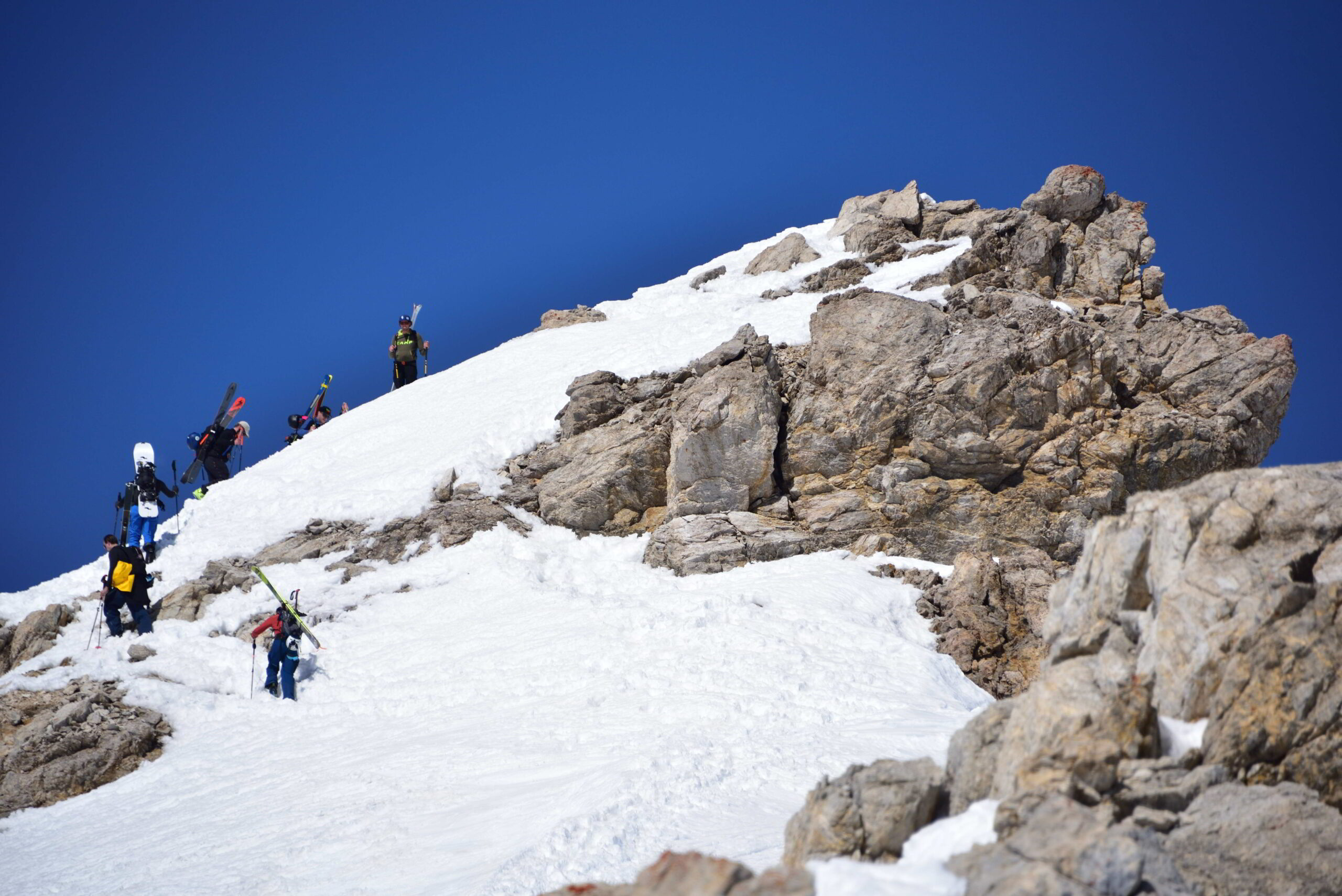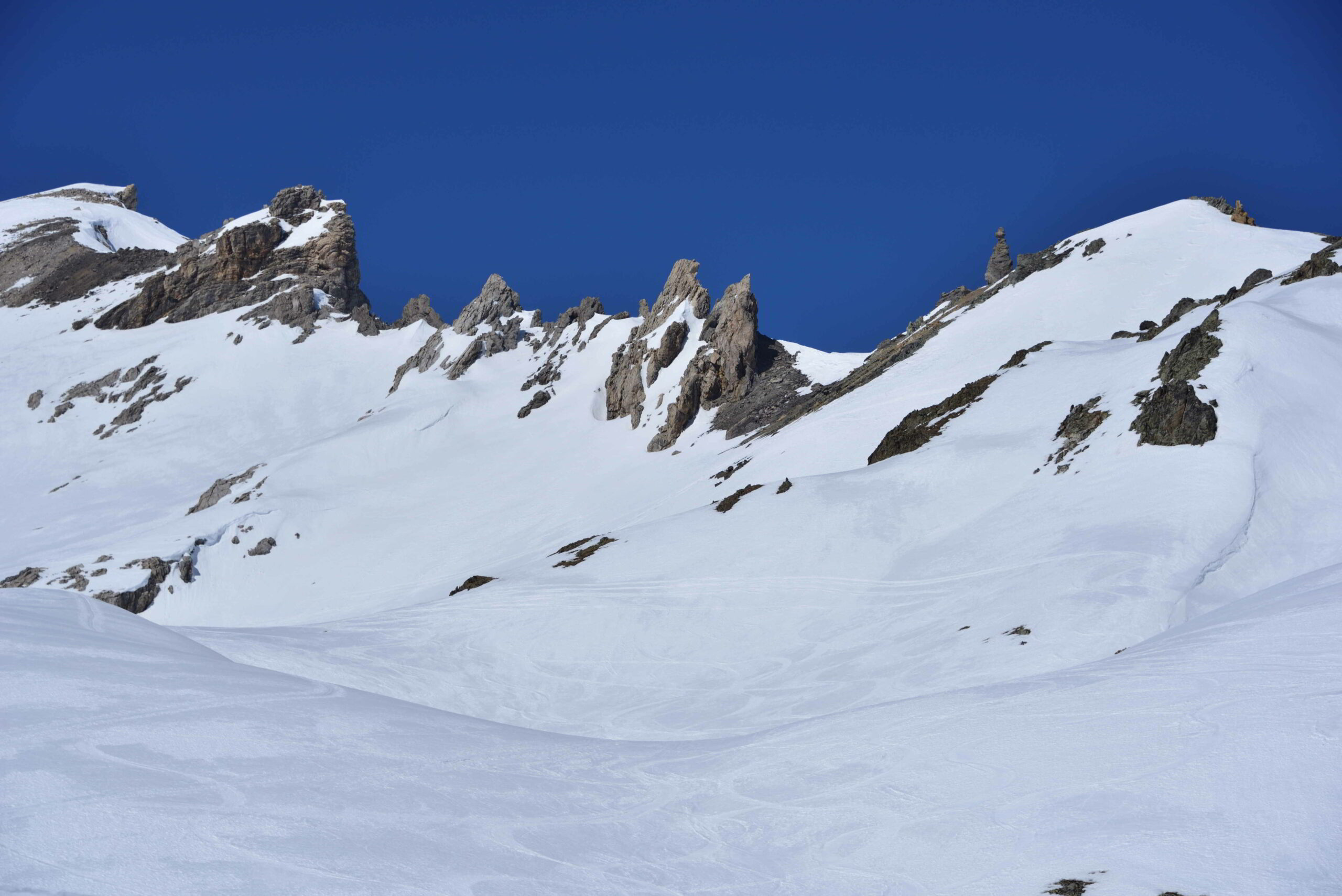 Dalla vetta scendere direttamente il bel pendio-canale Sud (circa 35° per 150 m) e poi per bellissimi pendii ricollegarsi al percorso di salita. E’ anche possibile, prima di raggiungere il colletto con gendarme, puntare decisamente a Nord su pendio ripido in direzione di alcuni gendarmi di roccia e, superatili, continuare per l’ultimo tratto largo e sciabile della cresta Sud-Est fino alla cima.