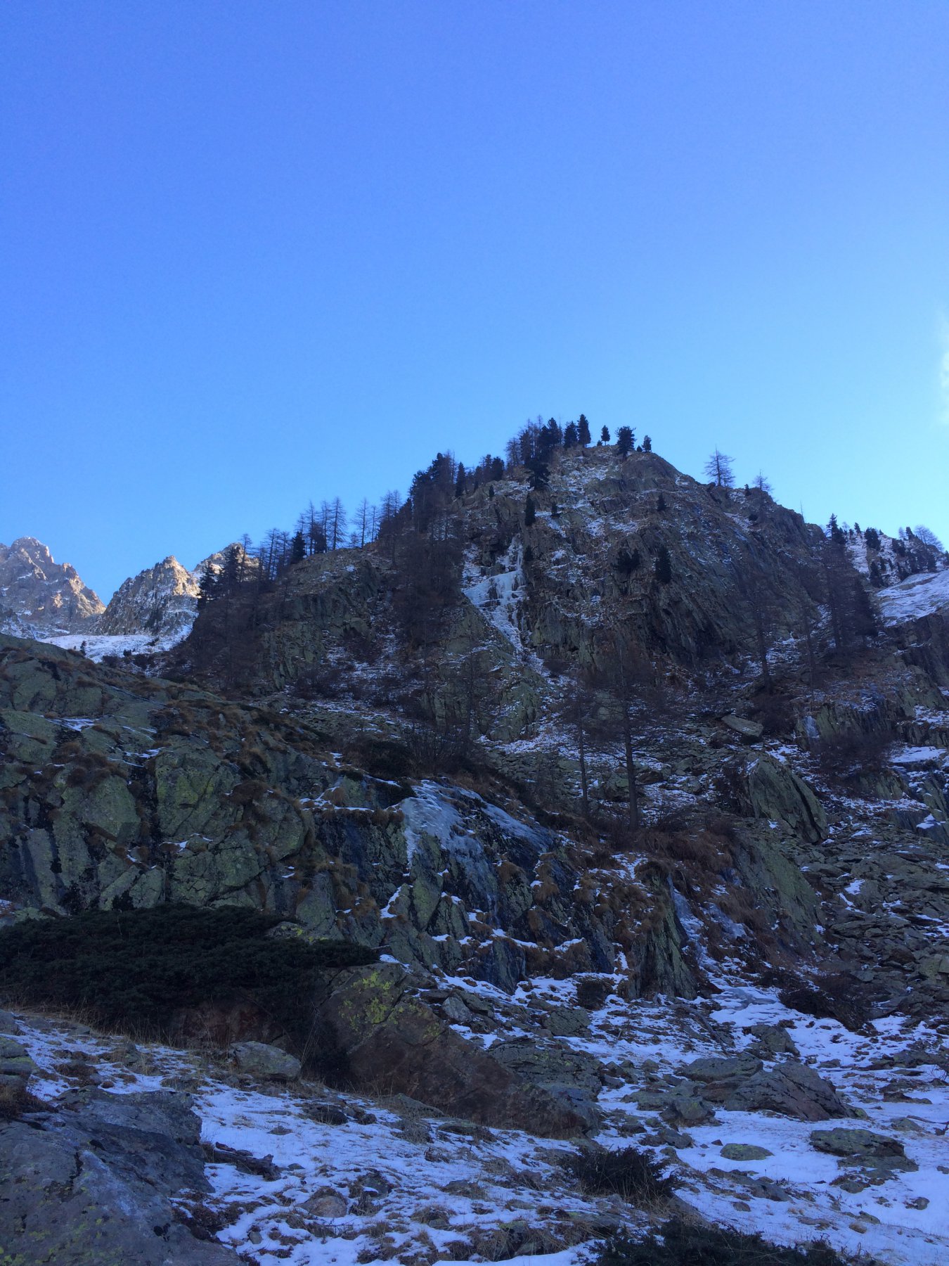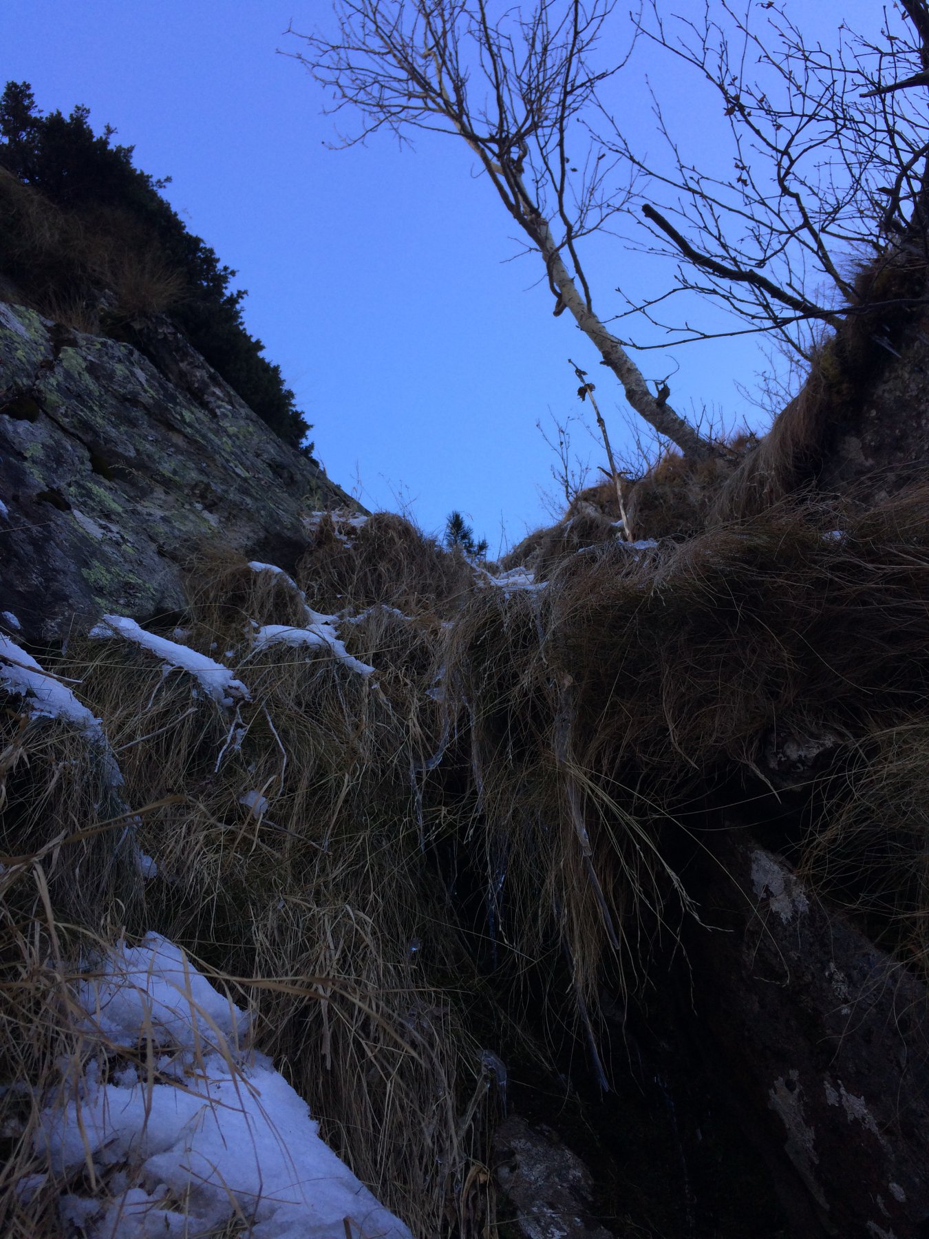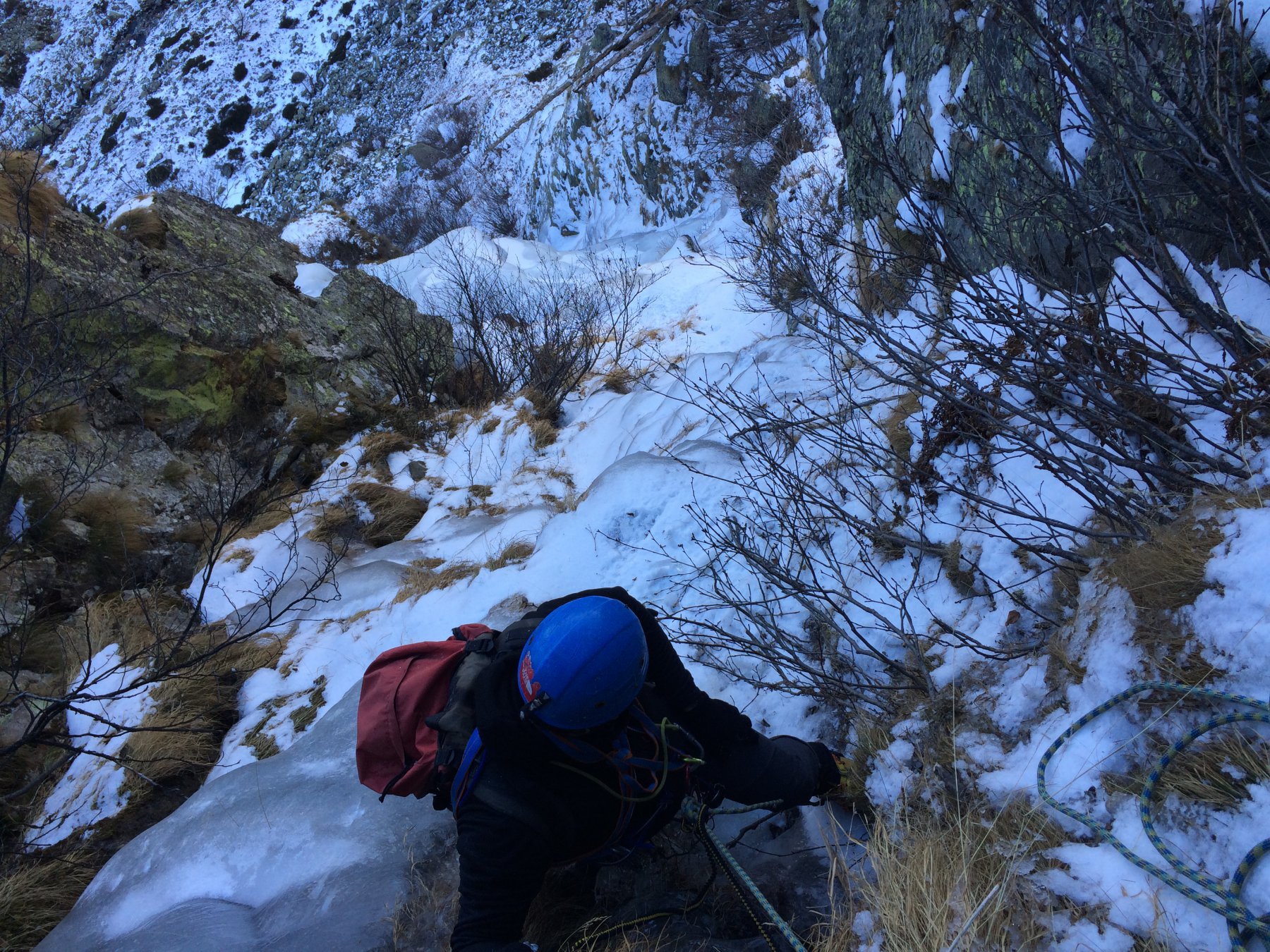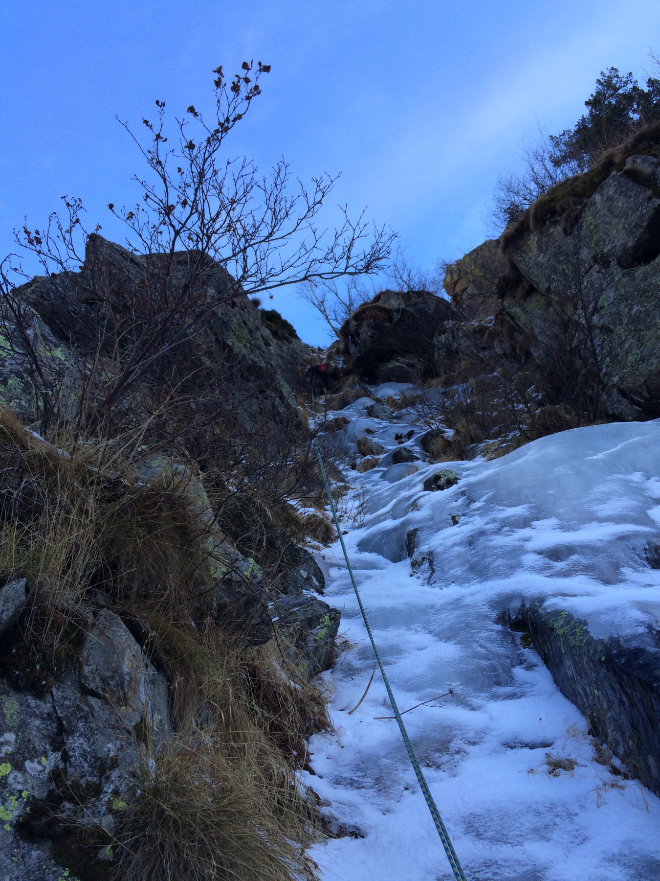 L2: Salire a sinistra prima su ghiaccio a 75-80° poi per diedro canale misto (ghiaccio-roccia-terra gelata). Uscita su terra gelata e sosta su larice da attrezzare. (60m)