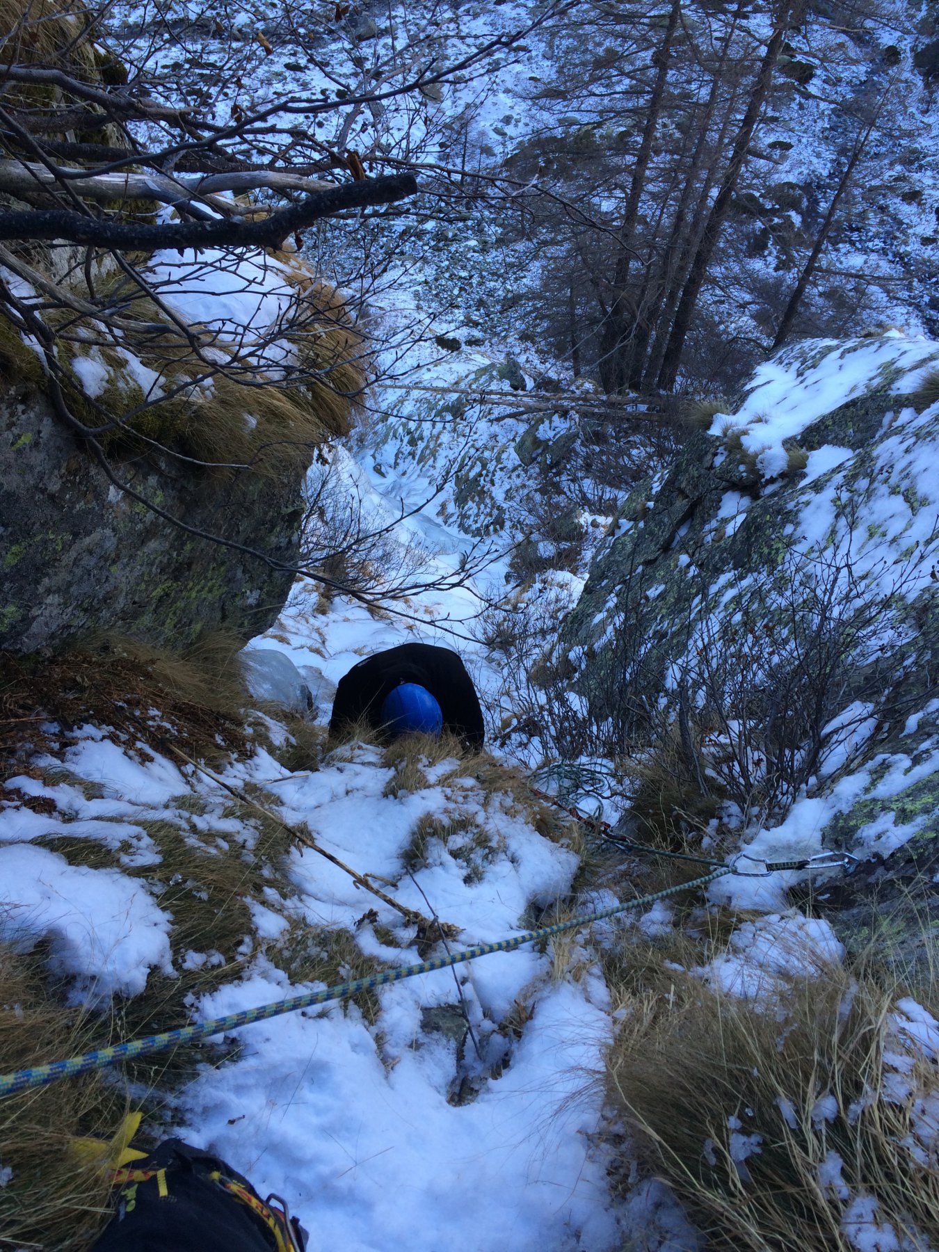 Discesa: in doppia sulla via. Sufficiente una corda singola da 70m.