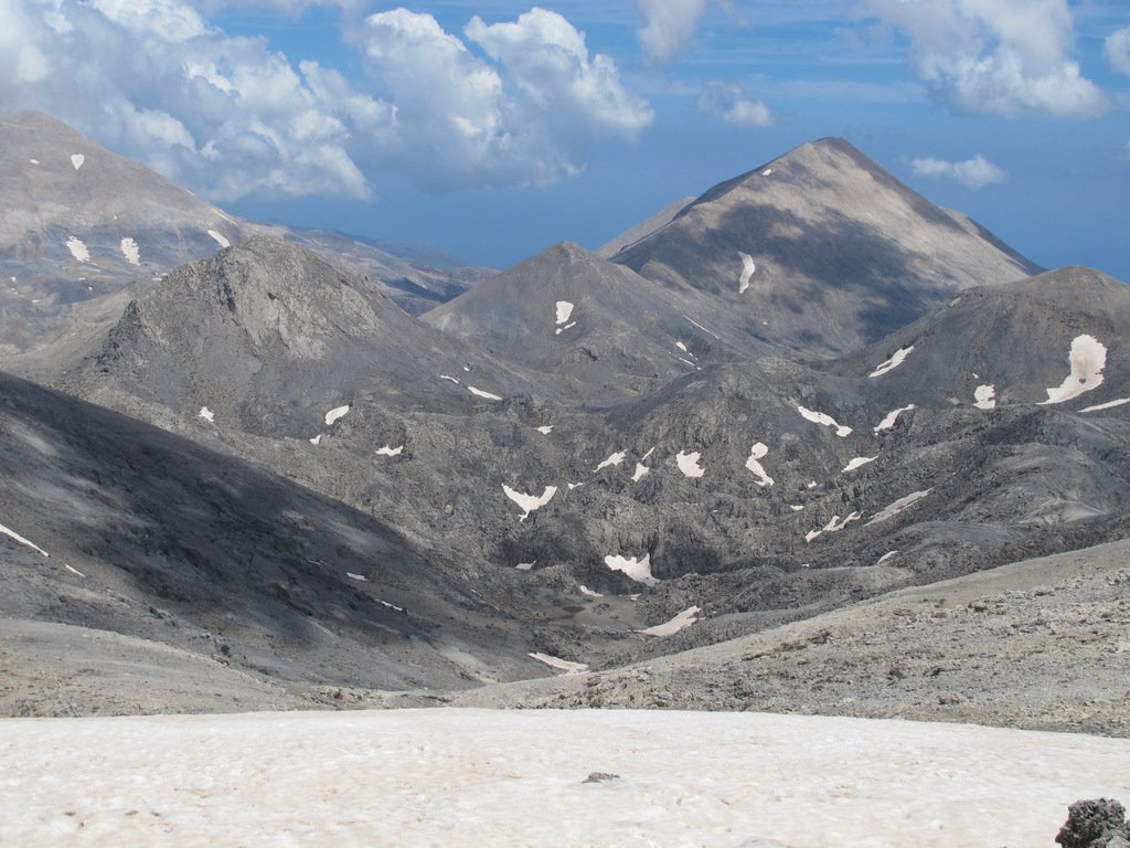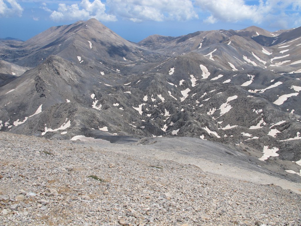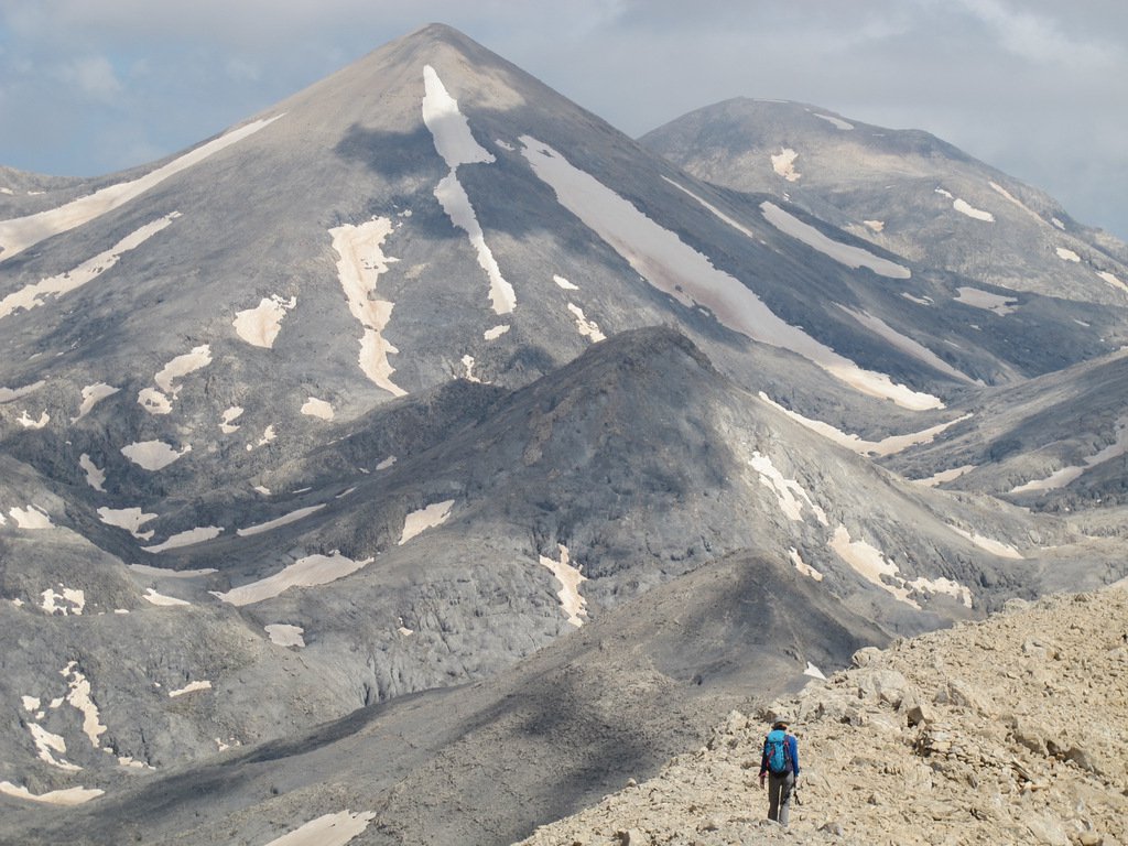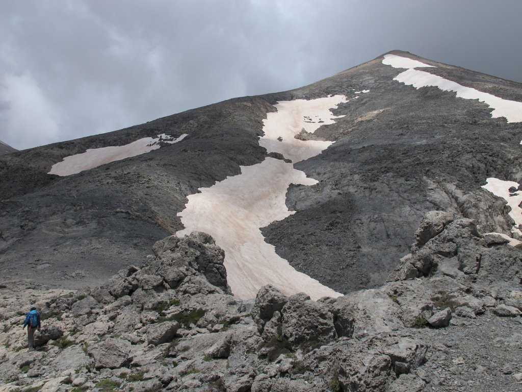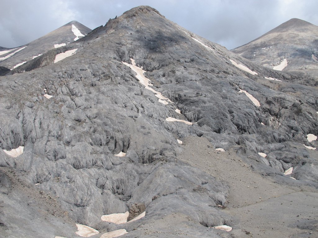 Inizia ora la fase più articolata del percorso che attraversa l’inquietante zona di rocce nere e doline chiamata “Pavlià Chalara”. Dalla vetta del Pavlias si continua per cresta perdendo una ventina di m. di dsl per volgere poi a sx (direzione OSO) e scendere fra ripide placche rocciose e brecciolino verso un piccolo pianoro tra le doline che si attraversa, ricominciando l’andamento a saliscendi sul ristretto bordo delle doline (terreno roccioso alternato a cespugli spinosi) e puntando al versante S del Griàs Soros (q. 2331), prossima meta. Se ne raggiunge una spalla seguita da una depressione e si risale il ripido pendio finale di ghiaioni. Dalla cima si scende verso SO guadagnando un’ampia dorsale quasi pianeggiante per poi alzarsi, nuovamente su ripidi ghiaioni, toccando il Mesa Soros (q. 2349), da dove è possibile osservare la cresta che collega lo Zouridhia alle Sternes.