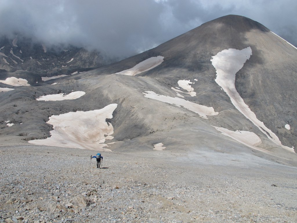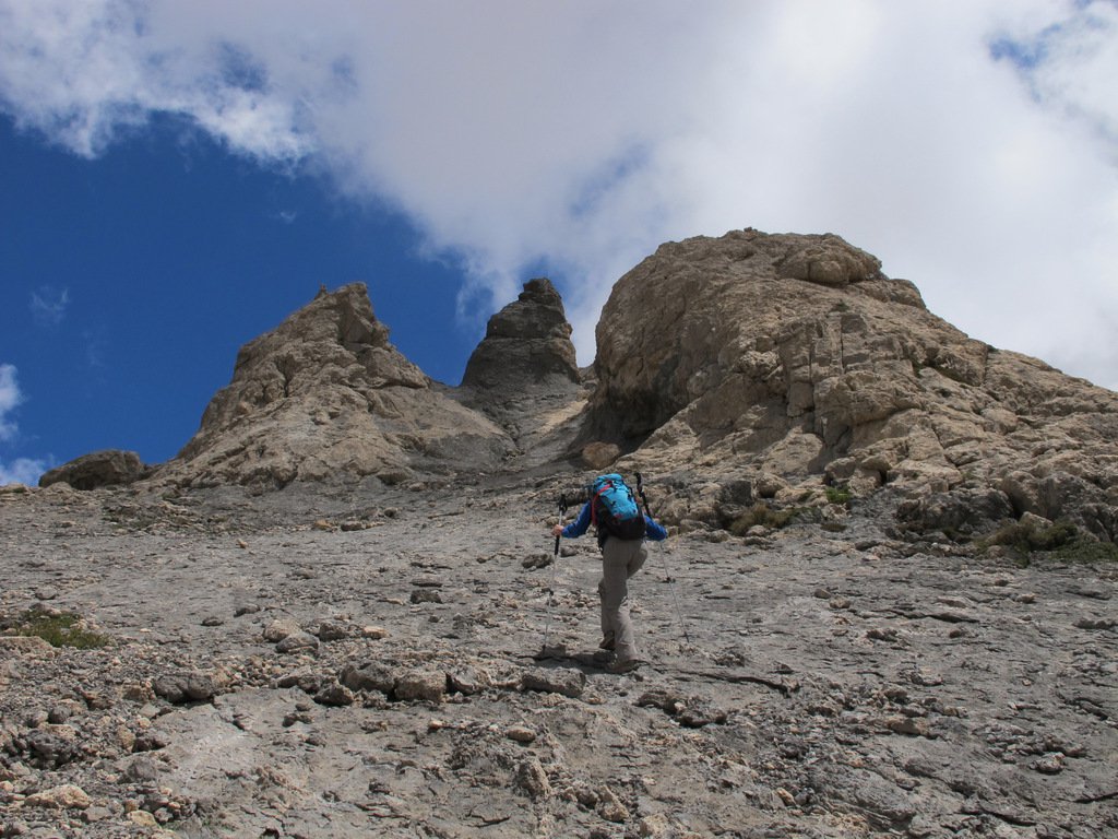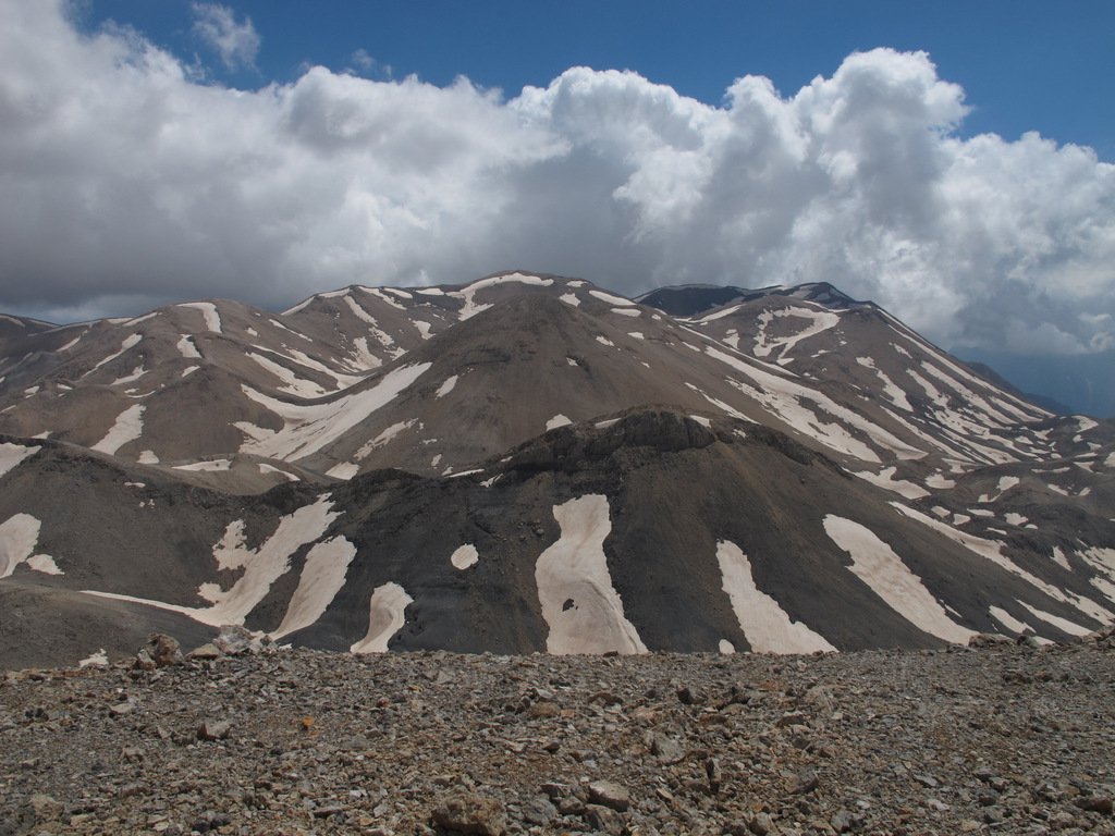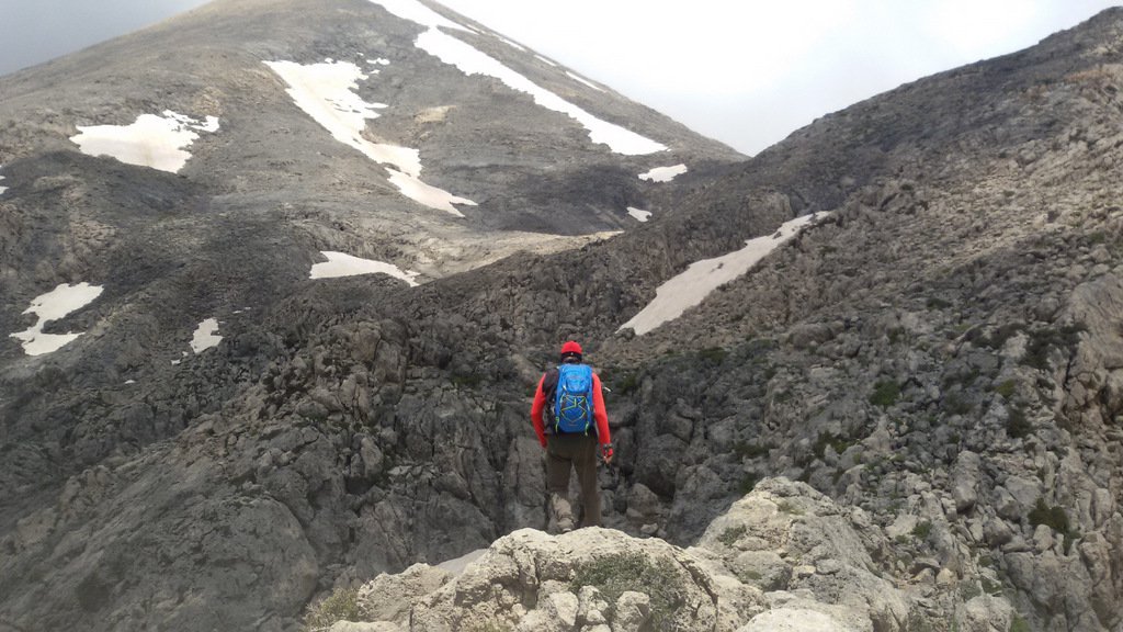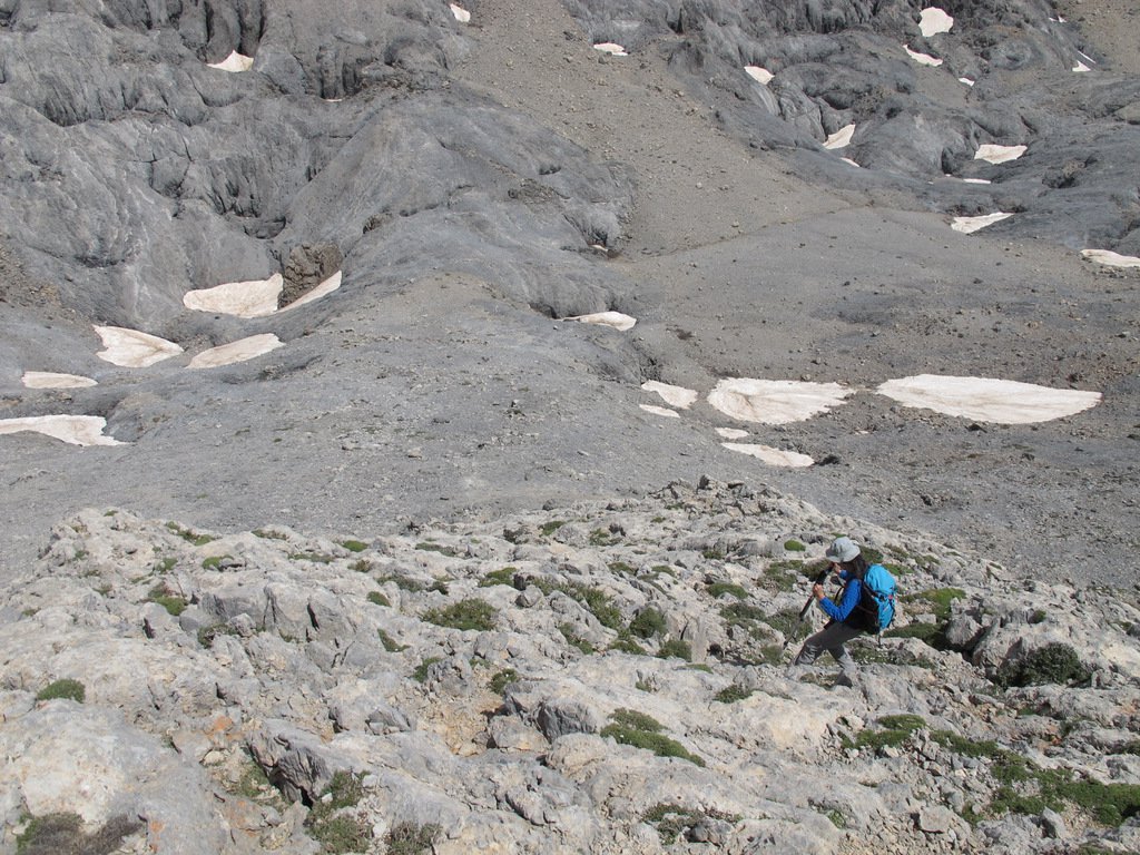 Inizia ora la fase più articolata del percorso che attraversa l’inquietante zona di rocce nere e doline chiamata “Pavlià Chalara”. Dalla vetta del Pavlias si continua per cresta perdendo una ventina di m. di dsl per volgere poi a sx (direzione OSO) e scendere fra ripide placche rocciose e brecciolino verso un piccolo pianoro tra le doline che si attraversa, ricominciando l’andamento a saliscendi sul ristretto bordo delle doline (terreno roccioso alternato a cespugli spinosi) e puntando al versante S del Griàs Soros (q. 2331), prossima meta. Se ne raggiunge una spalla seguita da una depressione e si risale il ripido pendio finale di ghiaioni. Dalla cima si scende verso SO guadagnando un’ampia dorsale quasi pianeggiante per poi alzarsi, nuovamente su ripidi ghiaioni, toccando il Mesa Soros (q. 2349), da dove è possibile osservare la cresta che collega lo Zouridhia alle Sternes.