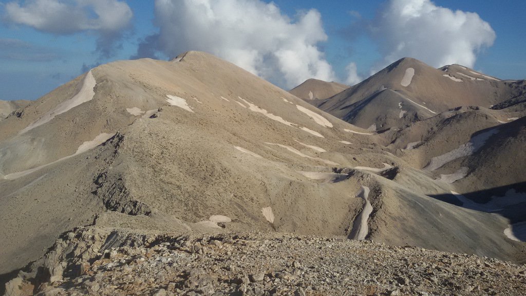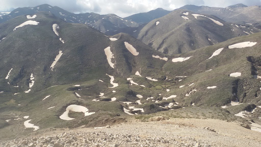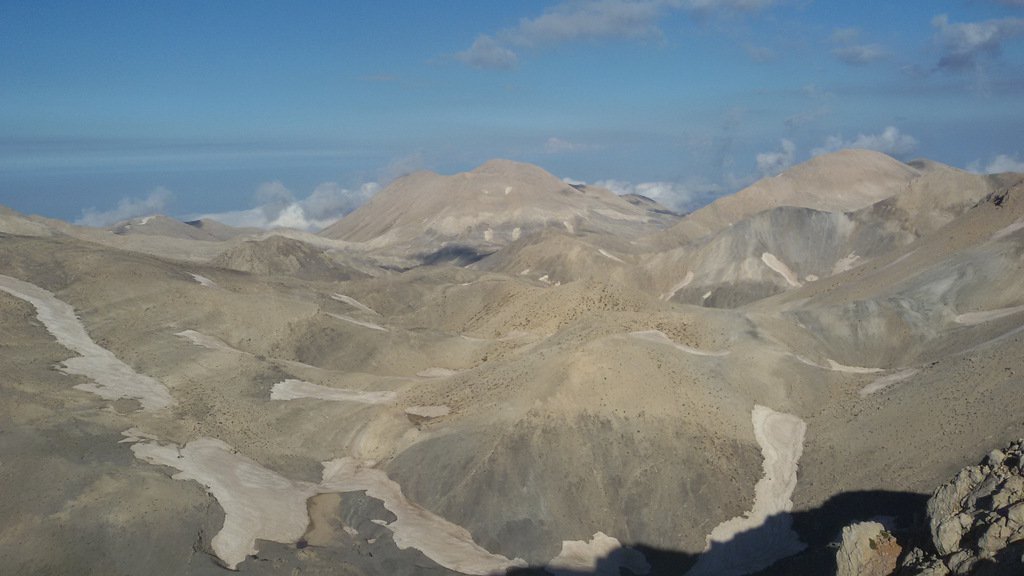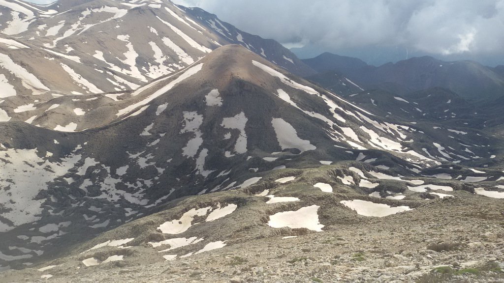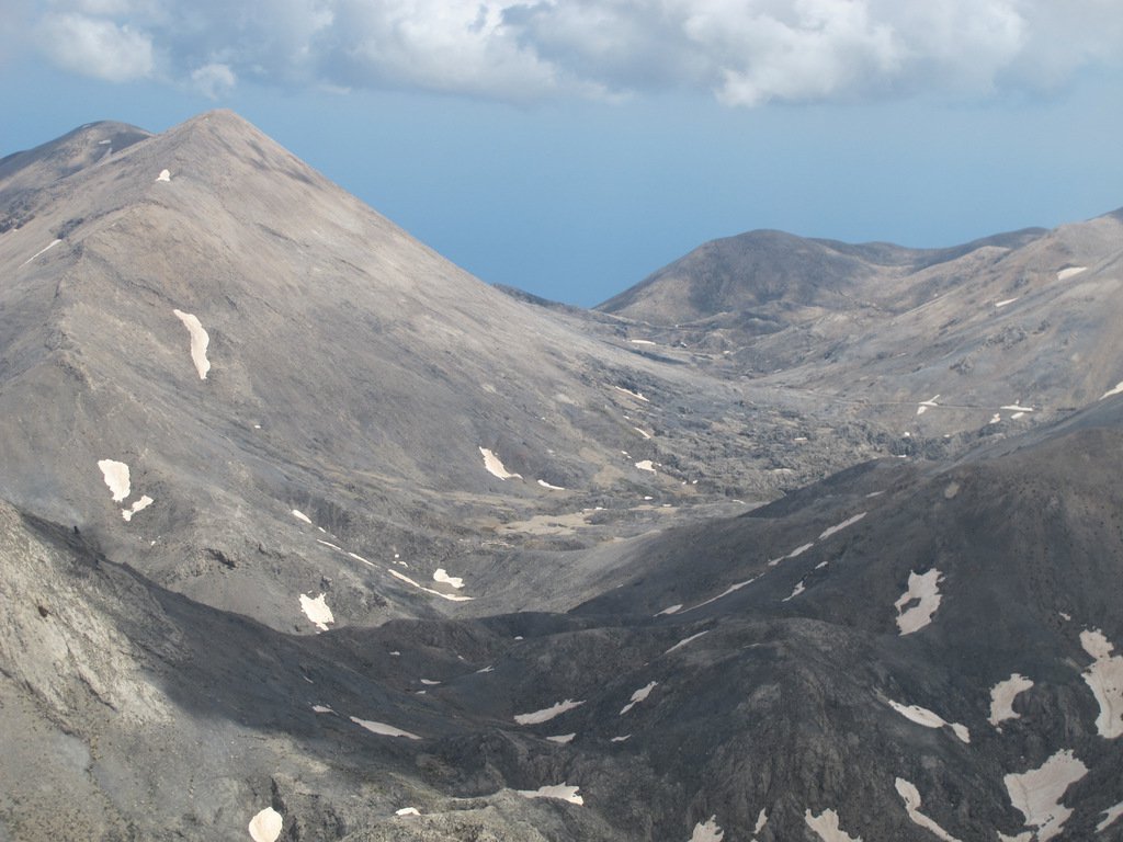 Nuova discesa in direzione NO e successiva risalita per dorsale alla vetta dello Svourichtì (q. 2356), elevazione maggiore fra quelle toccate nel giro ad anello: da qui è possibile un percorso di rientro alternativo abbassandosi per tracce al rifugio e al sottostante pianoro di Katsiveli (si può, volendo, far tappa) a reperire il sentiero che riporta a Roussies e ad Ammoutserà evitando di toccare le punte di Modhaki, Zouridhia e Sternes, con un conseguente abbattimento del dsl. Volendo invece proseguire l’itinerario qui proposto, dall’ometto dello Svourichtì si scende verso SO passando tra due caratteristiche doline e arrivando con qualche saliscendi ad una vasta depressione. Si ricomincia la salita incontrando poco oltre il sentiero che proviene da Katsiveli e che taglia tutto il versante E del Modhaki. Lo si oltrepassa aggirando a dx un piccolo dosso e si perviene in vetta al Modhaki (q.2225) per la sua cresta NE.