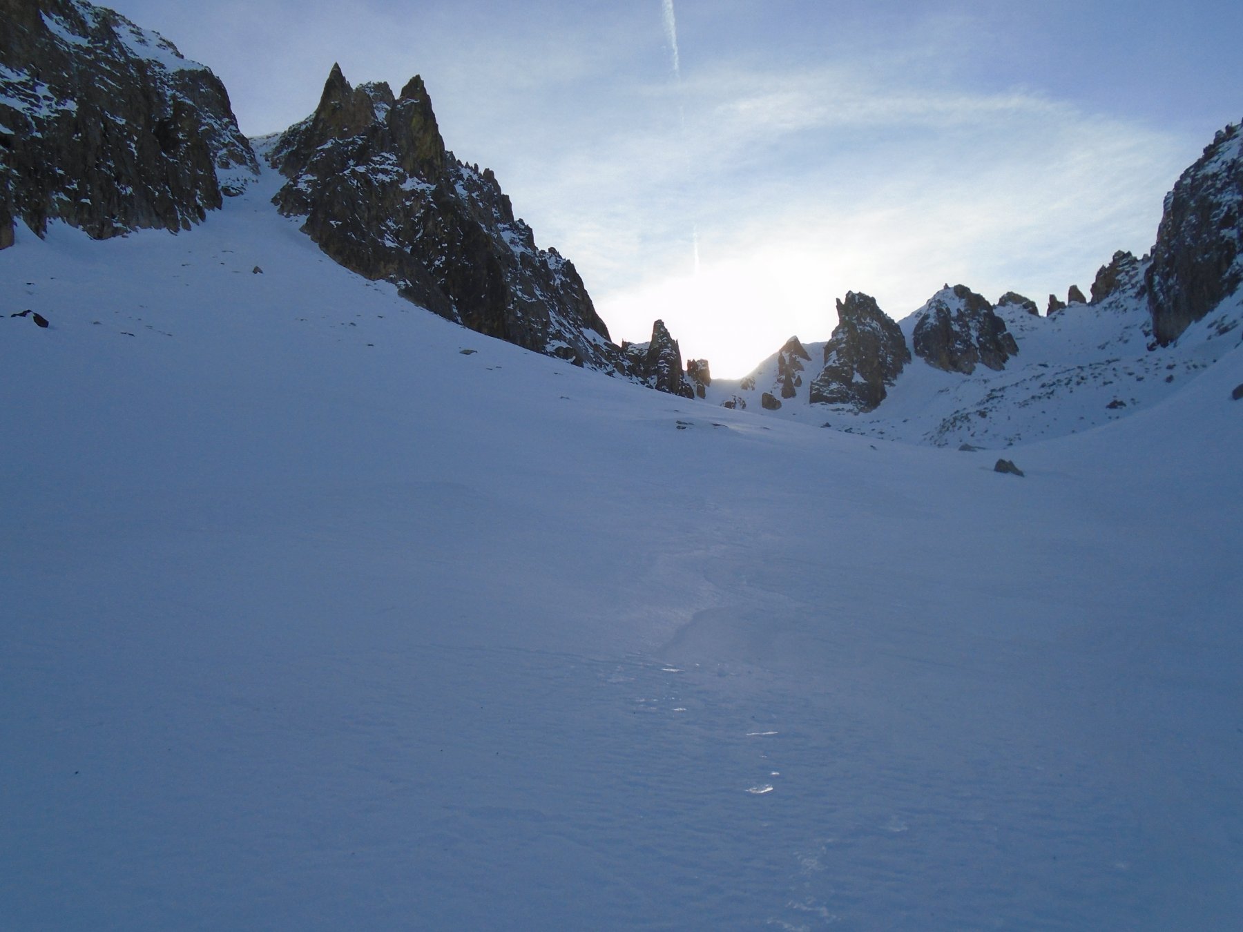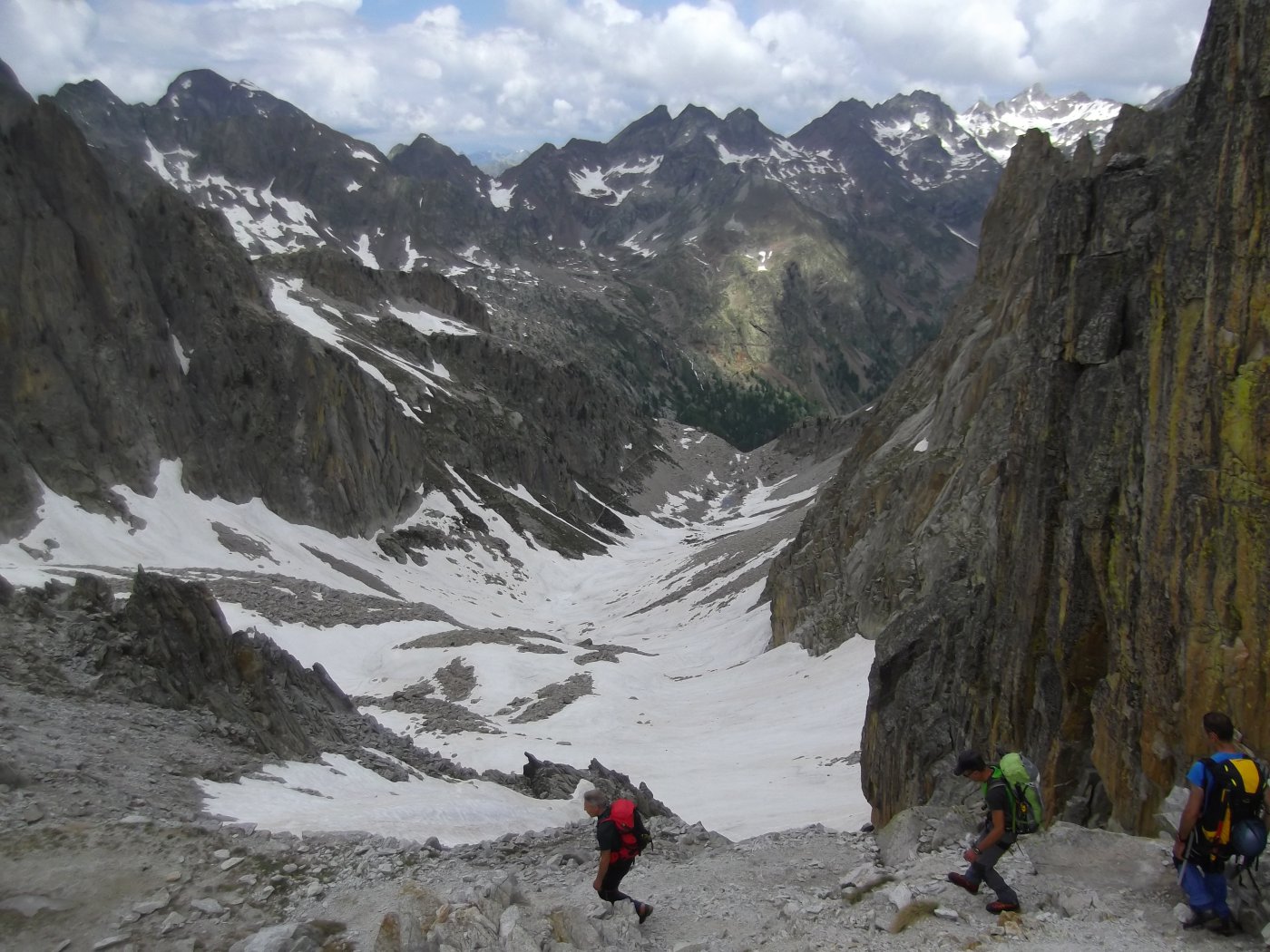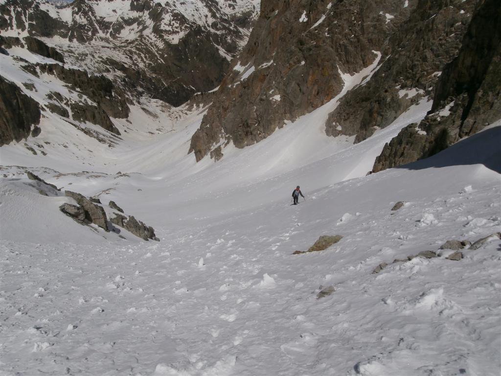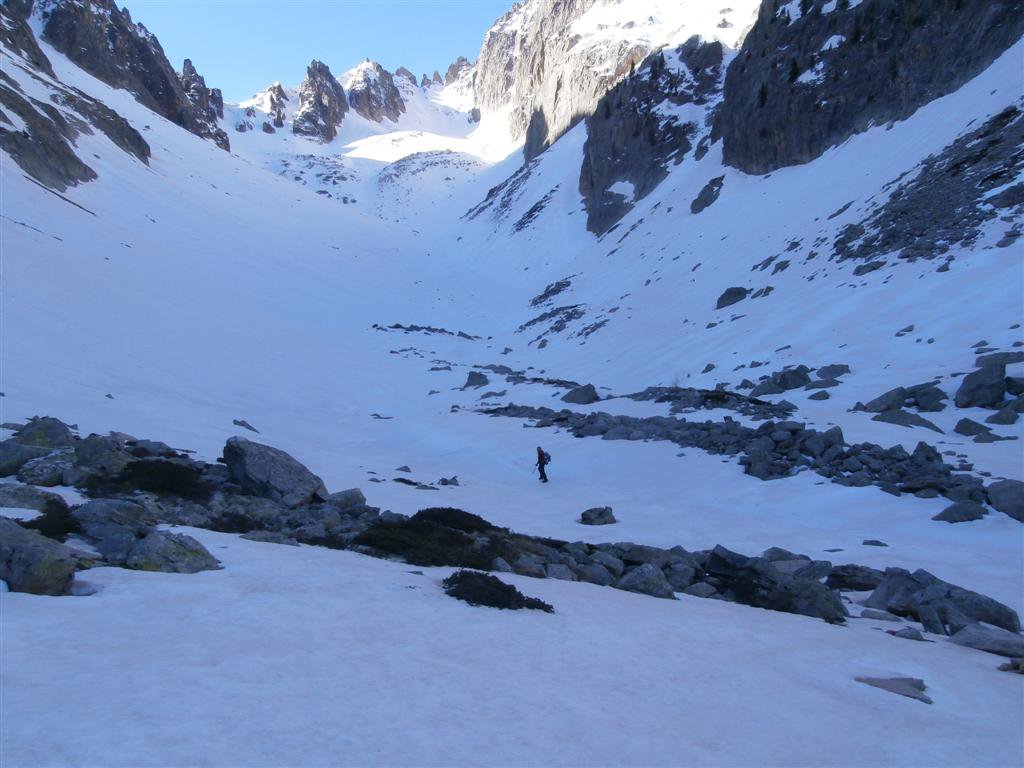 Discesa: dal colletto di uscita del canale scendere verso S-SE un canalone di sfasciumi che permette di superare una fascia rocciosa. In basso si incontra una traccia che verso sx, costeggiando la base delle pareti, porta al Passo di Prefouns (breve risalita), da dove di torna nel vallone di salita. In alternativa è possibile anche scendere dalla cresta SSO (F+).