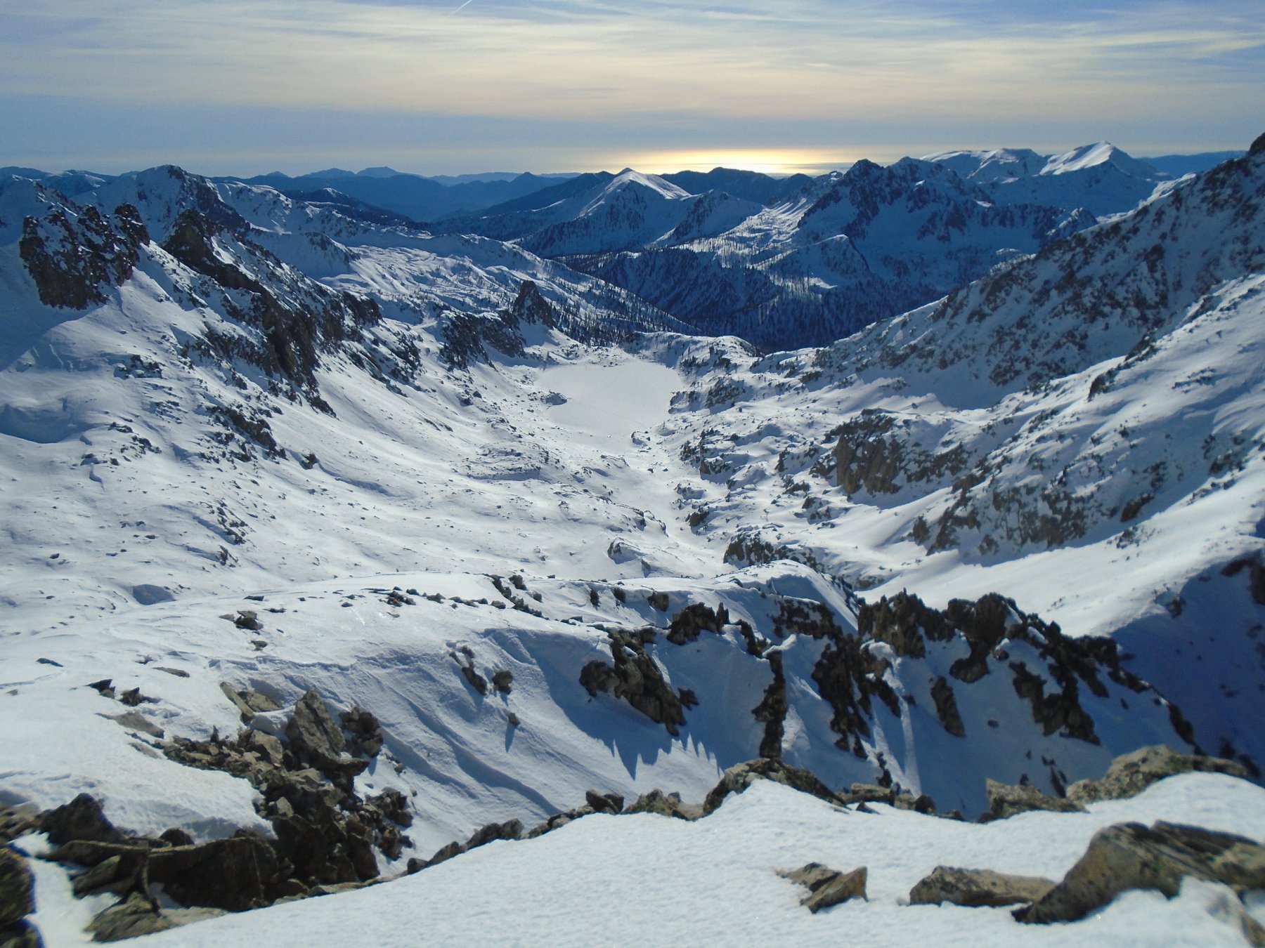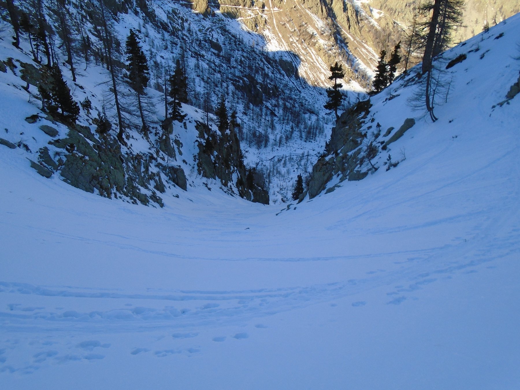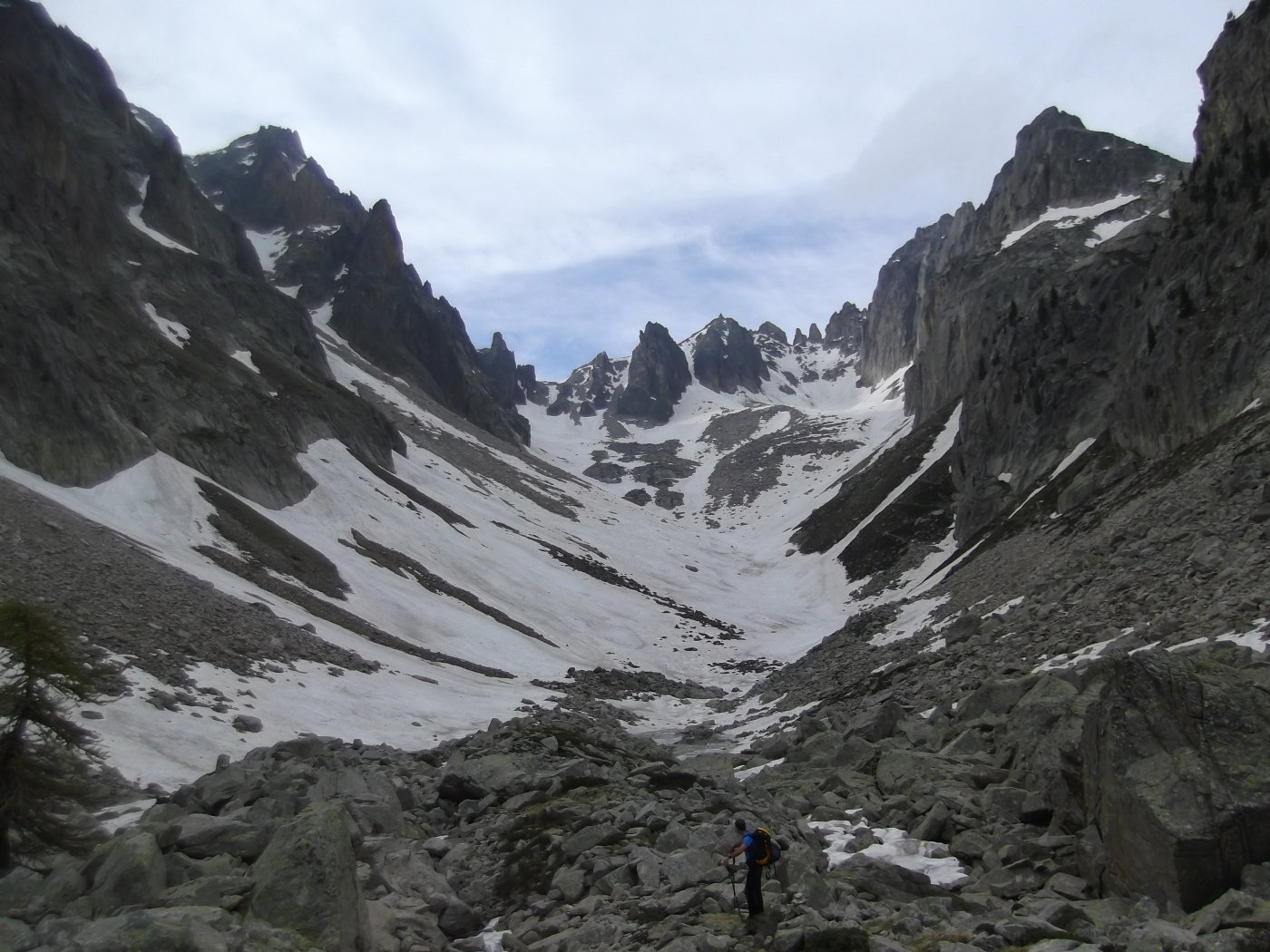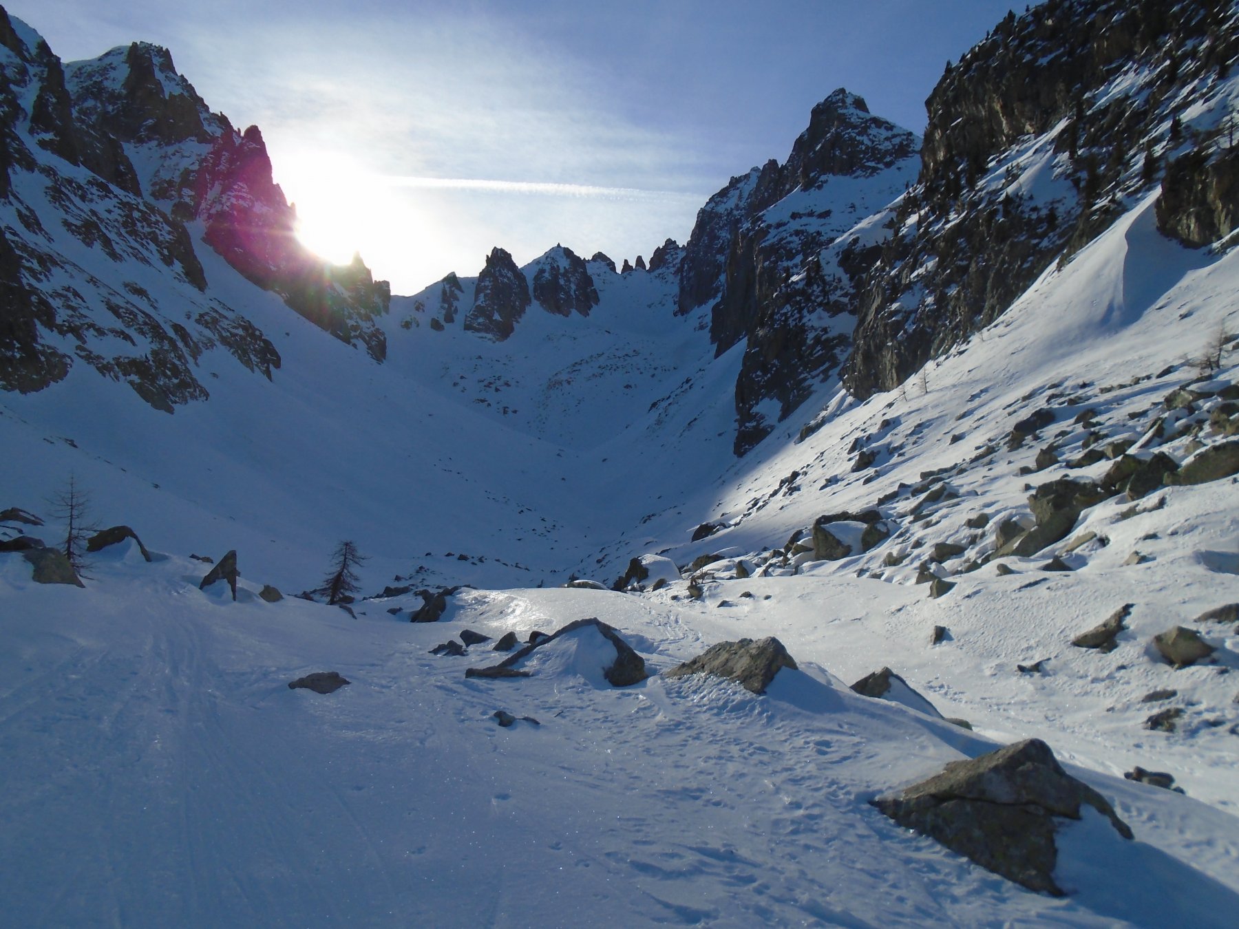 Discesa: dal colletto di uscita del canale scendere verso S-SE un canalone di sfasciumi che permette di superare una fascia rocciosa. In basso si incontra una traccia che verso sx, costeggiando la base delle pareti, porta al Passo di Prefouns (breve risalita), da dove di torna nel vallone di salita. In alternativa è possibile anche scendere dalla cresta SSO (F+).