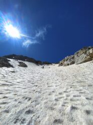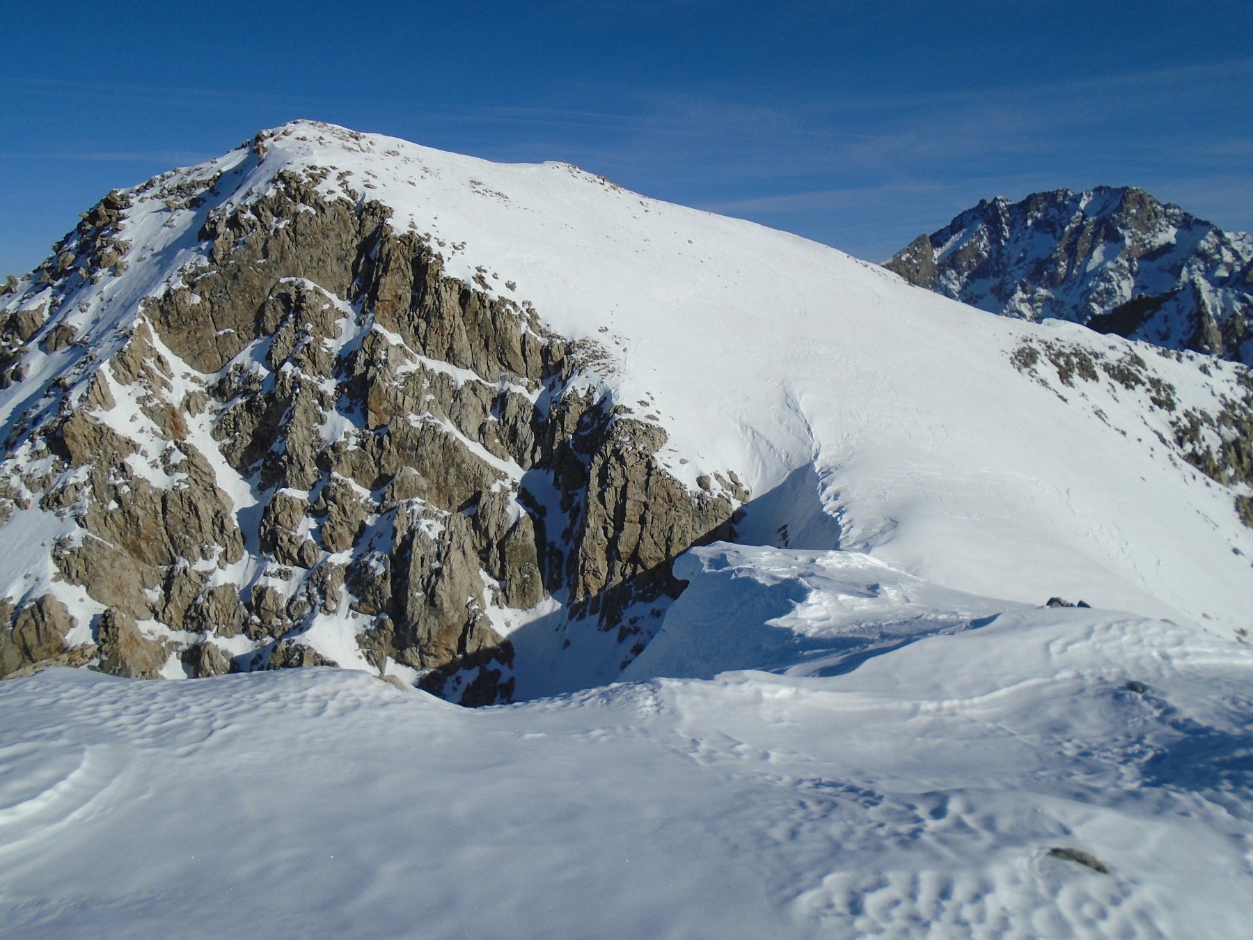 Risalito il vallone sul fondo (ometti), si imbocca l’evidente canalone che si risale fino al colletto fra le due cime, da dove piegando a sinistra (NE), si tocca in breve la cima principale.