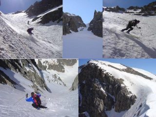 una bella discesa su neve dura nella parte alta del canale poi un breve tratto valangato ma sciabile infine neve primaverile.