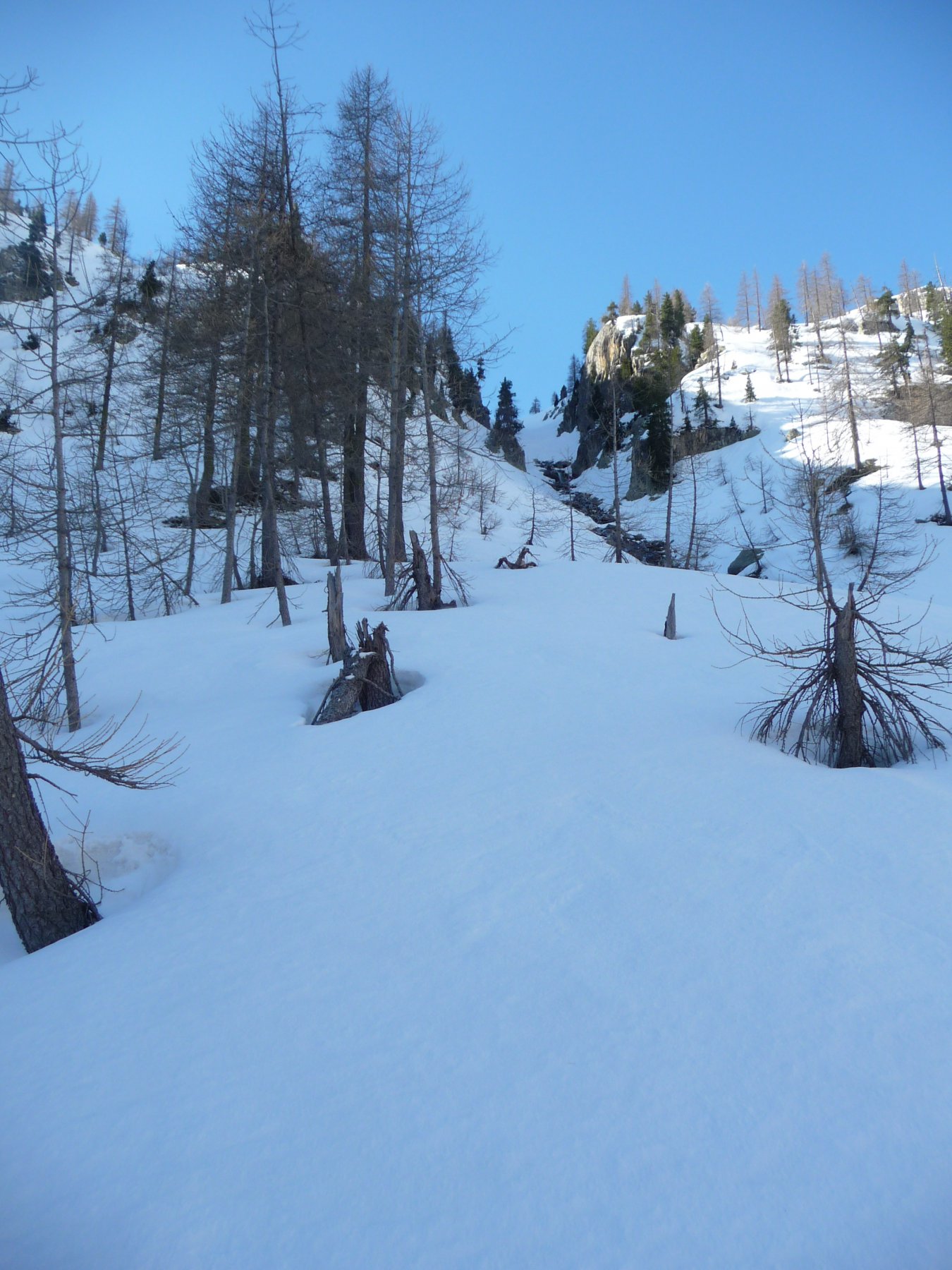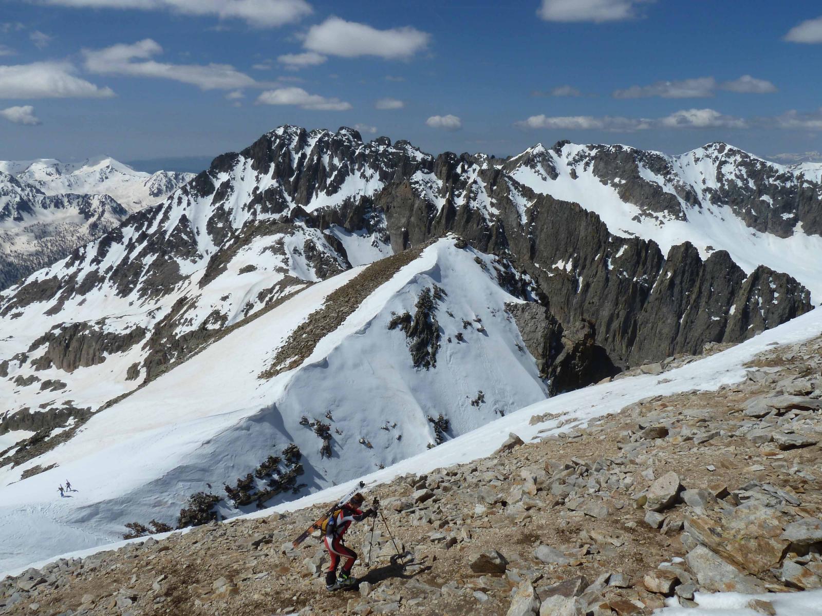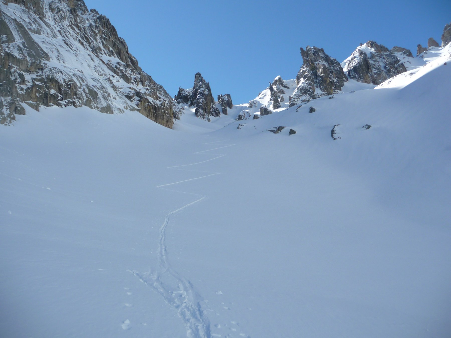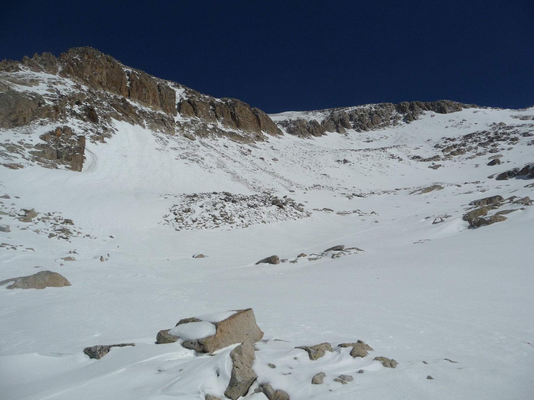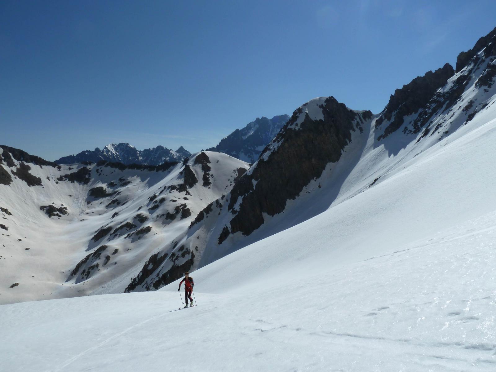 Tornati agli sci scendere direttamente il ripido pendio sottostante o sulla dorsale sud-ovest. Persi circa 80 m di quota, traversare verso l’evidente pendio-canale che interrompe al centro la barra rocciosa che taglia il versante sud della Testa di Tablasses (2700m circa). Risalire il canale e il pendio finale giungendo in vetta.