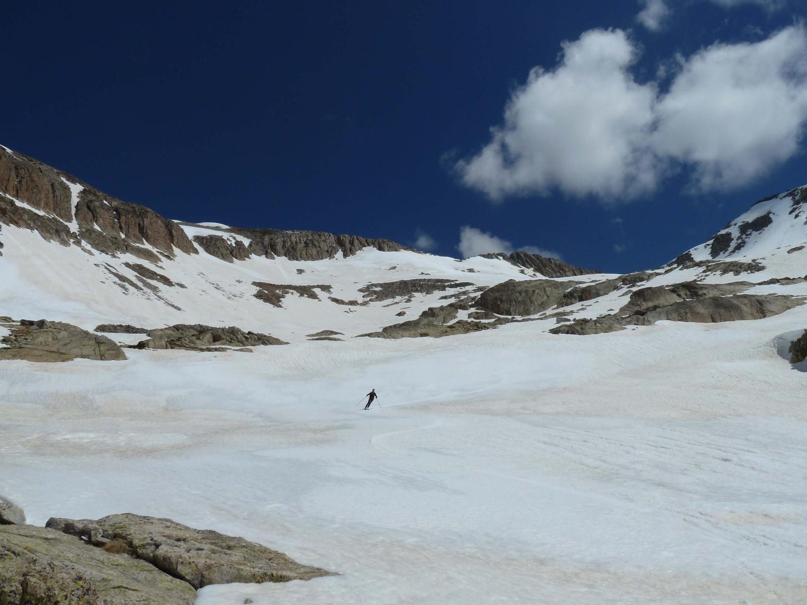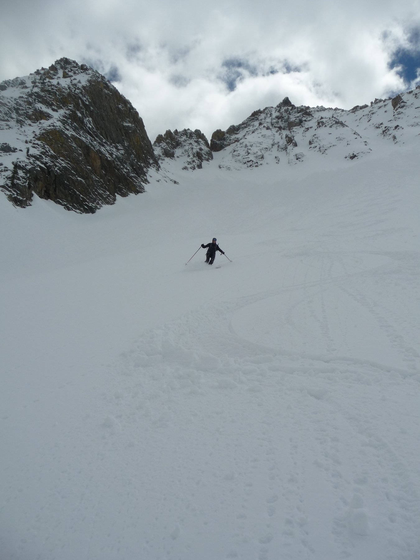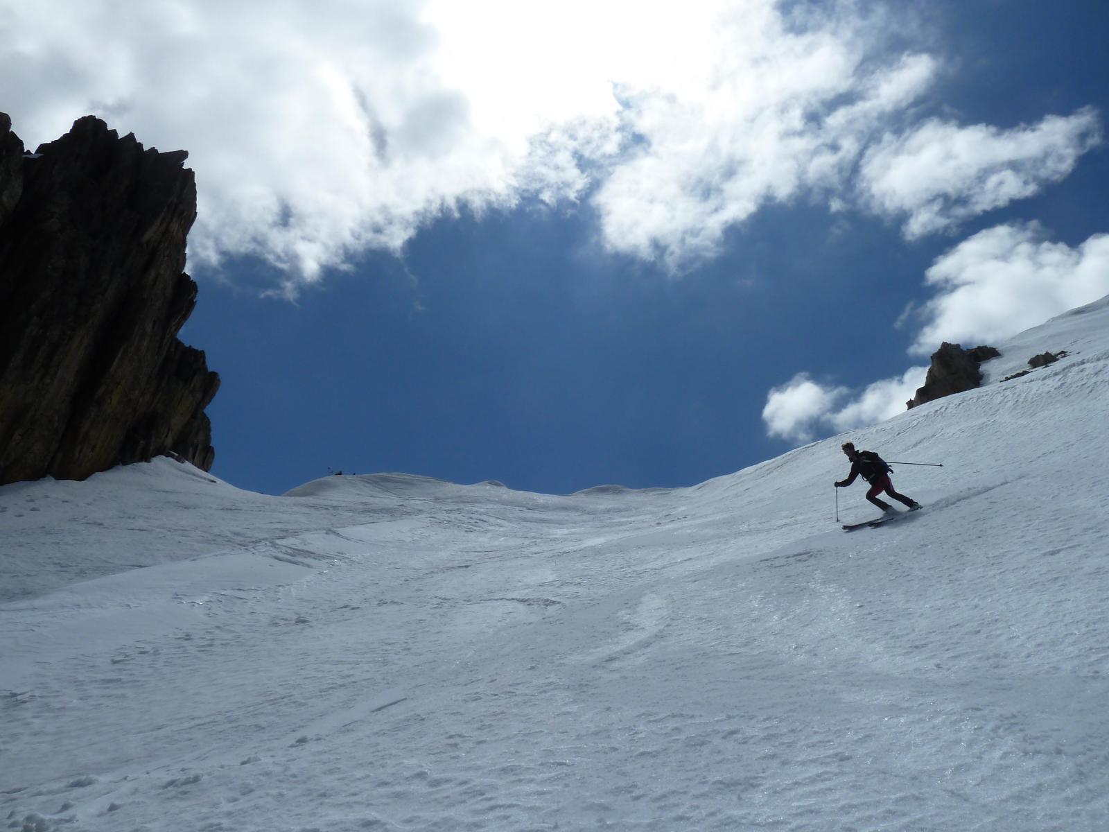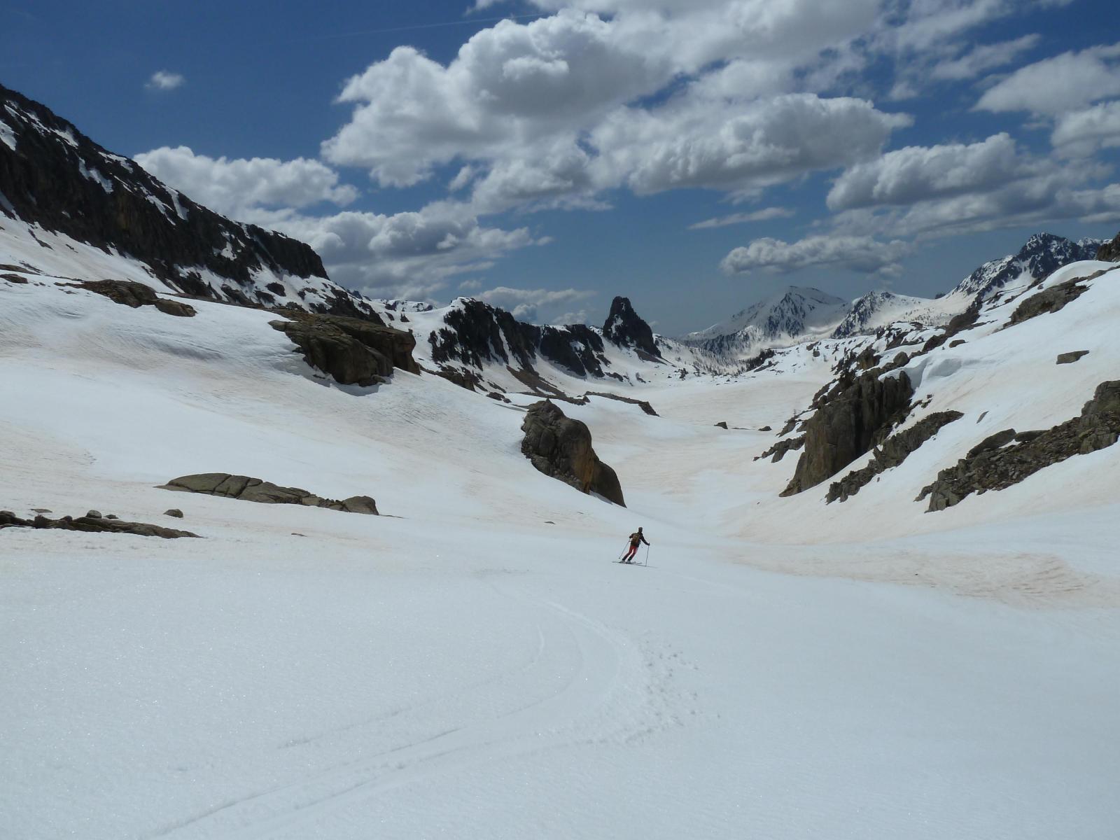 Scendere direttamente dalla vetta con gli sci in direzione del colle del Prefouns, che si raggiunge con una breve risalita di 80m circa di dislivello. Dal colle affrontare la stupenda discesa fino al piano del Valasco.