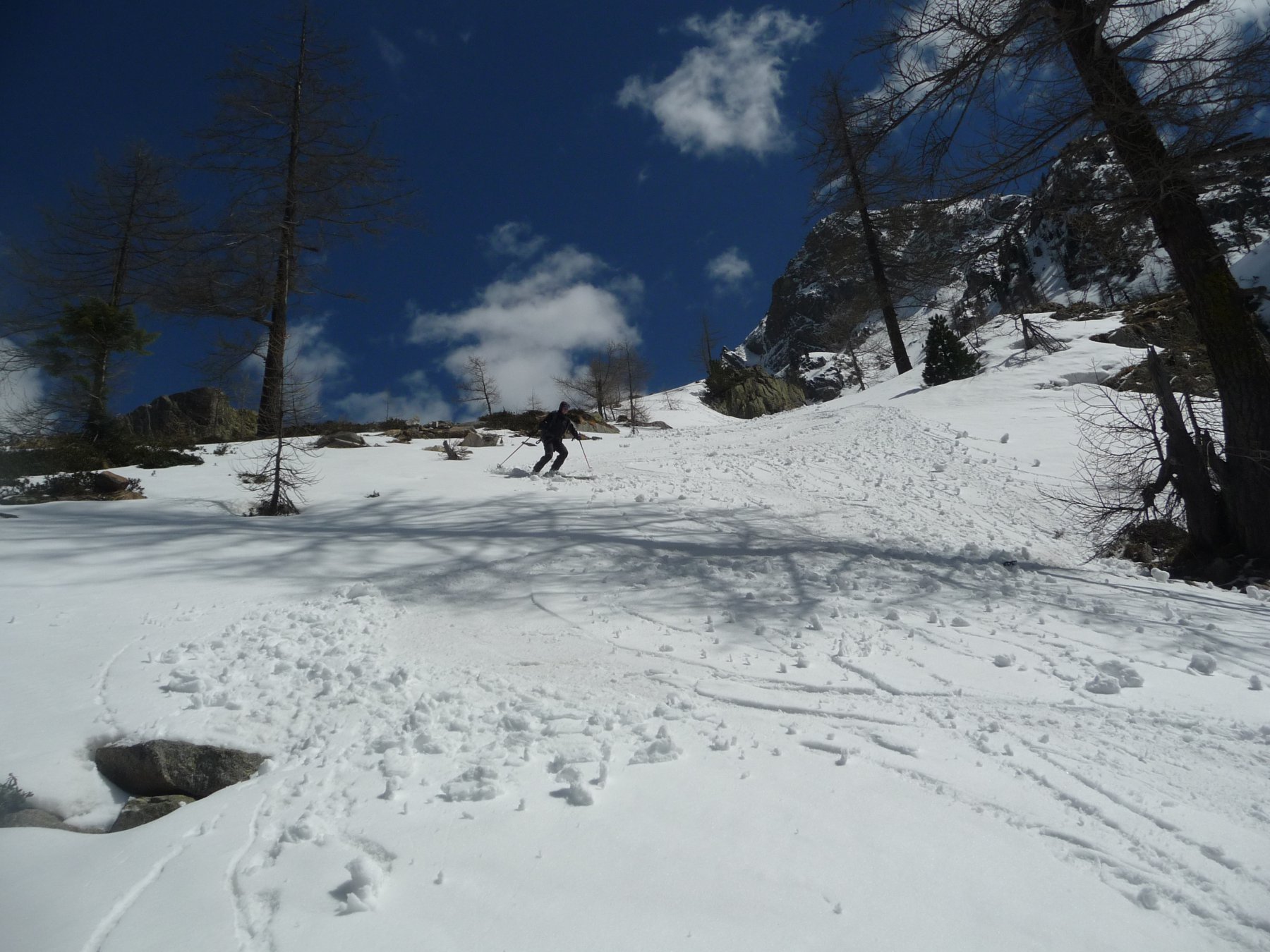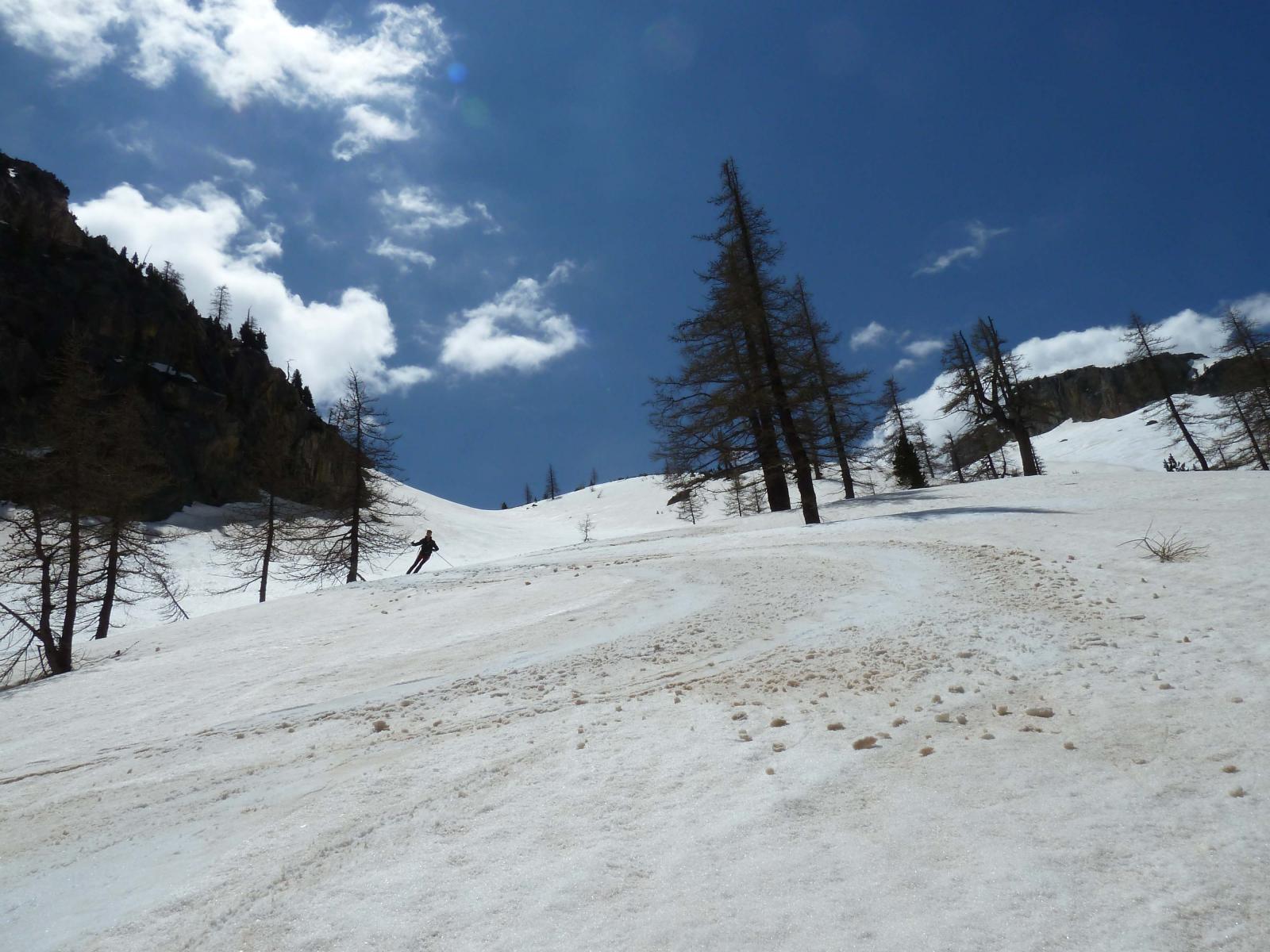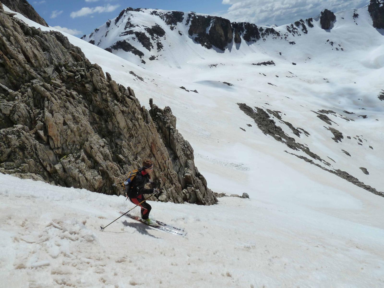 Scendere direttamente dalla vetta con gli sci in direzione del colle del Prefouns, che si raggiunge con una breve risalita di 80m circa di dislivello. Dal colle affrontare la stupenda discesa fino al piano del Valasco.