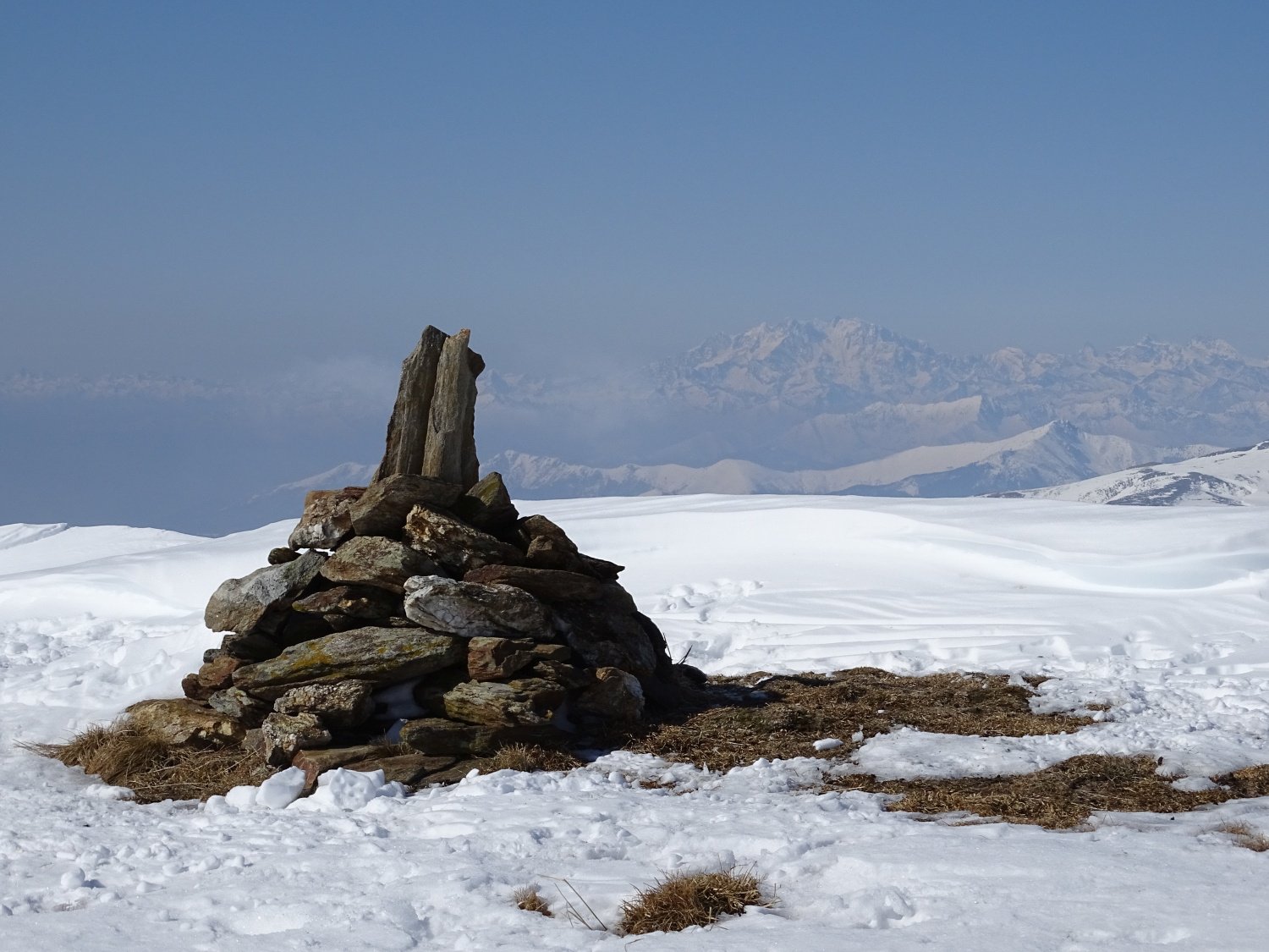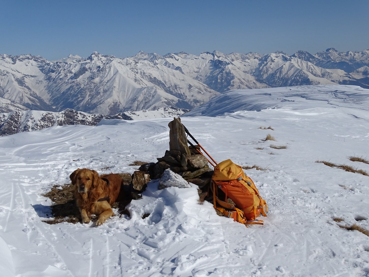 Neve abbondante in zona, niente male per essere la metà di marzo. Le racchette si possono calzare già poco dopo la partenza, qualche tratto scoperto all’inizio ma poi copertura continua oltre Ponte. Se devo essere sincero non ci ho capito molto di questo itinerario, segnavia non ce ne sono ed i vari alpeggi sono erroneamente nominati sulle carte o non lo sono proprio. Mi sono pertanto affidato all’ottima e portante traccia presente che mi ha condotto in vetta senza problemi. Neve un po’ collosa solo sulla rampa finale, per il resto soffice e farinosa, garanzia di una discesa rapida e divertente.