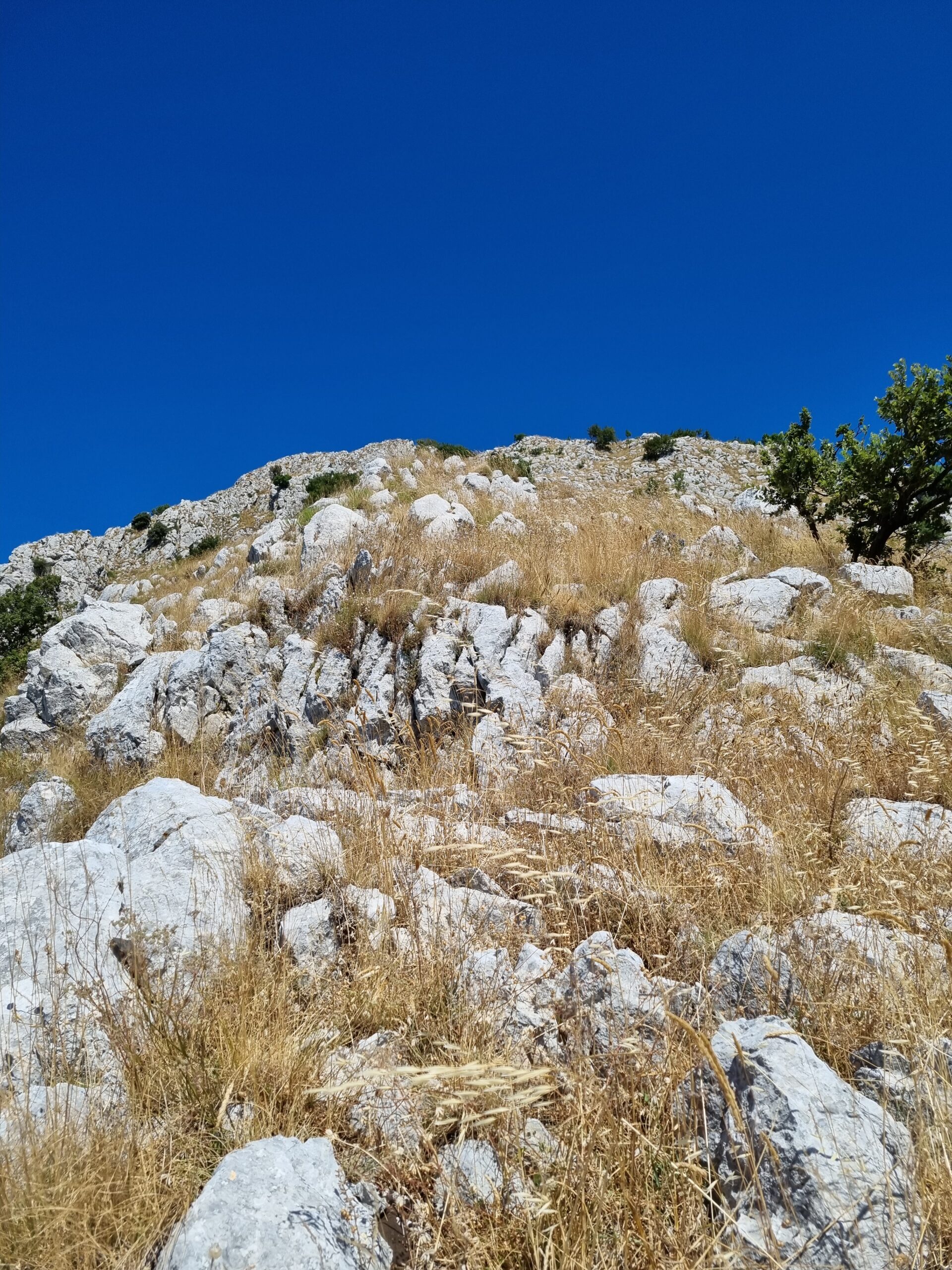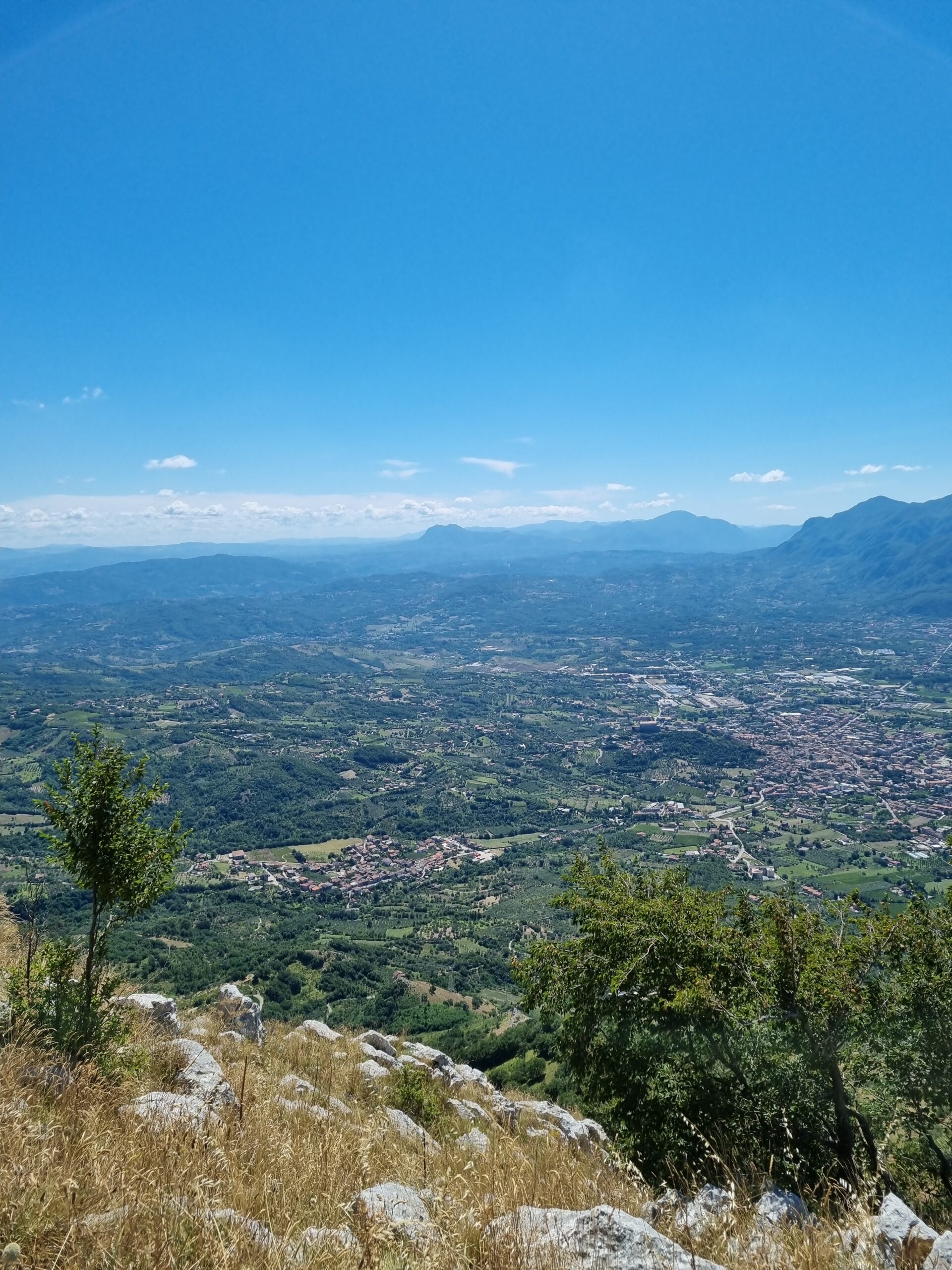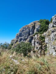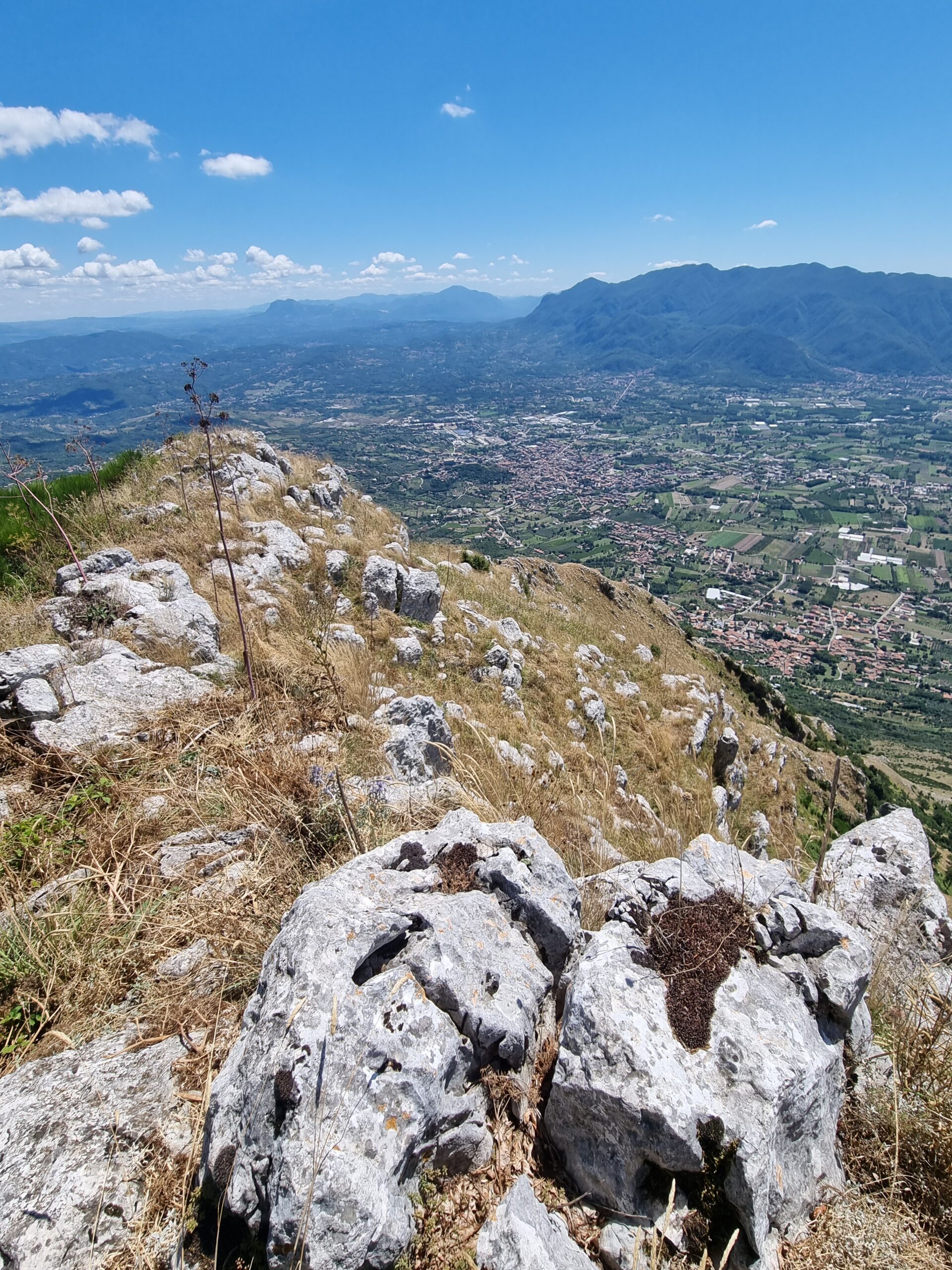 Si giunge alla prima radura dove è finalmente possibile camminare (e non arrampicarsi su roccia) e da cui appare ben visibile il successivo percorso in cresta, tutto su roccette e ancora con qualche passaggio su roccia. I segnavia a volte sono poco visibili per cui bisogna valutare bene i singoli passaggi su roccia. Questa prima fase (impegnativa) di salita culmina quando si iniziano ad intravedere gli alberi che ricoprono il versante Nord del Taburno.