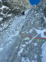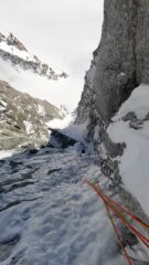 Il canale da tracciare ma con alcune vecchie peste ancora visibili e vi sono tutte le soste a fix tranne una che è saltata.