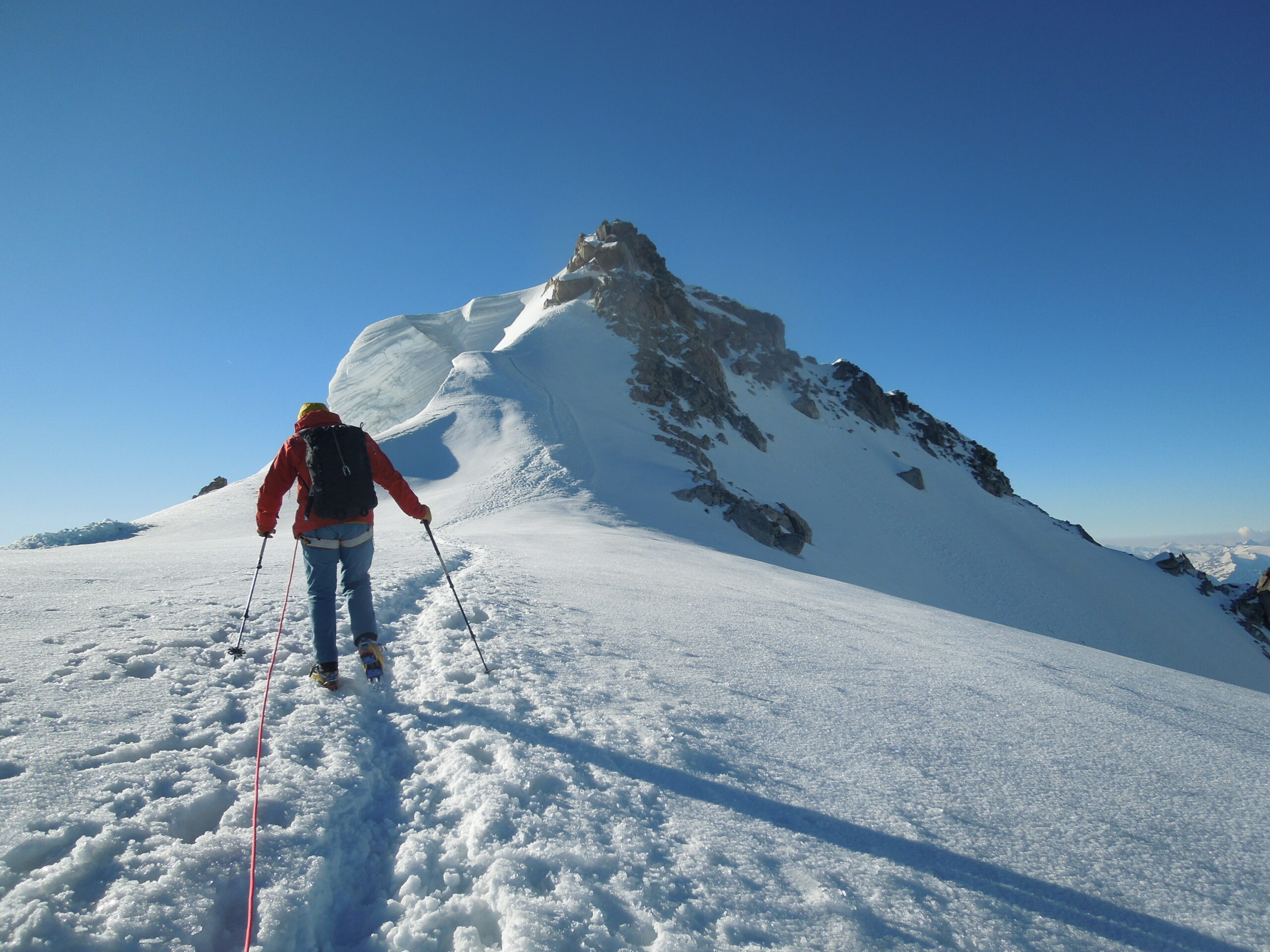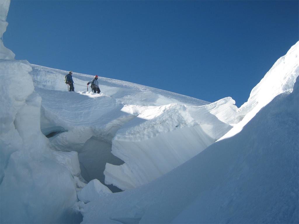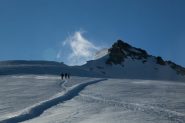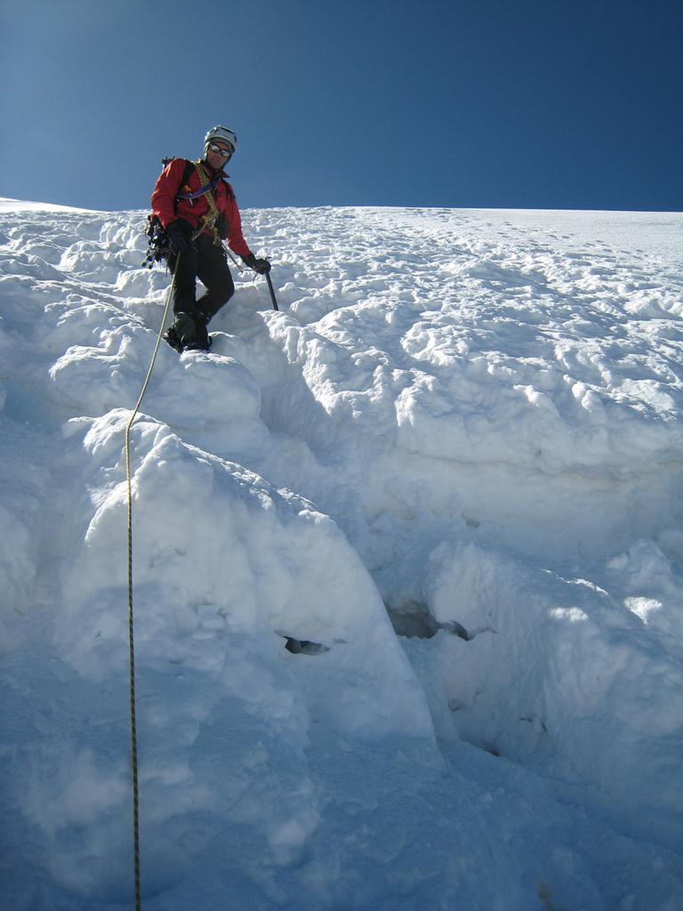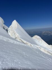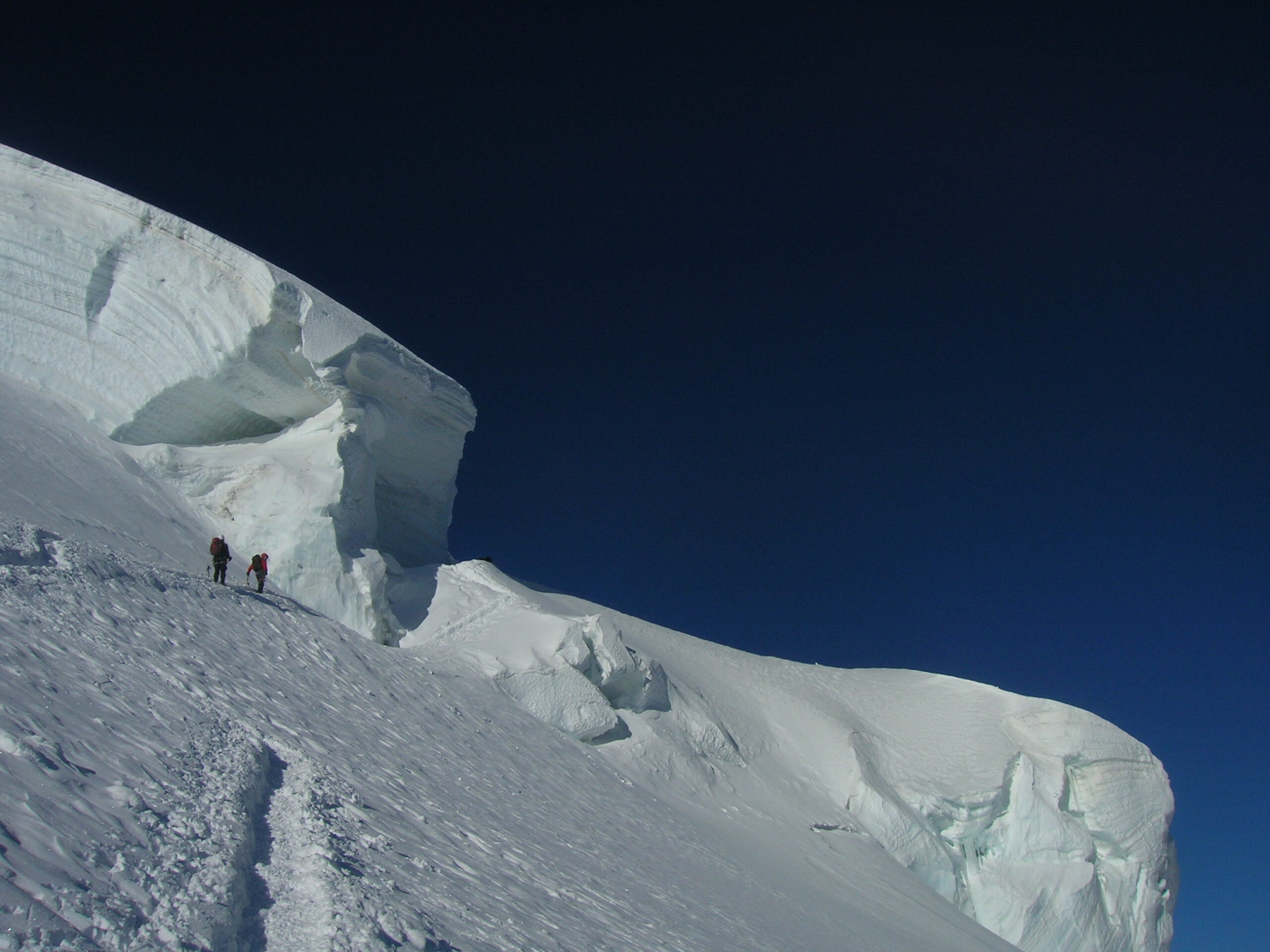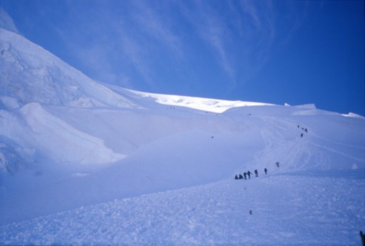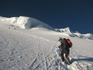 Di qui si risale interamente il pendio di fronte a voi cercando il modo migliore per superare i seracchi pensili ed i crepacci, fino a raggiungre la spalla nord che si segue facilmente fino in vetta.