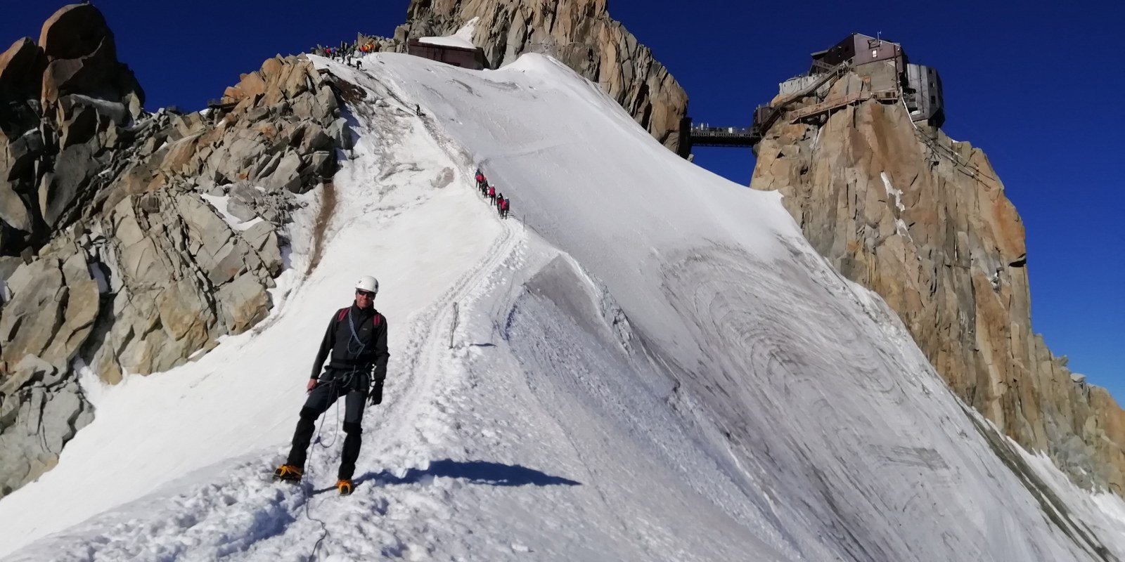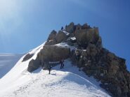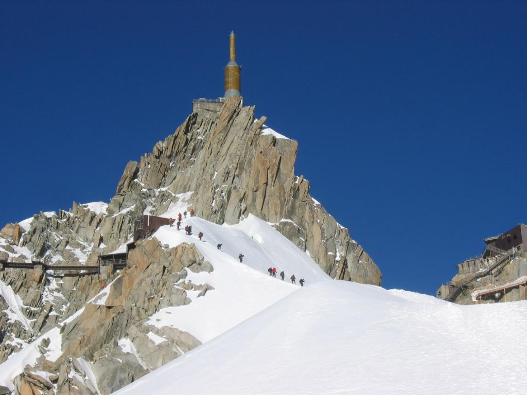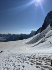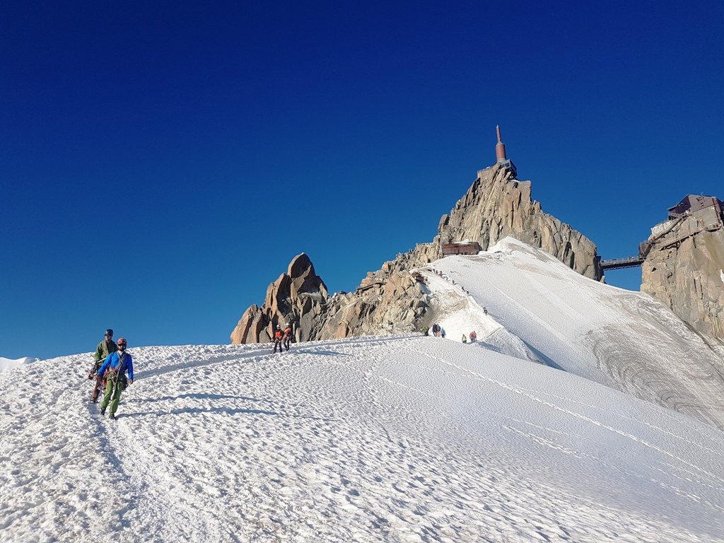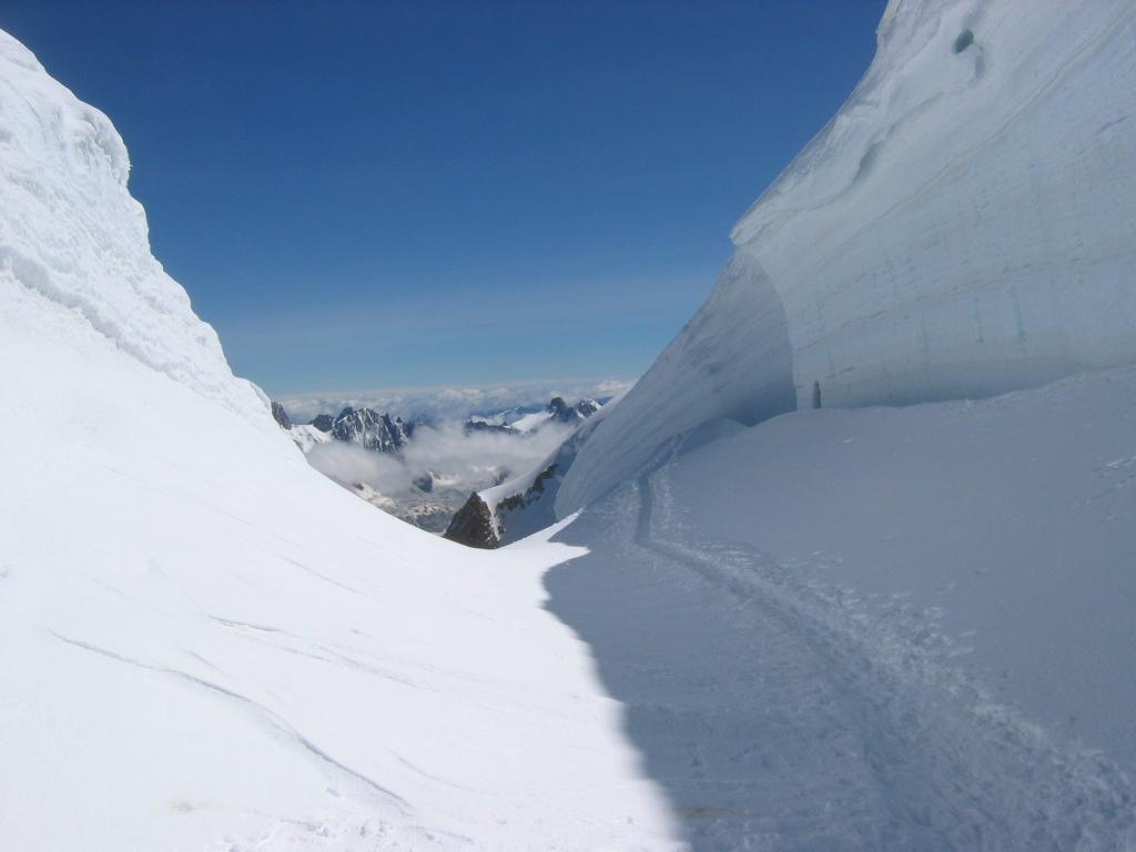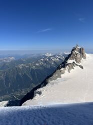 Dall’arrivo della stazione della funivia all’Aiguille du Midi si imbocca l’esile ed esposta cresta di neve che conduce al pianoro adiacente il col du Midi.