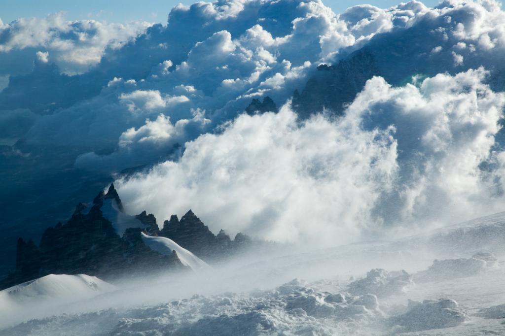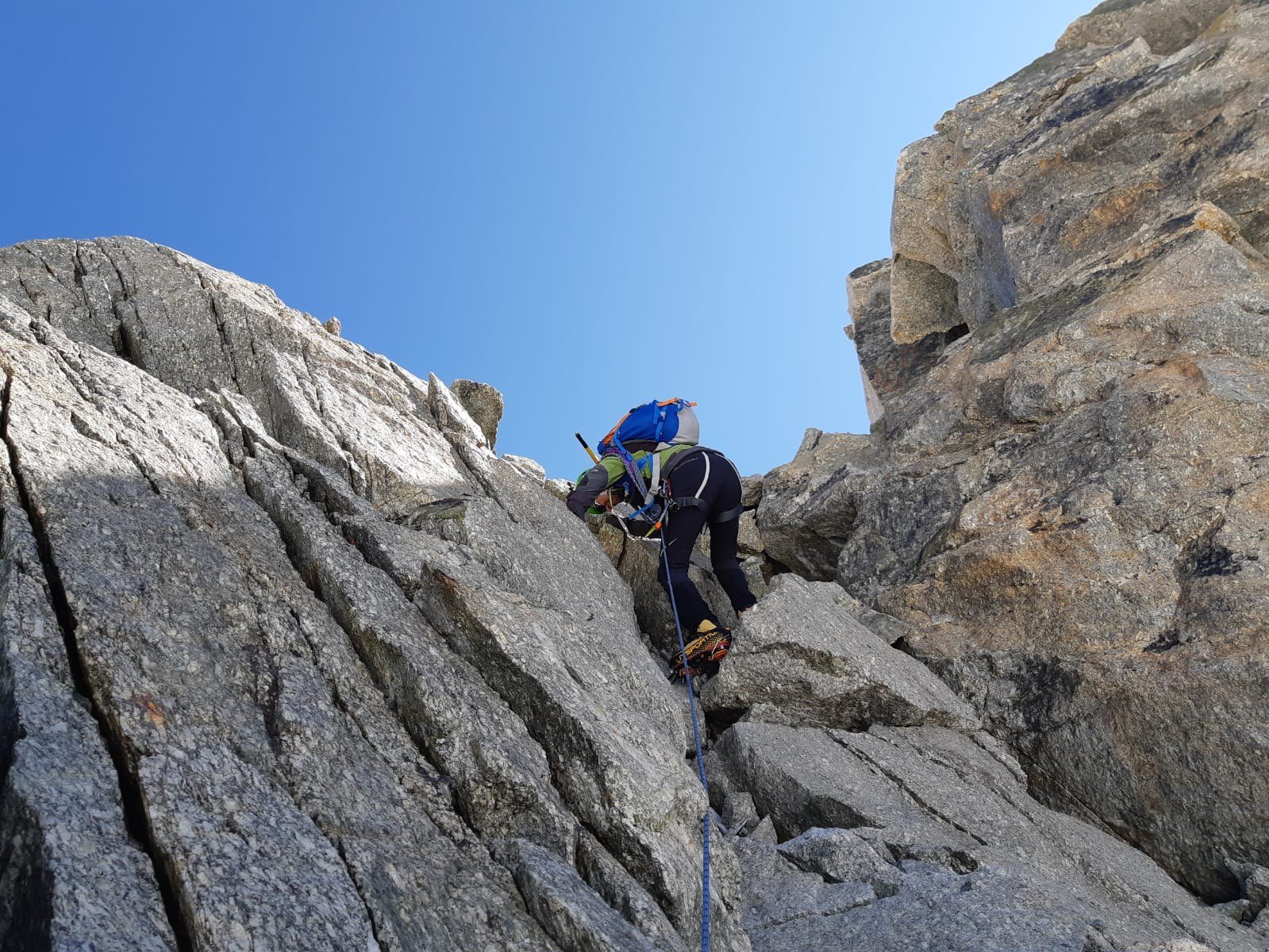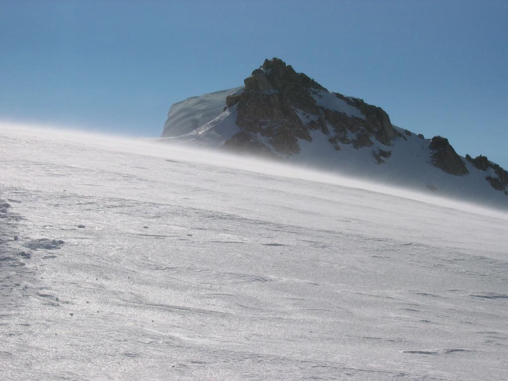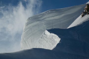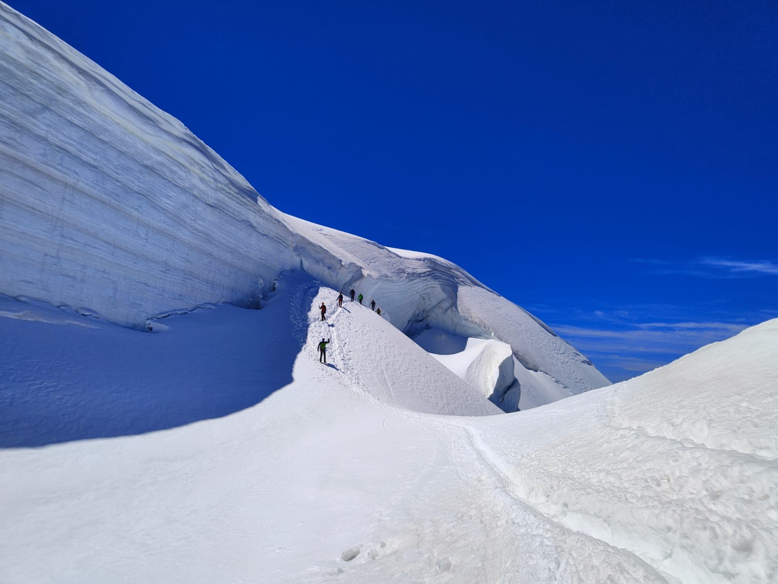 Dall’arrivo della stazione della funivia all’Aiguille du Midi si imbocca l’esile ed esposta cresta di neve che conduce al pianoro adiacente il col du Midi.