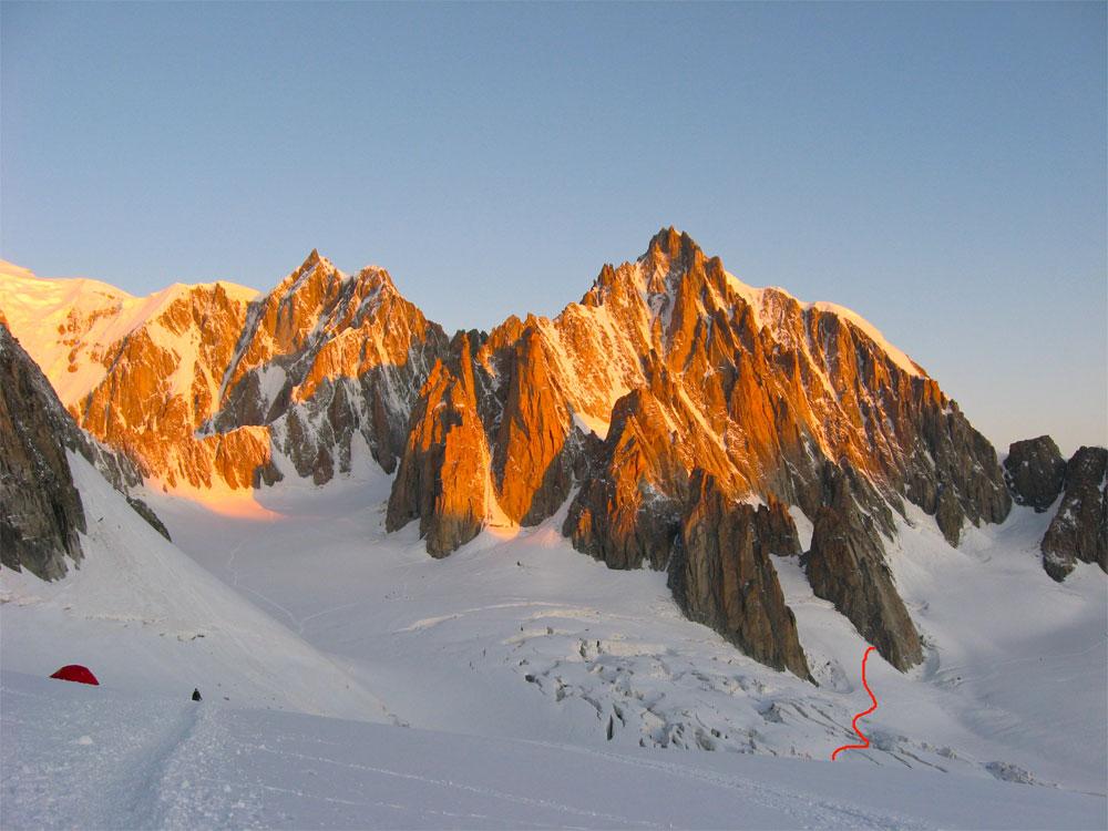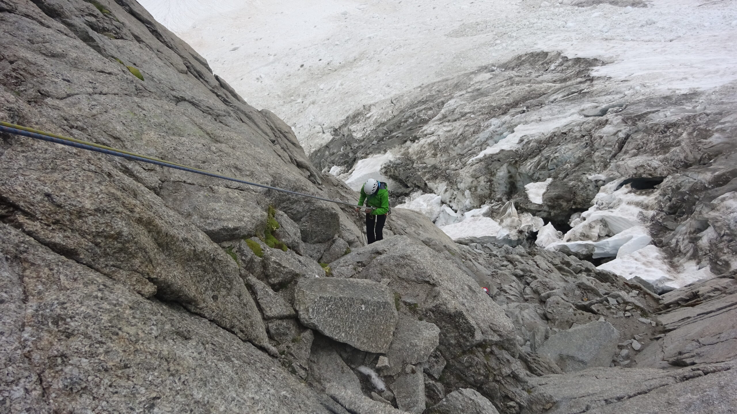 L’attacco è 30-40 m a monte dello sperone che s’infossa nel ghiacciaio, si sale su delle terrazze detritiche e si sale in diagonale verso destra.