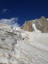 Dal rifugio Torino si raggiunge il col des Flambeaux, si scende nella vasta conca del Ghiacciaio del Gigante puntando in direzione della Pyramide.