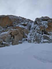 L0: pendio a 45/50 per raggiungere l’attacco vero e proprio, alternanza tra ghiaccio duro e neve. Cercare la sosta in mezzo alla goulotte, oggi sotto la neve (le soste a destra e sinistra sono scomode). Occhio alla terminale che ha già qualche buco nascosto dalla neve fresca.