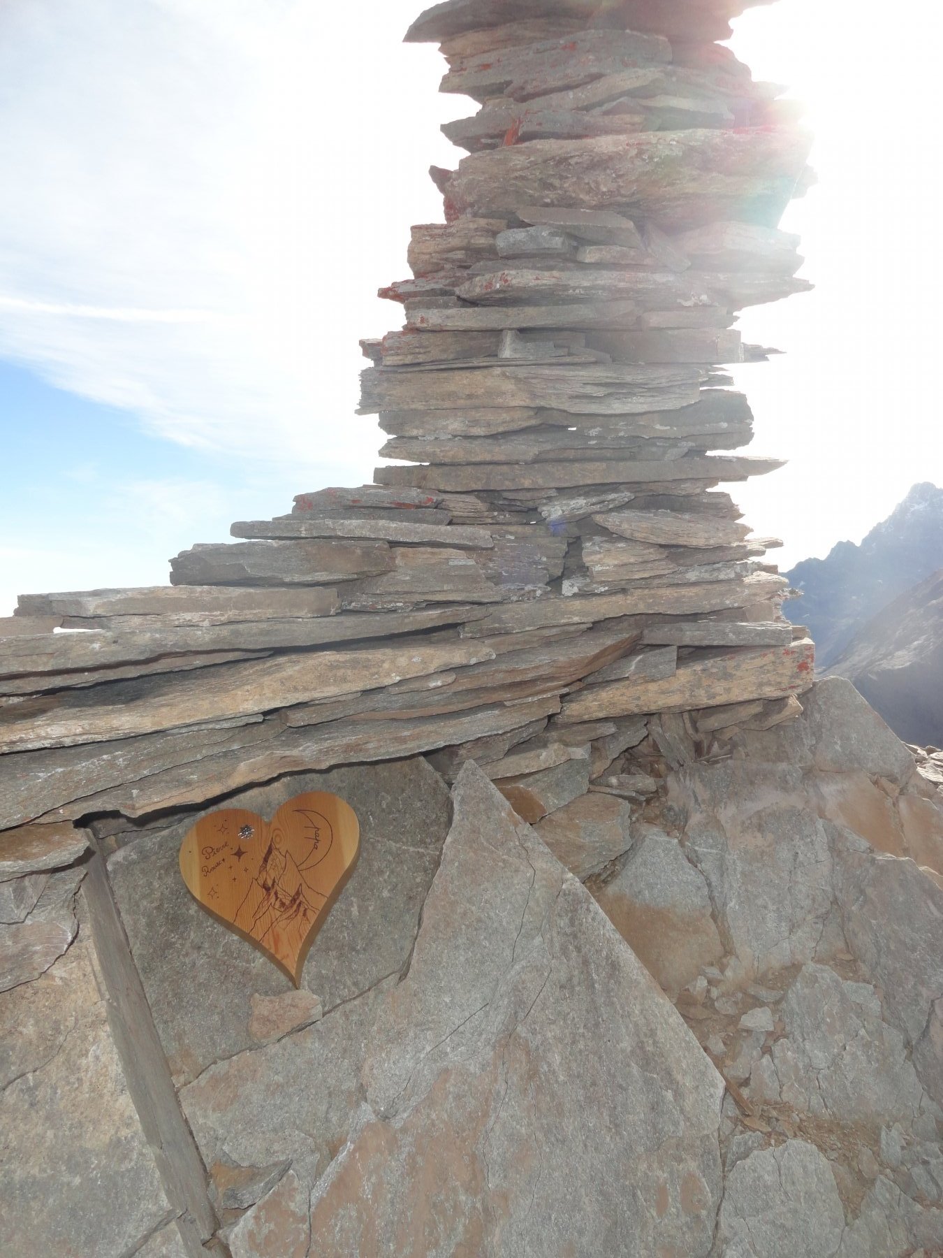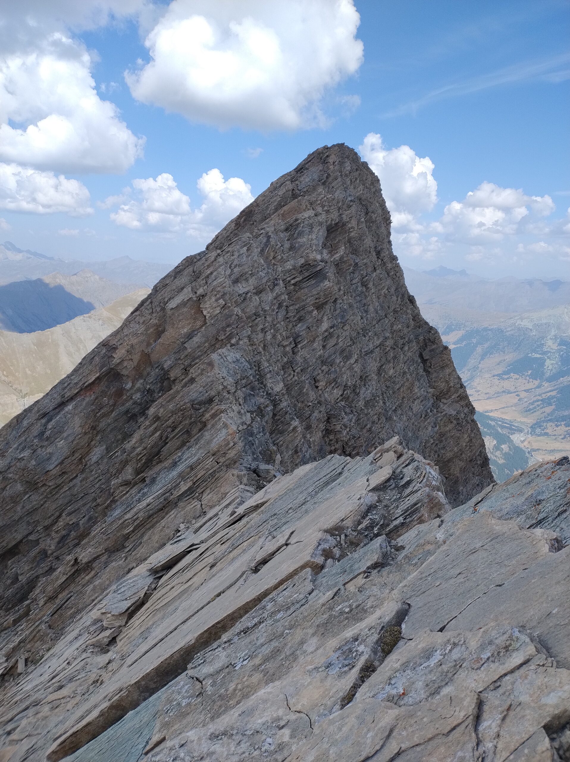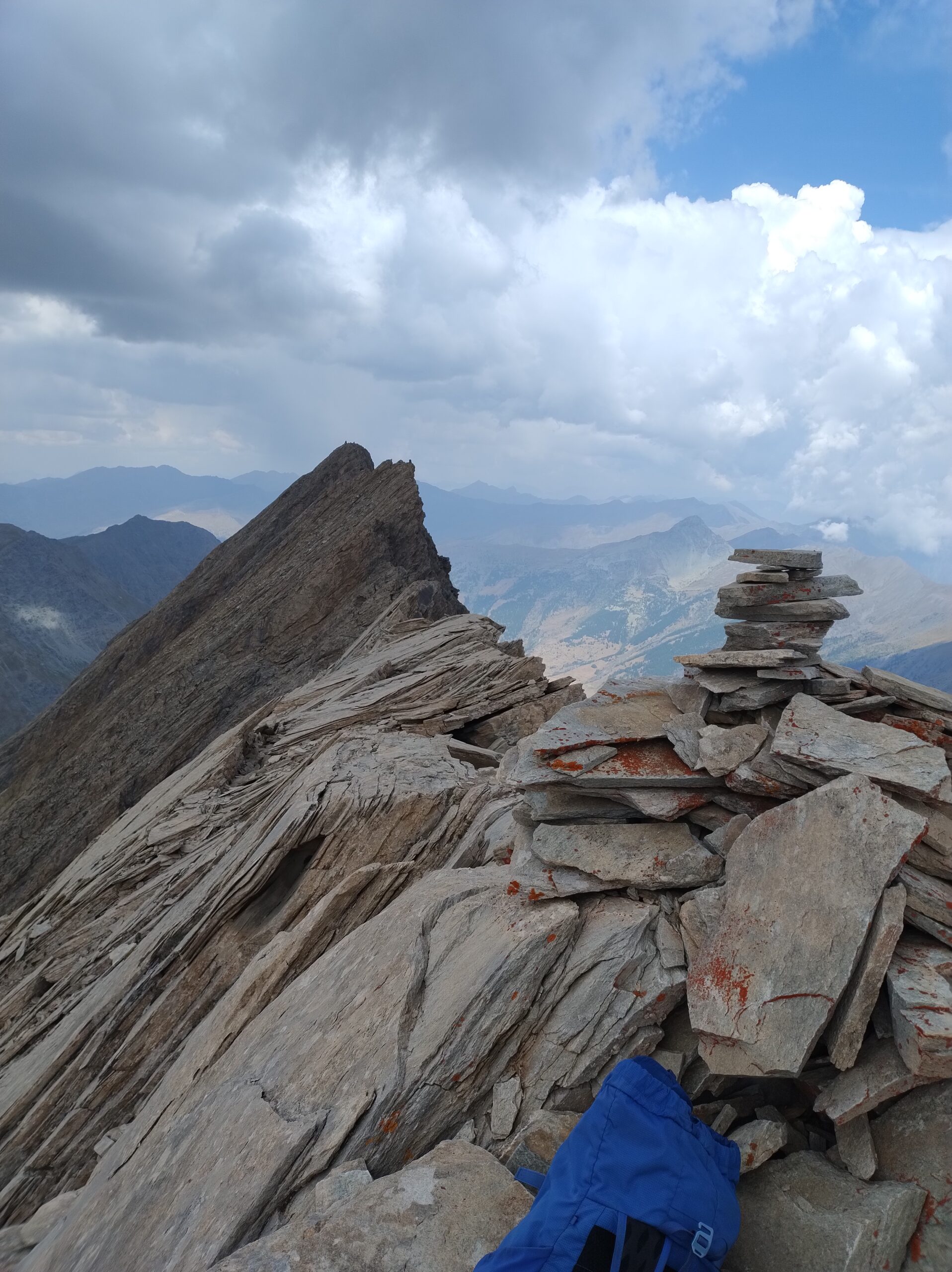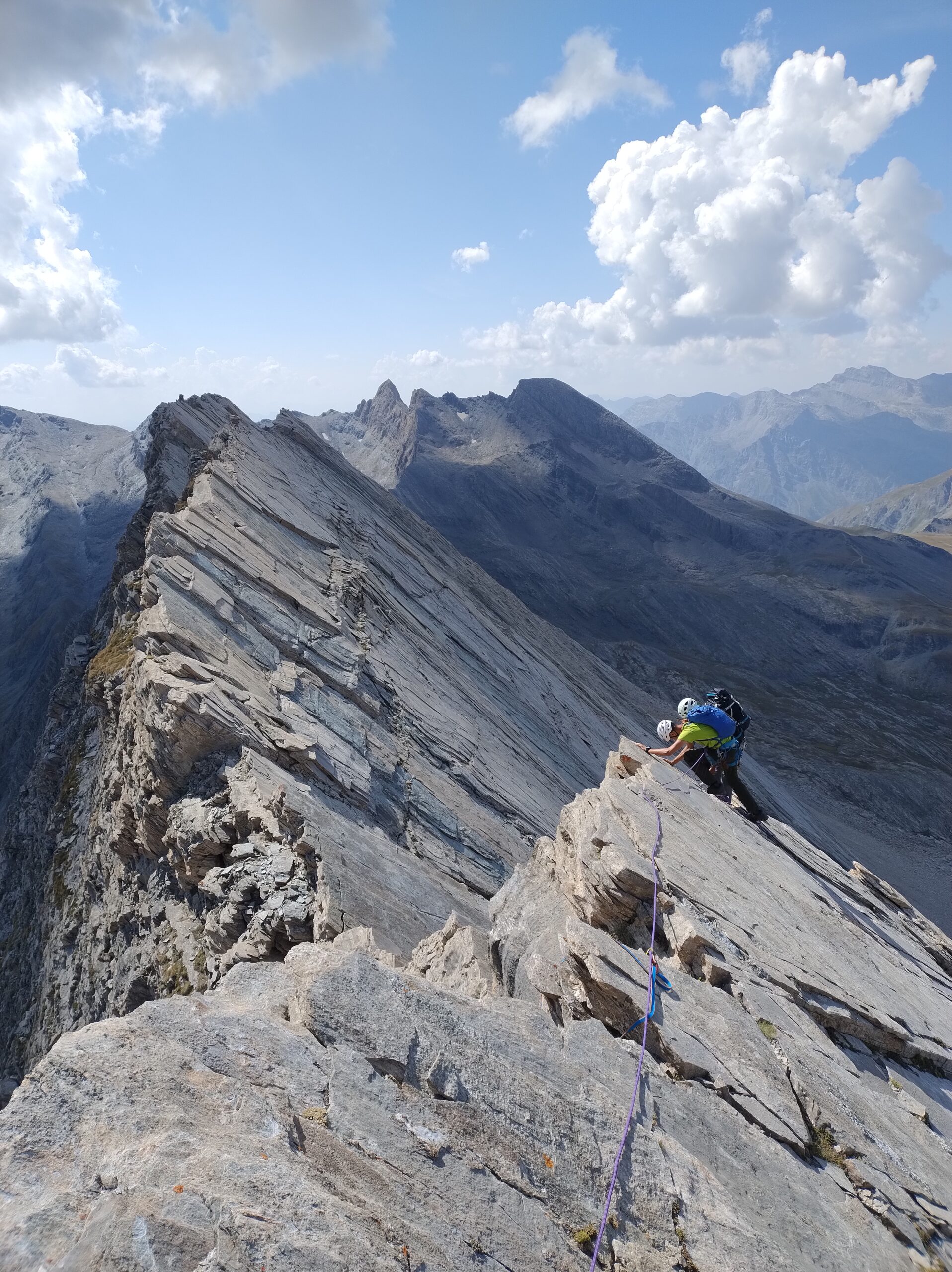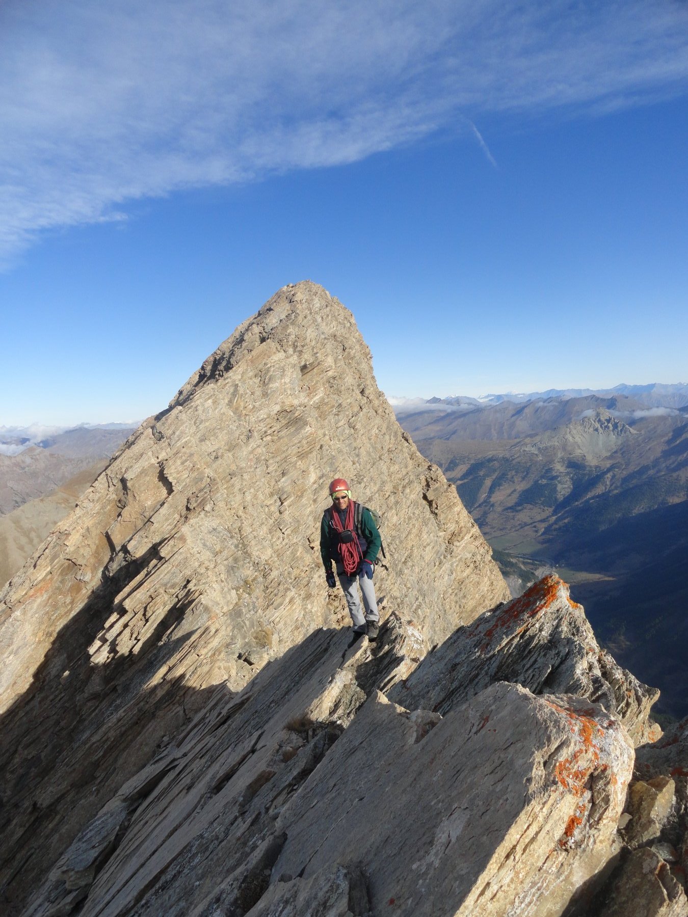 Giunti sul filo, dove questo diventa orizzontale, la roccia migliora. Segue un tratto molto affilato che conduce all’anticima Nord della cima centrale (grande ometto). Sotto il segnale si trova un chiodo utile per proteggere una breve calata o disarrampicata su roccia di nuovo decisamente delicata.