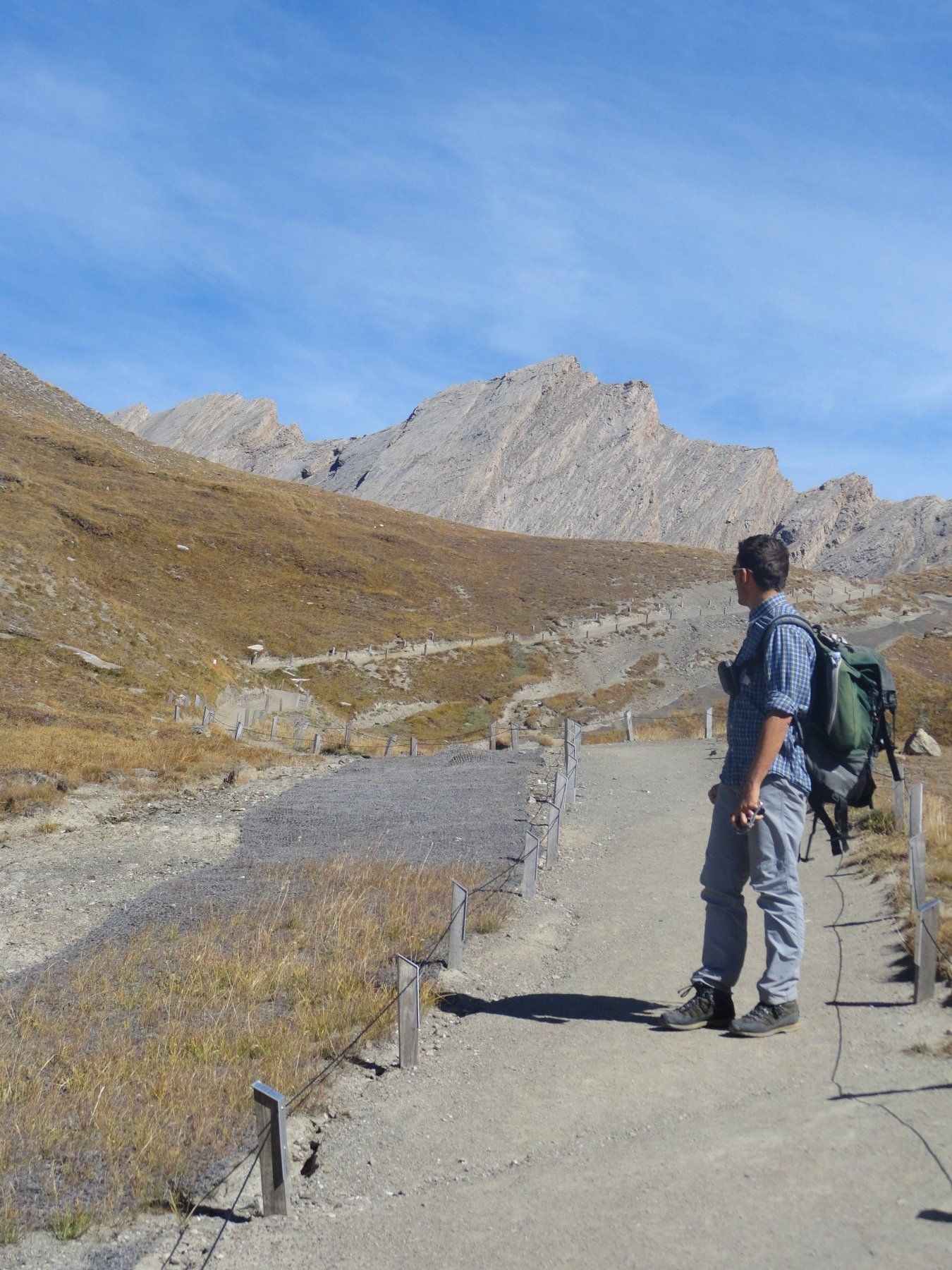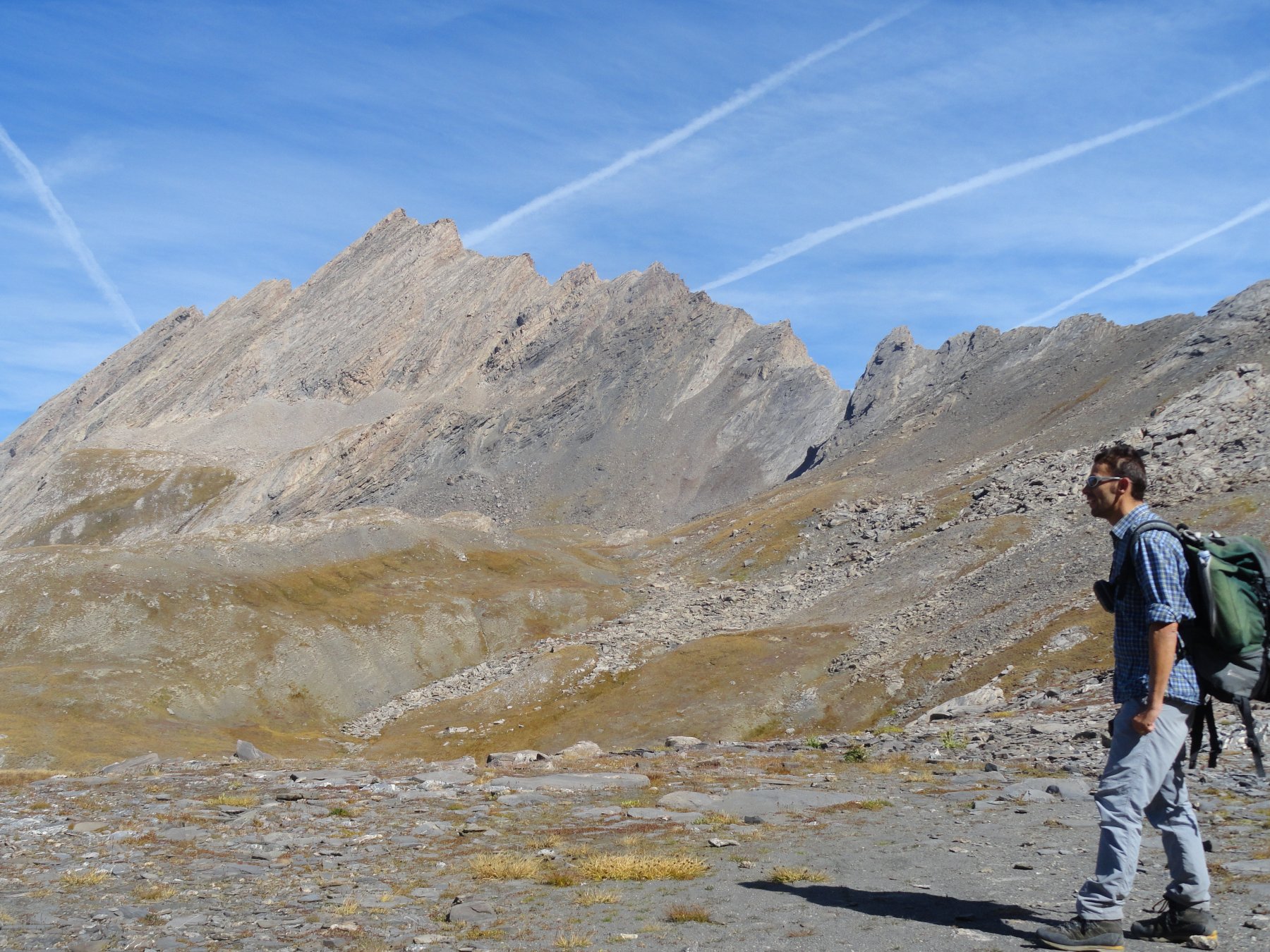 seguire tracce di sentiero che si insinuano fra le enormi placconate sul versante ovest (ometti, alcuni brevi passi di disarrampicata), puntando infine verso sx (SO) ad un evidente pianoro erboso. Da questo, si scende a fianco di un canale detritico sulla sx, oltre il quale in breve si può attraversare il vallone e raggiungere il sentiero che dal Col Vieux scende al Lac Foreant una cinquantina di metri sotto il valico. A ritroso si segue il percorso dell’andata fino al park.