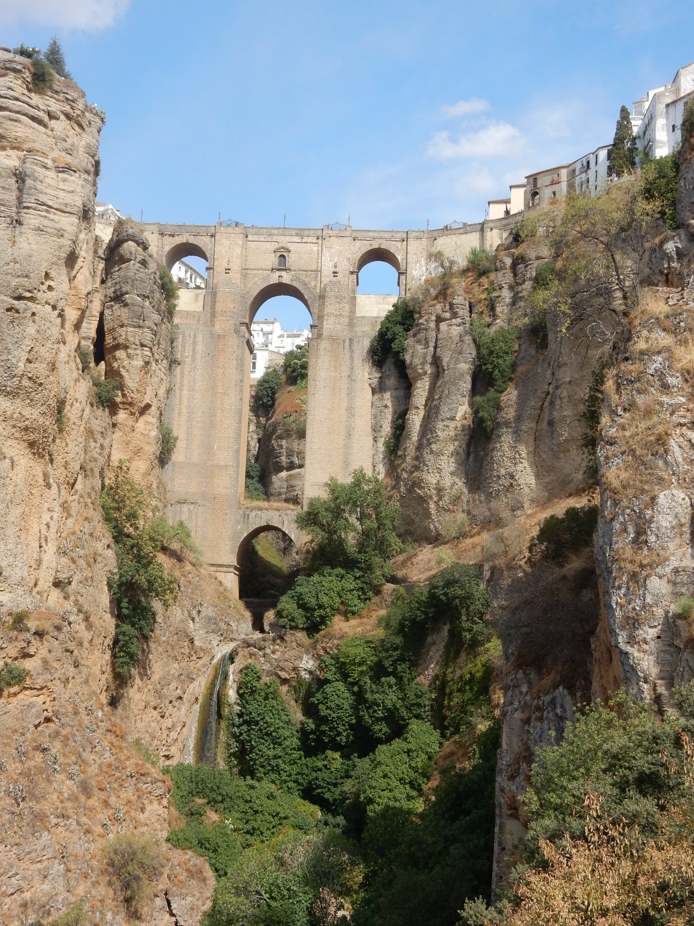 Questa deviazione ci porta prima in alto, ad incotrare la strada di ritorno, e poi scende nella gola attraversando alcuni archi in mattoni e costeggiando le mure della città vecchia. Entrati nel bosco troviamo alla nostra destra l'inizio della ferrata Tajo de Ronda II, lo superiamo e incotriamo i resti di un vecchio mulino diroccato dove un sentiero sentiero,in salita, ci porta ad aggirarlo e permette di entrarci dentro. Superiamo una prima camera, poi un piccolo ponticello in legno e vediamo l'attacco della ferrata.