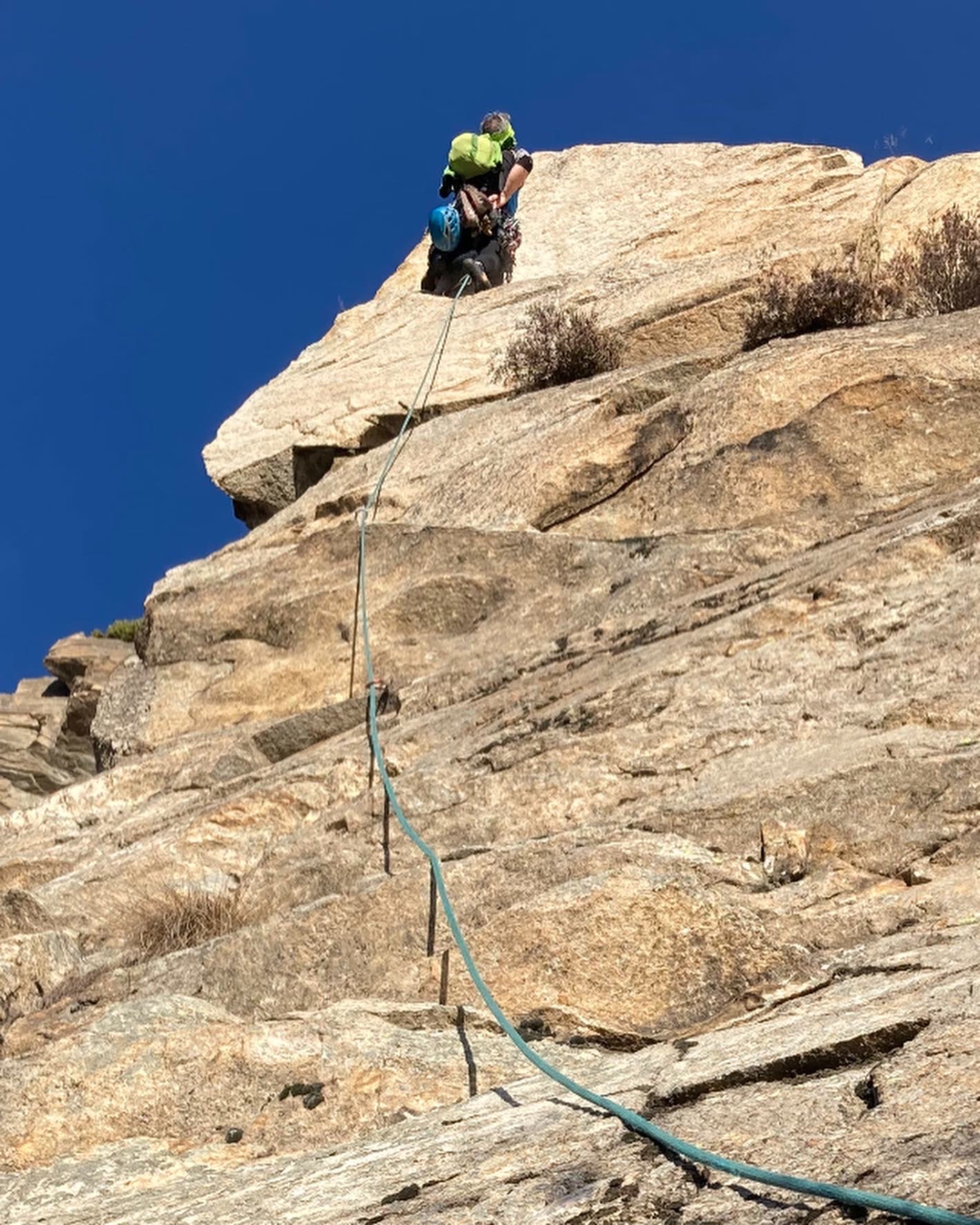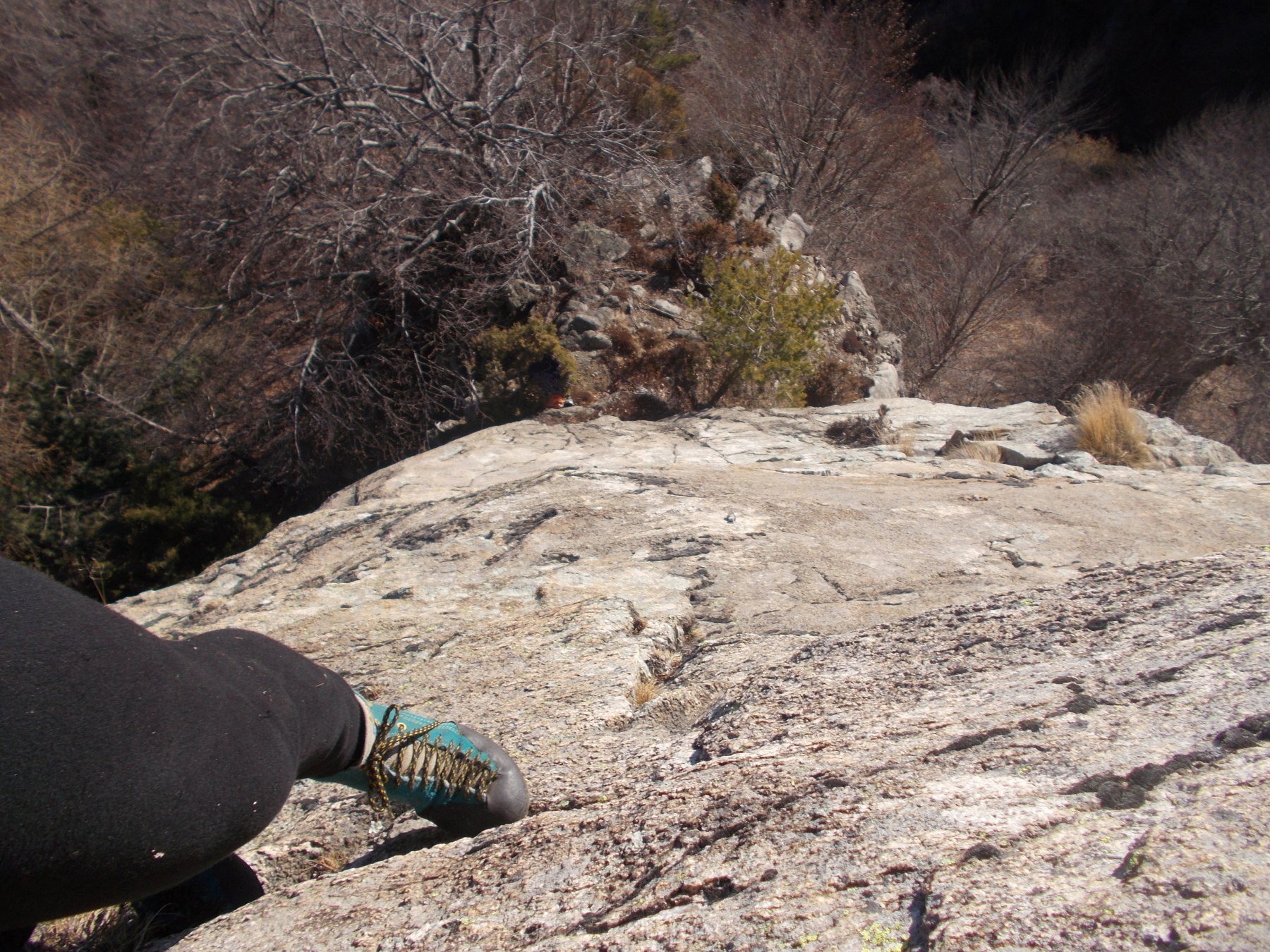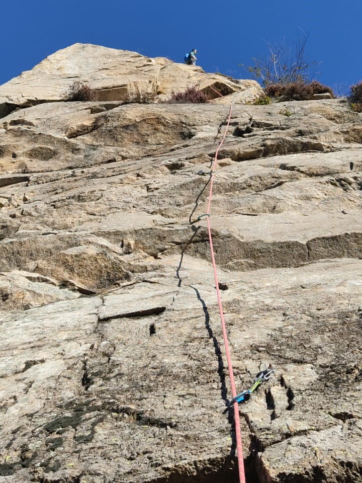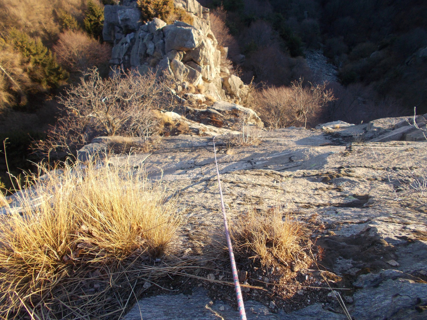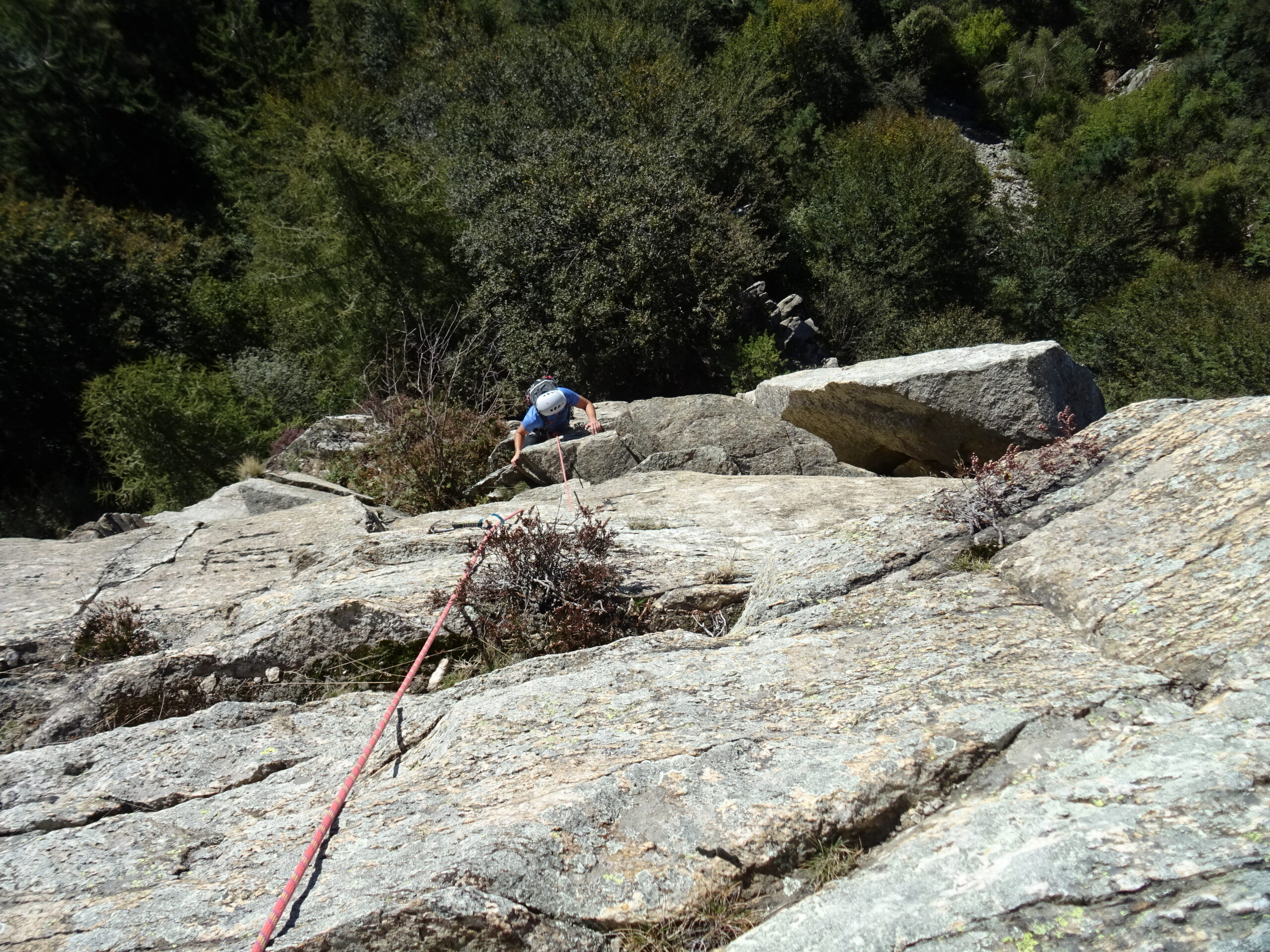 L2 bis: salire verticalmente in placca fino a sostare in cima al torrione. 40m, 5a