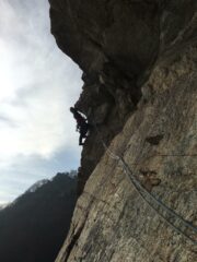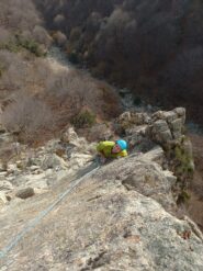 L2: salire verticalmente quindi dopo una placchetta ripida, deviare a sx lungo un ballatoio fino a reperire una sosta a fix. 20m, 5a