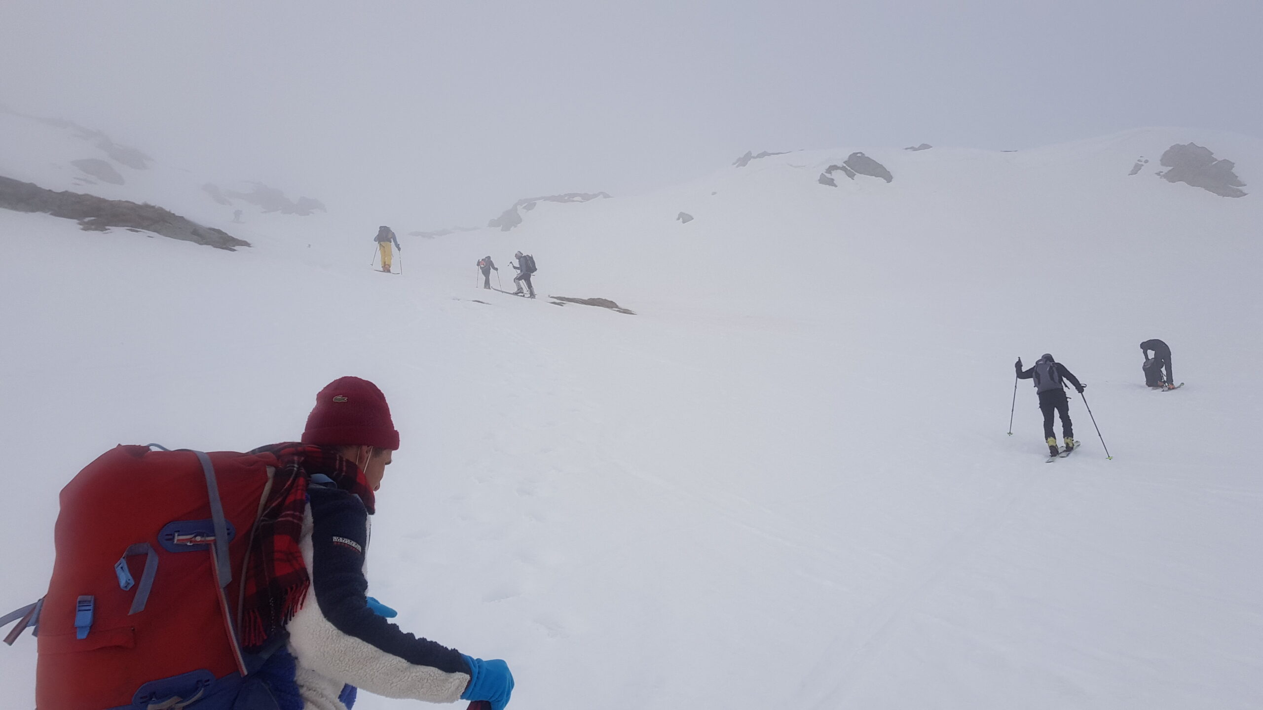 a Montespluga alle 8, zero gradi a già tante auto. Tanti vanno in Val Loga. Noi saliamo lunga la strada verso il passo sotto un cielo coperto, sicuri che dopo le 10 si aprirà (Fonte: Meteosuisse). Salita con i rampanti, utili in diversi passaggi, neve dura, nebbia. Seguiamo la traccia sempre evidente, il traverso è sicuro e infine usciamo dalla nebbia verso i 2.900mt. La salita in vetta è ben innevata e ben tracciata, il salto di roccia viene aggirato a sinistra in un passaggio esposto. Cima stretta per via della tanta neve. Discesa in sci mai bella: sastrugi e neve dura e irregolare in alto, crosta infida sotto (portante solo a tratti).