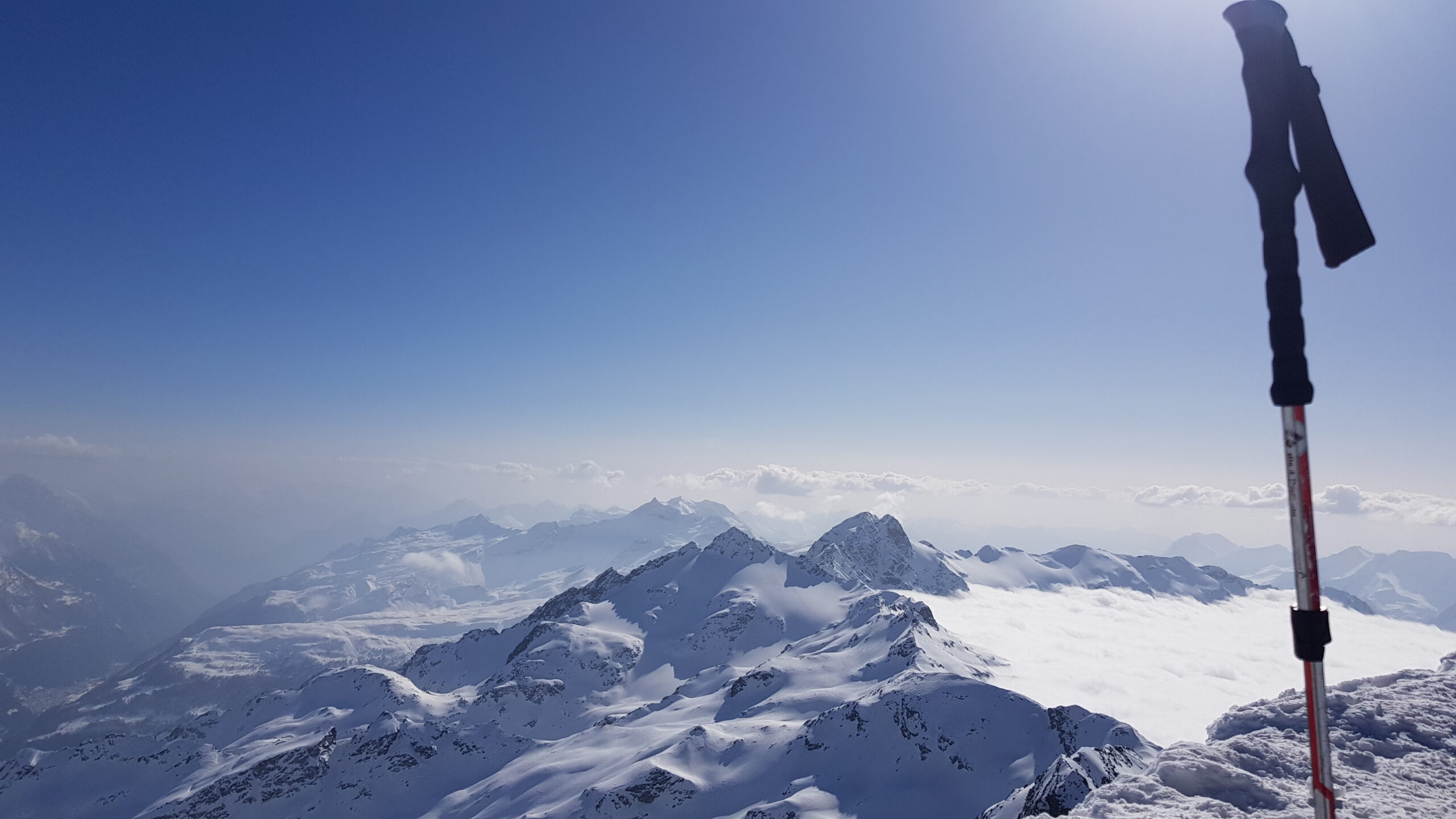 Un gitone dalle pendenze severe e dai vasti panorami, lungo e completo. Bucare la nebbia e trovare il cielo blu è stata una bellissima sorpresa e ha creato una scenografia unica. La salita in vetta richiede esperienza in un paio di passaggi ma è in condizioni perfette. Gruppo di dodici, sette in vetta, tanta soddisfazione. Valutazione 3/5 per via della discesa deludente, la salita merita un 5/5. L’affidabilità di Meteosuisse (al top fino all’anno scorso) è crollata quest’anno: è già la terza volta che sbaglia la previsione a 24 ore.