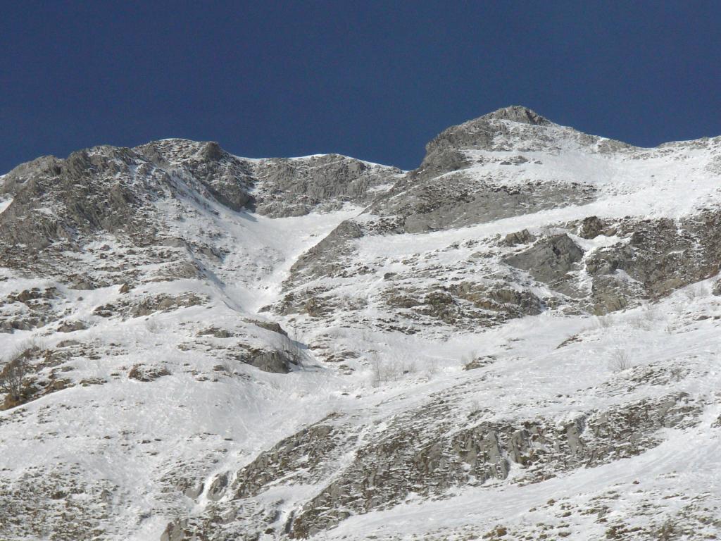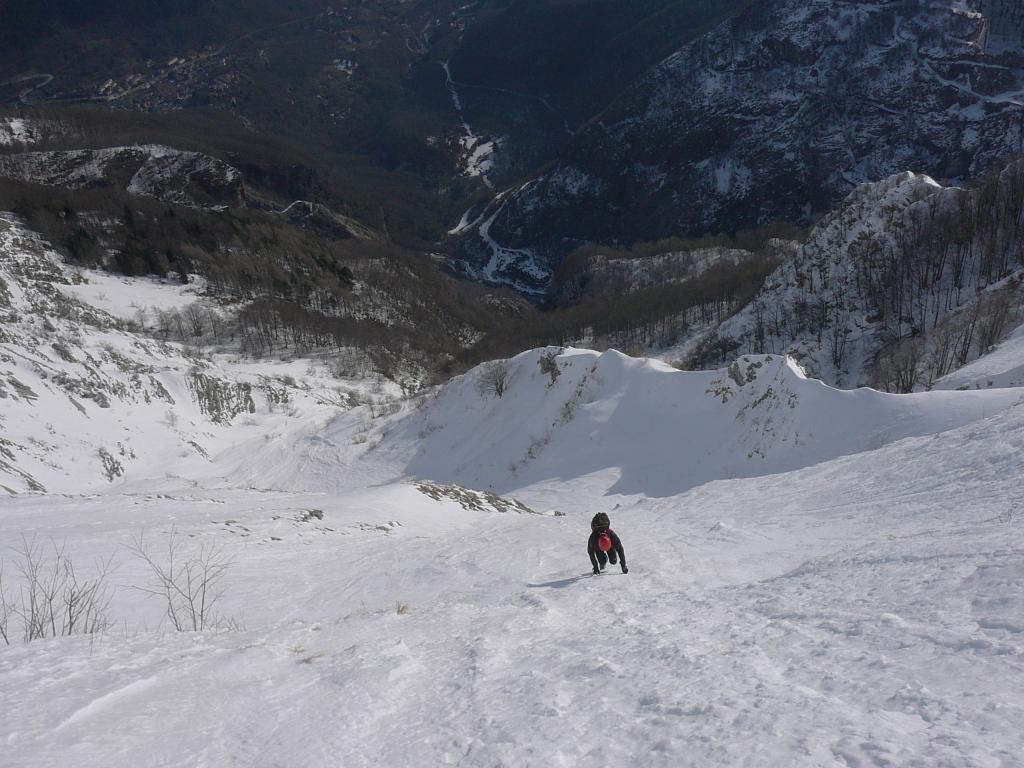 Si risale l’ampio pendio-canale, spazzato dalle slavine (40°), fino alla base di una fascia più ripida (rocce e paleo affioranti con poco innevamento). La si supera nel punto più conveniente (passaggi a 60°) e si prosegue sui pendii superiori, ora un po’ più sostenuti (50-55°). Il canale qui diventa appena accennato; si sale in leggera diagonale a destra, puntando all’ingresso dell’evidentissimo imbuto sommitale. Un tratto di canale più marcato (50°) permette di raggiungerlo; vi si entra con un altro passaggio ripido (60°). Si rimonta l’imbuto nevoso (50°) fino a raggiungere la breve fascia di rocce che sostengono la cresta sommitale. Questa può essere superata sulla sinistra (dove è più alta e ripida; in condizioni particolarmente favorevoli si può trovare una colata di ghiaccio che ricopre le rocce), al centro (passaggio di misto più breve e facile) o più a destra (neve, ancora più facile). Si esce così sulla cresta Nordest della Tambura.