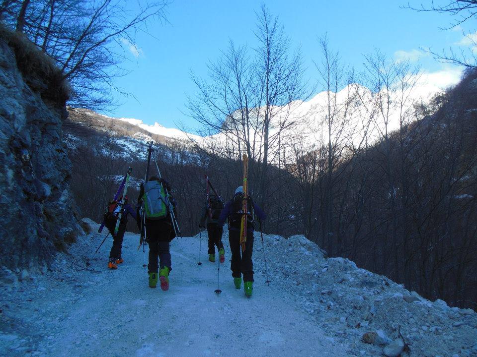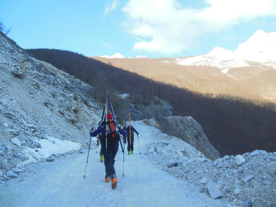 Indicazioni utili: dopo la galleria, mantenendosi a sx al bivio della sterrata, si arriva alla prima cava, che si contorna in senso orario. Si arriva così a due cisterne dell’acqua, dietro le quali comincia la salita nel bosco. Dopo circa 300m di dislivello, quando il bosco diventa assai ripido e contornato da salti rocciosi, conviene attraversare a sx e reperire un canale nevoso ripido, ma non impegnativo, che conduce nella parte alta del percorso (segno CAI su di un albero). Come segni di riconoscimento del percorso ora si tiene un primo grosso albero secco (solo il tronco) e successivamente un grosso albero isolato, oltre al quale si comincia il grande traverso ascendente verso dx e quindi verso la vetta.